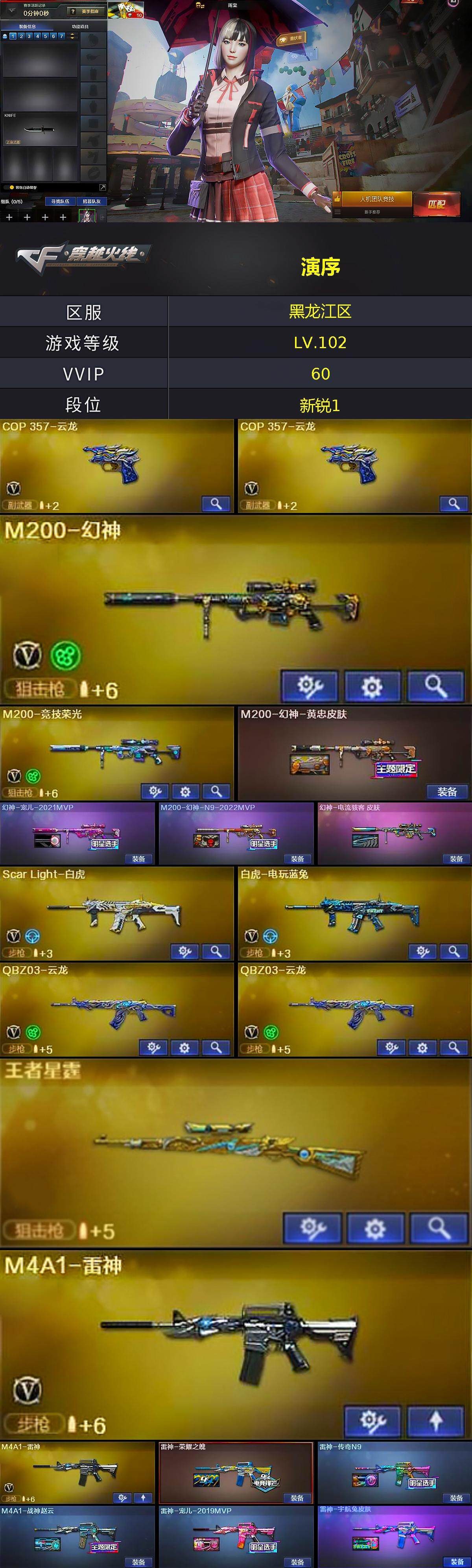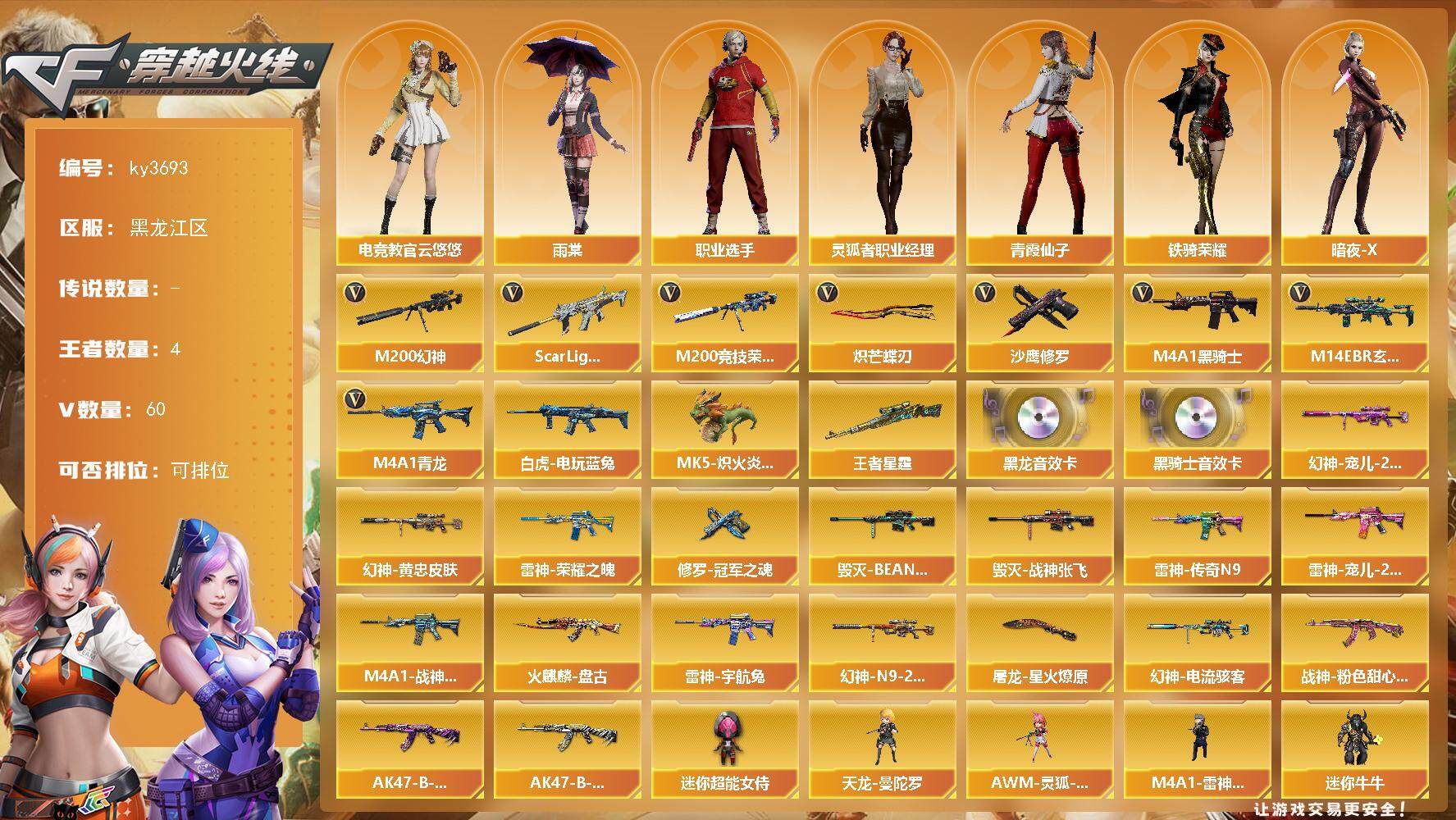 [13949520]黑龙江区-60V-4王者-0炫金 【热门武器】:M14EBR-玄武,Scar Light-白虎,M4A1-青龙,M200-幻神,M200-竞技荣光,白虎-电玩蓝兔,M4A1-黑骑士,MK5-炽火炎龙,沙鹰-修罗*2,炽芒蝶刃 【王者炫金武器】:王者星霆 【音效卡】:M4A1-黑龙音效卡,M4A1-黑骑士音效卡 【皮肤】:M200-幻神-黄忠皮肤,幻神-宠儿-2021MVP,M200-幻神-N9-2022MVP,幻神-电流骇客 皮肤,雷神-荣耀之魄,雷神-传奇N9,M4A1-战神赵云,雷神-宠儿-2019MVP,雷神-宇航兔皮肤,火麒麟-盘古,毁灭-战神张飞,毁灭-BEAN-2020MVP,战神-粉色甜心皮肤,AK47-B-常胜将军-曹操,AK47-B-常胜将军-刘备,修罗-冠军之魂*2,屠龙-星火燎原 【角色】:雨棠,电竞教官-云悠悠,暗夜-X,初恋灵狐,芳心审判者,飞虎队-X,风暴女*2,虎妞,嘉年华灵狐,灵狐者-X,灵狐者-职业经理,龙儿-小淘气,潘多拉-X,潘多拉-甜心教官,青霞仙子,铁骑荣耀,兔囡囡,雪莉杨-摸金校尉,游珑儿,职业选手 【人偶武器】:天龙-曼陀罗,M4A1-雷神-精英刀锋,MK5-炽火炎龙,AWM-灵狐-15周年嘉年华,迷你牛牛,迷你超能女侍 【英雄级武器】:AK47-火麒麟,M4A1-雷神*2,M4A1-黑骑士,M4A1-青龙,Scar Light-白虎,M14EBR-玄武,QBZ03-云龙*2,黑武士-锦绣游龙,AK-47-猩红传说,AK47-B-常胜将军,白虎-电玩蓝兔,Barrett-毁灭,Barrett-极光,M200-幻神,M200-竞技荣光,王者之怒-觉醒版,王者之力-觉醒版,沙鹰-修罗*2,沙鹰-天神*2,COP 357-云龙*2,王者之灵-觉醒版,屠龙,擎天,擎天-竞技荣光,炽芒蝶刃,斩神刀-雷暴,高爆手雷-雷霆*2,高爆手雷-雷暴,高爆手雷-竞技荣光,高爆手雷-云龙*3,闪光弹-雷霆*2,闪光弹-雷暴,闪光弹-竞技荣光*3,闪光弹-云龙*3,烟雾弹-雷霆*2,烟雾弹-雷暴,烟雾弹-竞技荣光*3,烟雾弹-云龙*3 【道具】:EP战队炫彩背包,虎牙炫彩背包,超级背包,生化弹匣,夺命之镰,防化服,金色流光-枪王排位*2,星辰流光-枪王排位,枪王排位28赛季金色流光,电玩兔兔表情,防弹头盔,防弹衣*3,C4工具钳,手雷包 【特殊