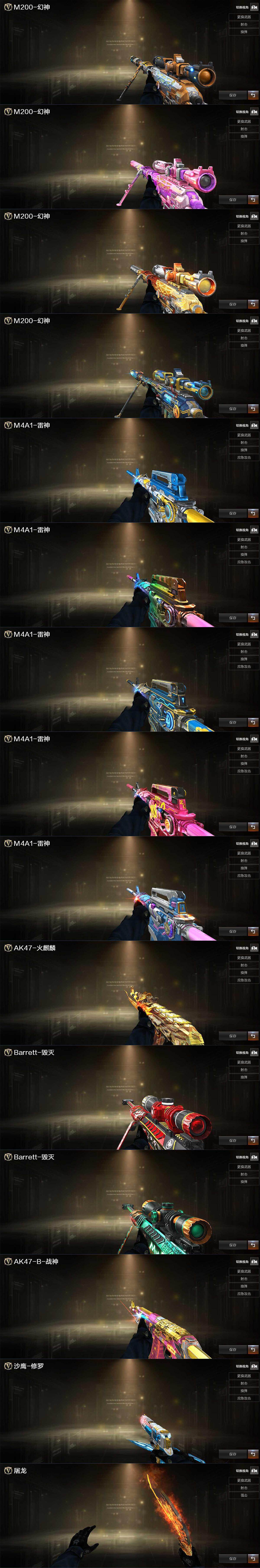 【热门武器】:M14EBR-玄武,Scar Light-白虎,M4A1-青龙,M200-幻神,M200-竞技荣光,白虎-电玩蓝兔,M4A1-黑骑士,MK5-炽火炎龙,沙鹰-修罗*2,炽芒蝶刃