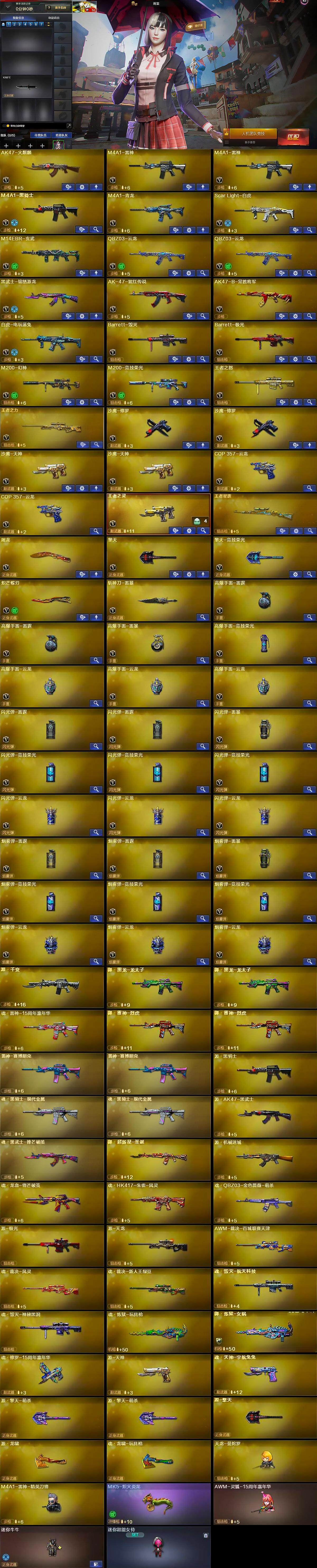 【英雄级武器】:AK47-火麒麟,M4A1-雷神*2,M4A1-黑骑士,M4A1-青龙,Scar Light-白虎,M14EBR-玄武,QBZ03-云龙*2,黑武士-锦绣游龙,AK-47-猩红传说,AK47-B-常胜将军,白虎-电玩蓝兔,Barrett-毁灭,Barrett-极光,M200-幻神,M200-竞技荣光,王者之怒-觉醒版,王者之力-觉醒版,沙鹰-修罗*2,沙鹰-天神*2,COP 357-云龙*2,王者之灵-觉醒版,屠龙,擎天,擎天-竞技荣光,炽芒蝶刃,斩神刀-雷暴,高爆手雷-雷霆*2,高爆手雷-雷暴,高爆手雷-竞技荣光,高爆手雷-云龙*3,闪光弹-雷霆*2,闪光弹-雷暴,闪光弹-竞技荣光*3,闪光弹-云龙*3,烟雾弹-雷霆*2,烟雾弹-雷暴,烟雾弹-竞技荣光*3,烟雾弹-云龙*3