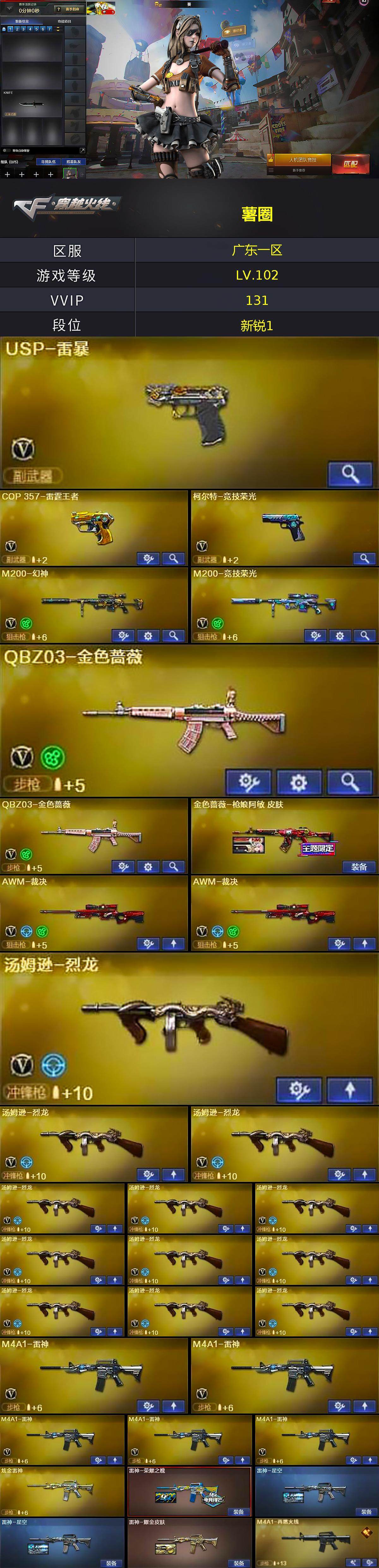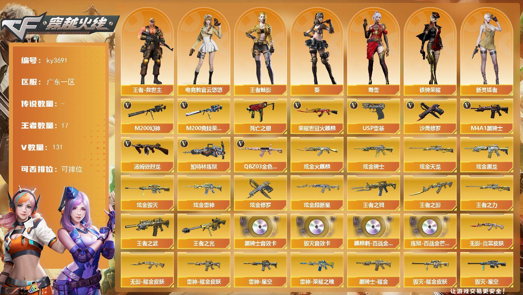 [13949617]广东一区-131V-17王者-9炫金 【热门武器】:QBZ03-金色蔷薇*2,M200-幻神,M200-竞技荣光,死亡之眼,荣耀世冠-火麒麟,M4A1-黑骑士*2,汤姆逊-烈龙*12,加特林-炼狱*5,USP-雷暴,沙鹰-修罗*9 【王者炫金武器】:王者之戮,王者之武*2,王者之影,王者之光,王者之力,炫金火麒麟,炫金骑士,炫金黑龙,炫金雷神,炫金超新星,炫金毁灭*2,炫金天龙,炫金修罗 【音效卡】:M4A1-黑骑士音效卡,Barrett-毁灭音效卡,麒麟刺-百战金芒-盛典舞曲音效卡,炼狱-百战金芒-庆典舞曲音效卡 【皮肤】:金色蔷薇-枪娘阿敏 皮肤,雷神-荣耀之魄,雷神-星空*2,雷神-耀金皮肤,M4A1-再燃火线,火麒麟-华夏之心*3,火麒麟-平天大圣,火麒麟-心动糖果,毁灭-荣耀之怒,毁灭耀金皮肤*2,毁灭-星空,毁灭-BEAN-2020MVP,毁灭-风暴,M4A1-千变-孔明皮肤,黑龙-暗月,黑骑士耀金皮肤,黑骑士-地狱火*2,无影耀金皮肤*2,无影-霓裳皮肤,天启-暗月,战神-粉色甜心皮肤*3,战神-紫绶金章皮肤*4,战神-流金岁月皮肤*4,AK47-B-常胜将军-曹操,AK47-B-常胜将军-孙权,AWM-天龙-传奇70KG,AWM-天龙-传奇白鲨,极光-能量核心,天神-暗月*2,屠龙-荣耀之锋,屠龙-惊鸿 皮肤,龙啸-冠军之啸,轻型军用手斧-再燃火线 【角色】:葵,电竞教官-云悠悠,王者-魅影,王者-救世主,暗夜-X,蜀雪,铁骑荣耀,兔囡囡,新灵狐者,新娜塔莎 【人偶武器】:迷你生化手雷,闪光弹-小乔*2,闪光弹-貂蝉,高爆手雷-大乔 【暴走生化】:死亡之眼,超级对讲机 【挑战大师】:神圣爆裂者III,激光毁灭者III-白马银枪,神圣爆裂者-末日III 【英雄级武器】:AK47-火麒麟*4,M4A1-黑龙*2,M4A1-雷神*5,M4A1-黑骑士*2,AK47-无影,AK47-黑武士*3,AK12-天启,AN94-超新星*2,AK47-黑鲨*3,M4A1-龙血*2,M4A1-玫瑰精灵,QBZ03-金色蔷薇*2,M4A1-猎神,王者之心-觉醒版,AK-47-猩红传说*8,AK47-B-战神,AK47-B-常胜将军,M4A1-雷霆王者-觉醒版,荣耀世冠-火麒麟,Barrett-毁灭*4,Barrett-极光*5,AWM-裁决*2,M200-幻神,M200