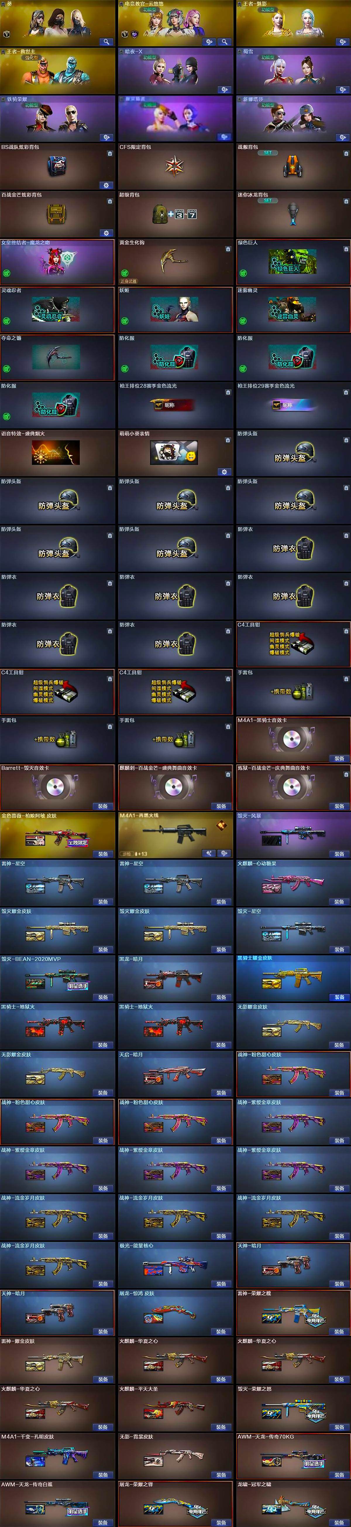 【皮肤】:金色蔷薇-枪娘阿敏 皮肤,雷神-荣耀之魄,雷神-星空*2,雷神-耀金皮肤,M4A1-再燃火线,火麒麟-华夏之心*3,火麒麟-平天大圣,火麒麟-心动糖果,毁灭-荣耀之怒,毁灭耀金皮肤*2,毁灭-星空,毁灭-BEAN-2020MVP,毁灭-风暴,M4A1-千变-孔明皮肤,黑龙-暗月,黑骑士耀金皮肤,黑骑士-地狱火*2,无影耀金皮肤*2,无影-霓裳皮肤,天启-暗月,战神-粉色甜心皮肤*3,战神-紫绶金章皮肤*4,战神-流金岁月皮肤*4,AK47-B-常胜将军-曹操,AK47-B-常胜将军-孙权,AWM-天龙-传奇70KG,AWM-天龙-传奇白鲨,极光-能量核心,天神-暗月*2,屠龙-荣耀之锋,屠龙-惊鸿 皮肤,龙啸-冠军之啸,轻型军用手斧-再燃火线