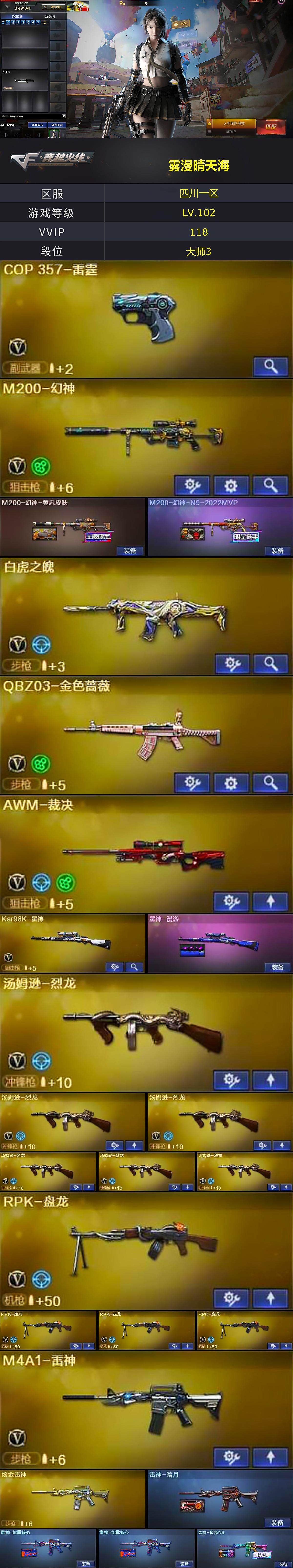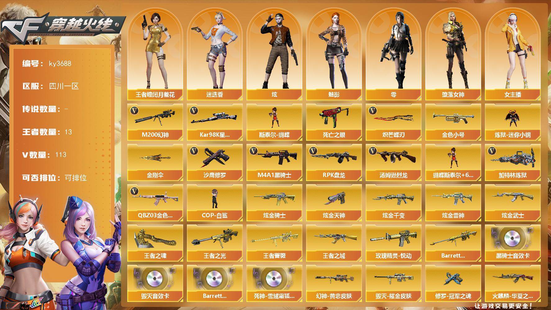 [13950207]四川一区-113V-13王者-6炫金 【热门武器】:QBZ03-金色蔷薇,M200-幻神,死亡之眼,Kar98K-星神,金色小号,炼狱-迷你小钢,M4A1-黑骑士,汤姆逊-烈龙*6,RPK-盘龙*4,加特林-炼狱*2,斯泰尔-蝴蝶,COP-白鲨,沙鹰-修罗*4,炽芒蝶刃,金刚伞 【王者炫金武器】:王者之城,玫瑰精灵-悦动,王者之光,王者蔷薇,Barrett-雷霆王者,王者之啸,炫金骑士,炫金千变,炫金雷神,炫金武士,炫金天神*2 【音效卡】:M4A1-黑骑士音效卡,Barrett-毁灭音效卡,Barrett-碧霄极光音效卡,死神-雪域霜狐-怀旧音效卡 【皮肤】:M200-幻神-黄忠皮肤,M200-幻神-N9-2022MVP,星神-漫游,雷神-暗月,雷神-能量核心*2,雷神-传奇N9,火麒麟-冠军之心,火麒麟-华夏之心,火麒麟-百城,火麒麟-心动糖果,毁灭耀金皮肤,毁灭-风暴,M4A1-千变-孔明皮肤,黑龙-能量核心,黑骑士-暗月*2,无影-暗月,天启-暗月*2,战神-粉色甜心皮肤,战神-紫绶金章皮肤*2,战神-流金岁月皮肤*2,天龙-能量核心,极光-能量核心,修罗-能量核心,修罗-冠军之魂,麒麟刺-甜蜜糖果 皮肤 【角色】:零,魅影,炫,迷迭香,战地猎狐,王者-瞳-闭月羞花,堕落女神,雪域霜狐,蛇隐宗,奇洋探员,乔伊教练,风暴女*2,嘉年华灵狐,0号玩家,零-水下丽影,灵狐者-黄金海岸,女主播,潘多拉-X,潜龙队-X,青霞仙子,蛇姬,铁骑荣耀,雪莉杨-摸金校尉,影武者-X 【人偶武器】:COP-白鲨,炼狱-迷你小钢,迷你律动酷熊,斯泰尔-蝴蝶,AWM-灵狐-15周年嘉年华*2,迷你生化手雷*3,生化手雷-机甲核心*2,闪光弹-小乔,灵狐娃娃手雷 【暴走生化】:黑龙吞噬者,双面神,死亡之眼,超级对讲机 【挑战大师】:神圣爆裂者III*2,AK47-冰龙粉碎者,激光毁灭者III-白马银枪,激光毁灭者III,神圣爆裂者-末日III 【英雄级武器】:M4A1-千变*2,AK47-火麒麟*2,M4A1-黑龙,M4A1-雷神,M4A1-黑骑士,AK47-无影,M4A1-死神*4,AK47-黑武士,AK12-天启*2,AN94-超新星,M4A1-武圣,AK47-黑鲨*2,M4A1-雷霆,QBZ03-天罚,无影-神兵利器,黑武士-锦绣游龙,超新星-热带奇洋,死神-雪域霜狐,M4A
