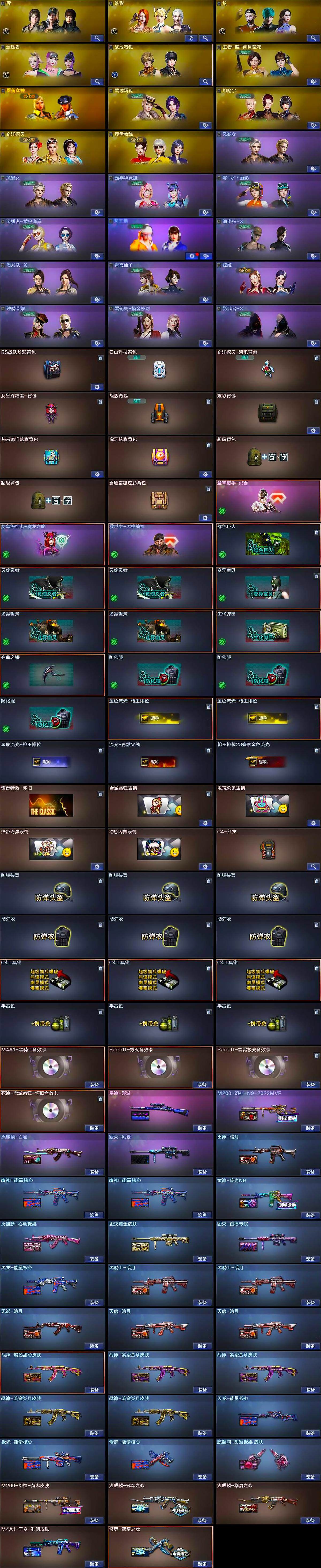 【英雄级武器】:M4A1-千变*2,AK47-火麒麟*2,M4A1-黑龙,M4A1-雷神,M4A1-黑骑士,AK47-无影,M4A1-死神*4,AK47-黑武士,AK12-天启*2,AN94-超新星,M4A1-武圣,AK47-黑鲨*2,M4A1-雷霆,QBZ03-天罚,无影-神兵利器,黑武士-锦绣游龙,超新星-热带奇洋,死神-雪域霜狐,M4A