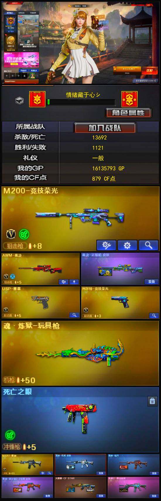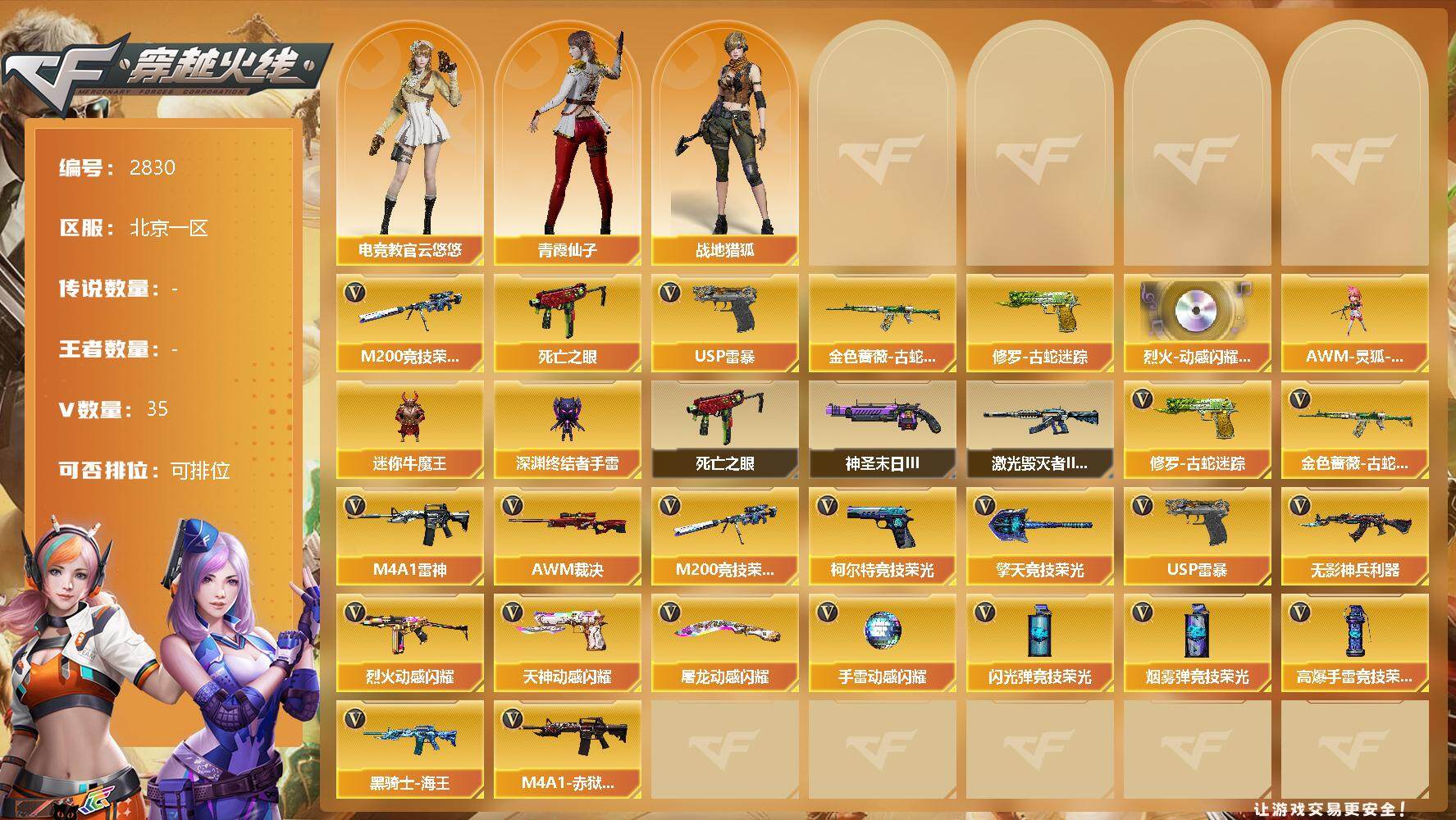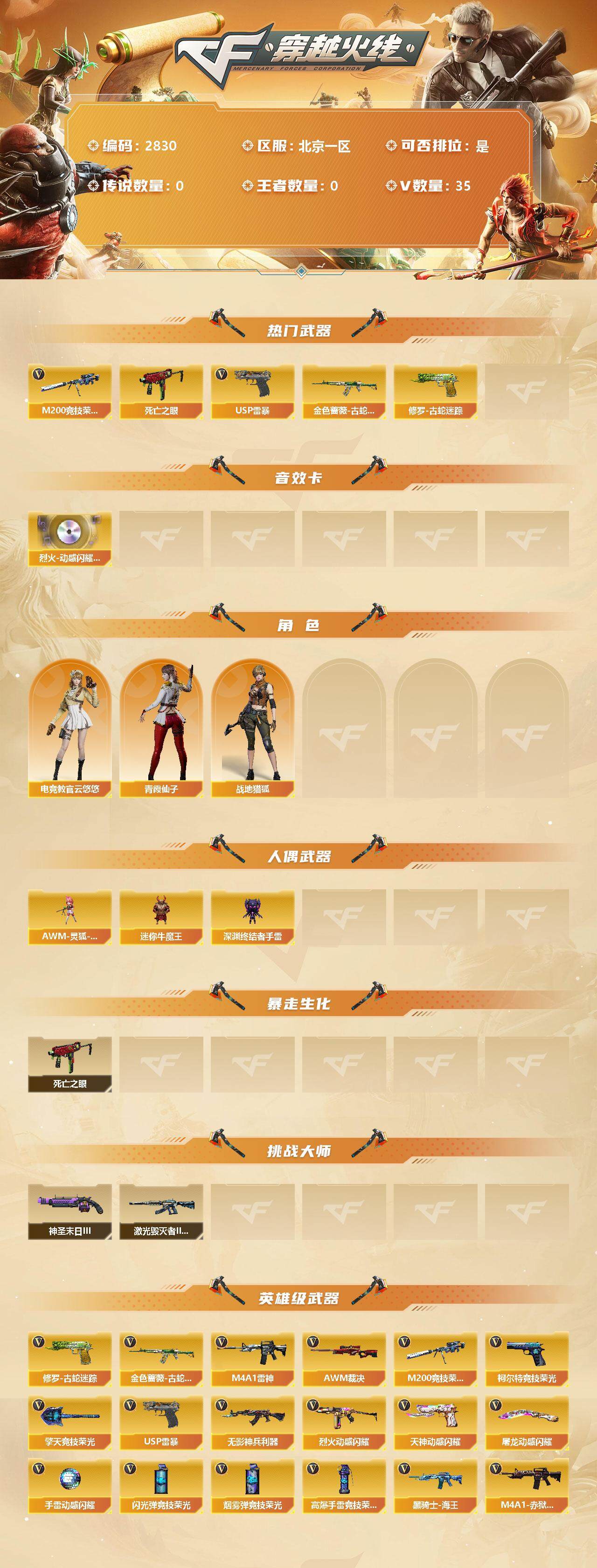 [13950523]北京一区-35V-0王者-0炫金 【热门武器】:金色蔷薇-古蛇迷踪,修罗-古蛇迷踪,M200-竞技荣光,死亡之眼,USP-雷暴 【音效卡】:烈火-动感闪耀 音效卡 【角色】:电竞教官-云悠悠,战地猎狐,青霞仙子 【人偶武器】:AWM-灵狐-15周年嘉年华,迷你牛魔王,深渊终结者手雷 【暴走生化】:死亡之眼 【挑战大师】:神圣爆裂者-末日III,激光毁灭者III-白马银枪 【英雄级武器】:M200-竞技荣光,柯尔特-竞技荣光,擎天-竞技荣光,高爆手雷-竞技荣光*5,烟雾弹-竞技荣光*6,闪光弹-竞技荣光*8,USP-雷暴,烈火-动感闪耀,天神-动感闪耀,屠龙-动感闪耀,手雷-动感闪耀,金色蔷薇-古蛇迷踪,无影-神兵利器,M4A1-雷神,AWM-裁决,黑骑士-海王,M4A1-赤狱骑士,修罗-古蛇迷踪 【特殊枪械】: