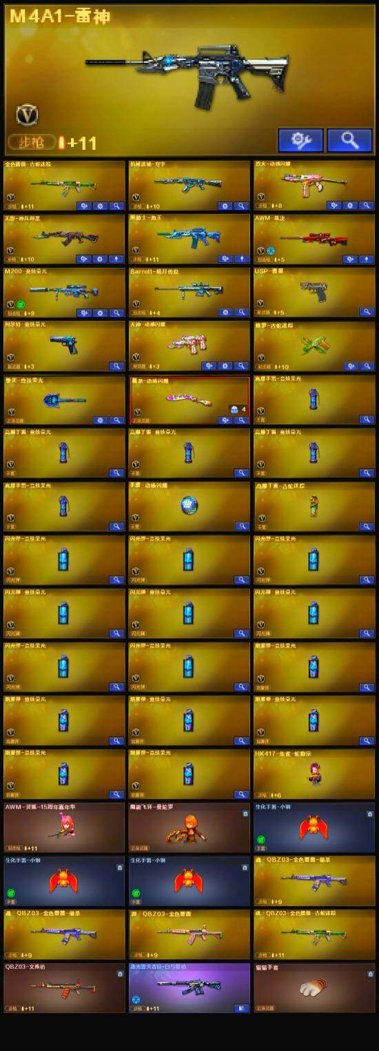 【英雄级武器】:M200-竞技荣光,柯尔特-竞技荣光,擎天-竞技荣光,高爆手雷-竞技荣光*5,烟雾弹-竞技荣光*6,闪光弹-竞技荣光*8,USP-雷暴,烈火-动感闪耀,天神-动感闪耀,屠龙-动感闪耀,手雷-动感闪耀,金色蔷薇-古蛇迷踪,无影-神兵利器,M4A1-雷神,AWM-裁决,黑骑士-海王,M4A1-赤狱骑士,修罗-古蛇迷踪