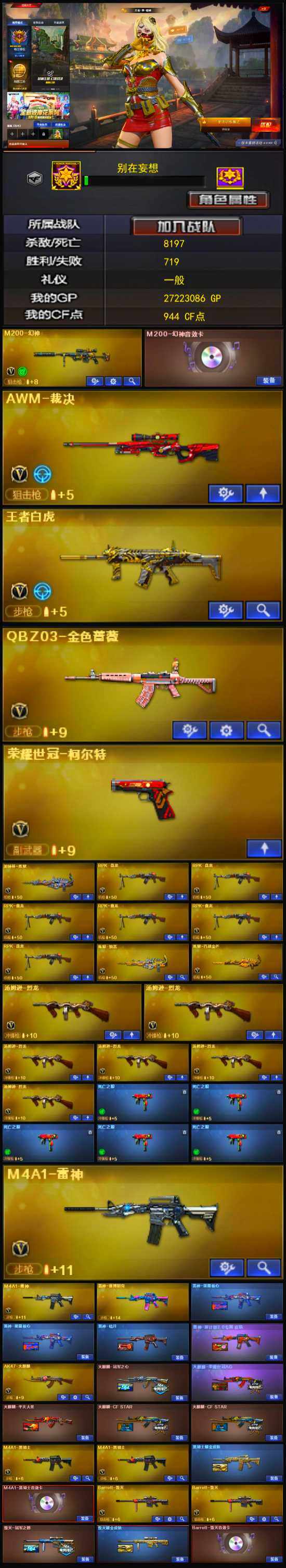 【热门武器】:王者白虎,QBZ03-金色蔷薇,M200-幻神,死亡之眼*5,荣耀世冠-柯尔特,C.A.T,M4A1-黑骑士*2,汤姆逊-烈龙*6,RPK-盘龙*6,加特林-炼狱,羊驼玩偶,沙鹰-修罗*6,金刚伞