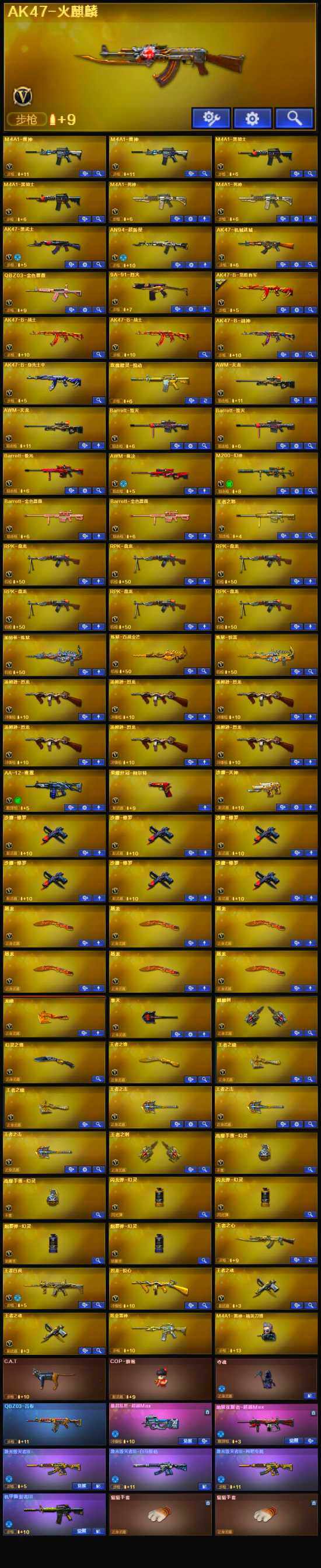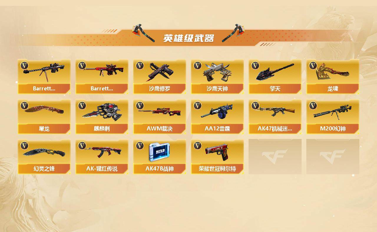 【英雄级武器】:AK47-火麒麟,M4A1-雷神*2,M4A1-黑骑士*2,M4A1-死神*2,AK47-黑武士,AN94-超新星,AK47-机械迷城,QBZ03-金色蔷薇,AK-47-猩红传说*6,AK47-B-战神,AK47-B-常胜将军,AWM-天龙*2,Barrett-毁灭*2,Barrett-极光,AWM-裁决,M200-幻神,RPK-盘龙*6,加特林-炼狱,汤姆逊-烈龙*6,AA-12-雷霆,沙鹰-修罗*6,沙鹰-天神,荣耀世冠-柯尔特,屠龙*6,龙啸,擎天,麒麟刺,幻灵之锋