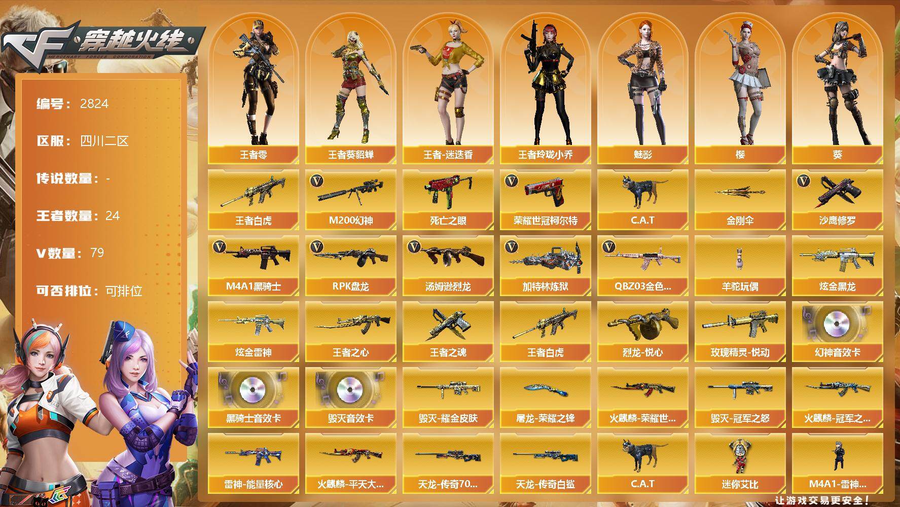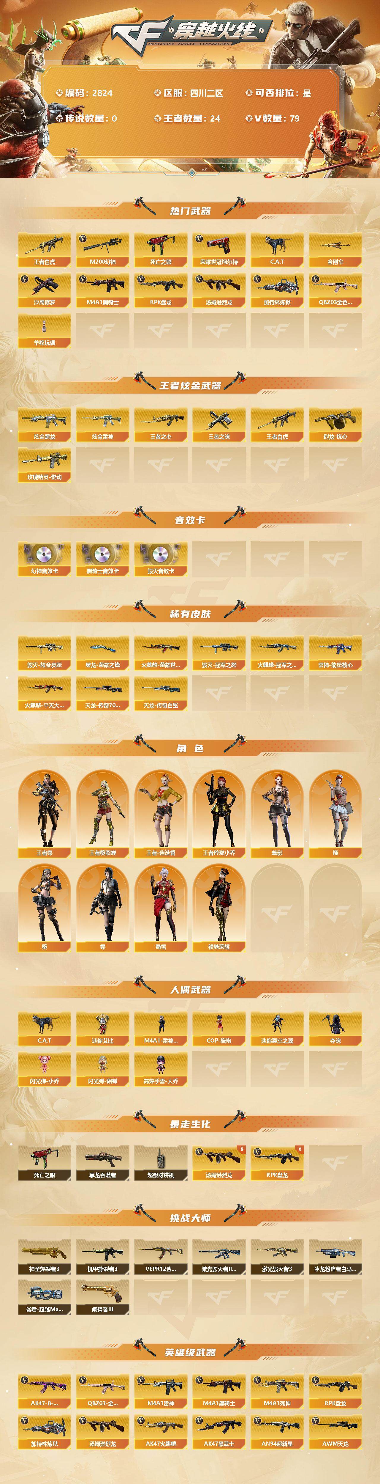 [13950683]四川二区-79V-24王者-2炫金 【热门武器】:王者白虎,QBZ03-金色蔷薇,M200-幻神,死亡之眼*5,荣耀世冠-柯尔特,C.A.T,M4A1-黑骑士*2,汤姆逊-烈龙*6,RPK-盘龙*6,加特林-炼狱,羊驼玩偶,沙鹰-修罗*6,金刚伞 【王者炫金武器】:玫瑰精灵-悦动,王者之心,王者白虎,烈龙-悦心,王者之魂*2,炫金黑龙,炫金雷神 【音效卡】:M200-幻神音效卡,M4A1-黑骑士音效卡,Barrett-毁灭音效卡 【稀有皮肤】:雷神-能量核心*2,火麒麟-冠军之心,火麒麟-平天大圣,火麒麟-荣耀世冠AG,毁灭耀金皮肤,毁灭-冠军之怒,AWM-天龙-传奇70KG,AWM-天龙-传奇白鲨,屠龙-荣耀之锋 【角色】:零,葵,樱,魅影,王者-葵-貂蝉,王者-零,王者-迷迭香,王者玲珑-小乔,蜀雪,铁骑荣耀 【人偶武器】:M4A1-雷神-精英刀锋,COP-旗袍,C.A.T,迷你艾比,迷你裂空之翼*4,夺魂,闪光弹-小乔,闪光弹-貂蝉,高爆手雷-大乔 【暴走生化】:死亡之眼*5,黑龙吞噬者,超级对讲机 【挑战大师】:神圣爆裂者III,机甲撕裂者III,阐释者III,激光毁灭者III,VEPR-12-金魔,激光毁灭者III-白马银枪,冰龙粉碎者-白马银枪,暴君乱世-超越Max 【英雄级武器】:AK47-火麒麟,M4A1-雷神*2,M4A1-黑骑士*2,M4A1-死神*2,AK47-黑武士,AN94-超新星,AK47-机械迷城,QBZ03-金色蔷薇,AK-47-猩红传说*6,AK47-B-战神,AK47-B-常胜将军,AWM-天龙*2,Barrett-毁灭*2,Barrett-极光,AWM-裁决,M200-幻神,RPK-盘龙*6,加特林-炼狱,汤姆逊-烈龙*6,AA-12-雷霆,沙鹰-修罗*6,沙鹰-天神,荣耀世冠-柯尔特,屠龙*6,龙啸,擎天,麒麟刺,幻灵之锋 【特殊枪械】:2黑骑士,6烈龙,6盘龙,1炼狱