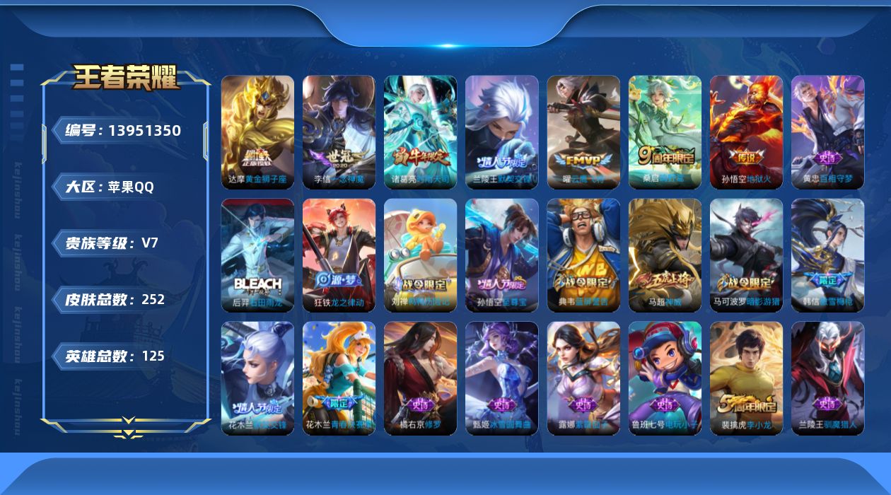 [13951350]金标哪吒 高渐离苹果Q-252皮肤-7传说-67史诗 【传说皮肤】:桑启鸣野蒿,兰陵王默契交锋,诸葛亮时雨天司,曜云鹰飞将,李信一念神魔,达摩黄金狮子座,孙悟空地狱火 【限定皮肤】:姜子牙天穹之誓,狄仁杰阴阳师,赵云皇家上将,嬴政白昼王子,孙尚香蔷薇恋人,庄周高山流水,高渐离死亡摇滚,阿轲迷踪丽影,周瑜赤莲之焰,夏侯惇朔风刀,甄姬游园惊梦,典韦蓝屏警告,马可波罗暗影游猎,狄仁杰魔术师,狄仁杰万华元夜,达摩星际陆战队,达摩沙漠行僧,项羽海滩派对,老夫子醍醐杖,程咬金演武夺筹,刘邦夺宝奇兵,韩信傲雪梅枪,兰陵王默契交锋,兰陵王驯魔猎人,兰陵王金庭之子,花木兰青春决赛季,花木兰默契交锋,孙悟空至尊宝,后羿圣弓游侠,李元芳银河之约,李元芳云中旅人,虞姬霸王别姬,钟馗驱傩正仪,杨玉环遇见飞天,干将莫邪真爱魔法,雅典娜黎明之约,蔡文姬繁星吟游,太乙真人华丽摇滚,鬼谷子原初探秘者,鬼谷子五谷丰年,诸葛亮时雨天司,苏烈千军破阵,百里玄策原初追逐者,弈星混沌棋,梦奇顽趣,沈梦溪星空之诺,沈梦溪大漠名商,明世隐疑决卦,裴擒虎李小龙,裴擒虎擒涛扼浪,米莱狄胡桃异想国,云中君纤云弄巧,盾山御銮,猪八戒西部大镖客,上官婉儿梁祝,嫦娥拒霜思,鲁班大师探海日志,桑启海盐诗旅,艾琳女武神,阿古朵江河有灵,张良古海寻踪,蒙恬荣光圣徽,高渐离燃音魔法,妲己灵卜魔法,鬼谷子天穹祈灯,沈梦溪龙舞盛年,刘邦剑破天穹,程咬金群星魔术团,周瑜熔金海岸 【年限皮肤】:诸葛亮时雨天司,马超神威 【赛季限定】:夏侯惇朔风刀,狄仁杰万华元夜,达摩沙漠行僧,老夫子醍醐杖,程咬金演武夺筹,兰陵王金庭之子,张良古海寻踪,李元芳云中旅人,钟馗驱傩正仪,雅典娜黎明之约,鬼谷子原初探秘者,苏烈千军破阵,百里玄策原初追逐者,弈星混沌棋,梦奇顽趣,沈梦溪大漠名商,明世隐疑决卦,裴擒虎擒涛扼浪,盾山御銮,鲁班大师探海日志,桑启海盐诗旅,鬼谷子天穹祈灯,蒙恬荣光圣徽,刘邦剑破天穹,姜子牙天穹之誓 【战令限定】:嬴政白昼王子,阿轲迷踪丽影,周瑜赤莲之焰,典韦蓝屏警告,马可波罗暗影游猎,达摩星际陆战队,刘邦夺宝奇兵,兰陵王驯魔猎人,后羿圣弓游侠,李元芳银河之约,干将莫邪真爱魔法,沈梦溪星空之诺,米莱狄胡桃异想国,猪八戒西部大镖客,高渐离燃音魔法,妲己灵卜魔法 【史诗皮肤】:鲁班七号电玩小子,露娜紫霞仙子,阿轲暗夜猫娘,赵云皇家上将,赵云未来