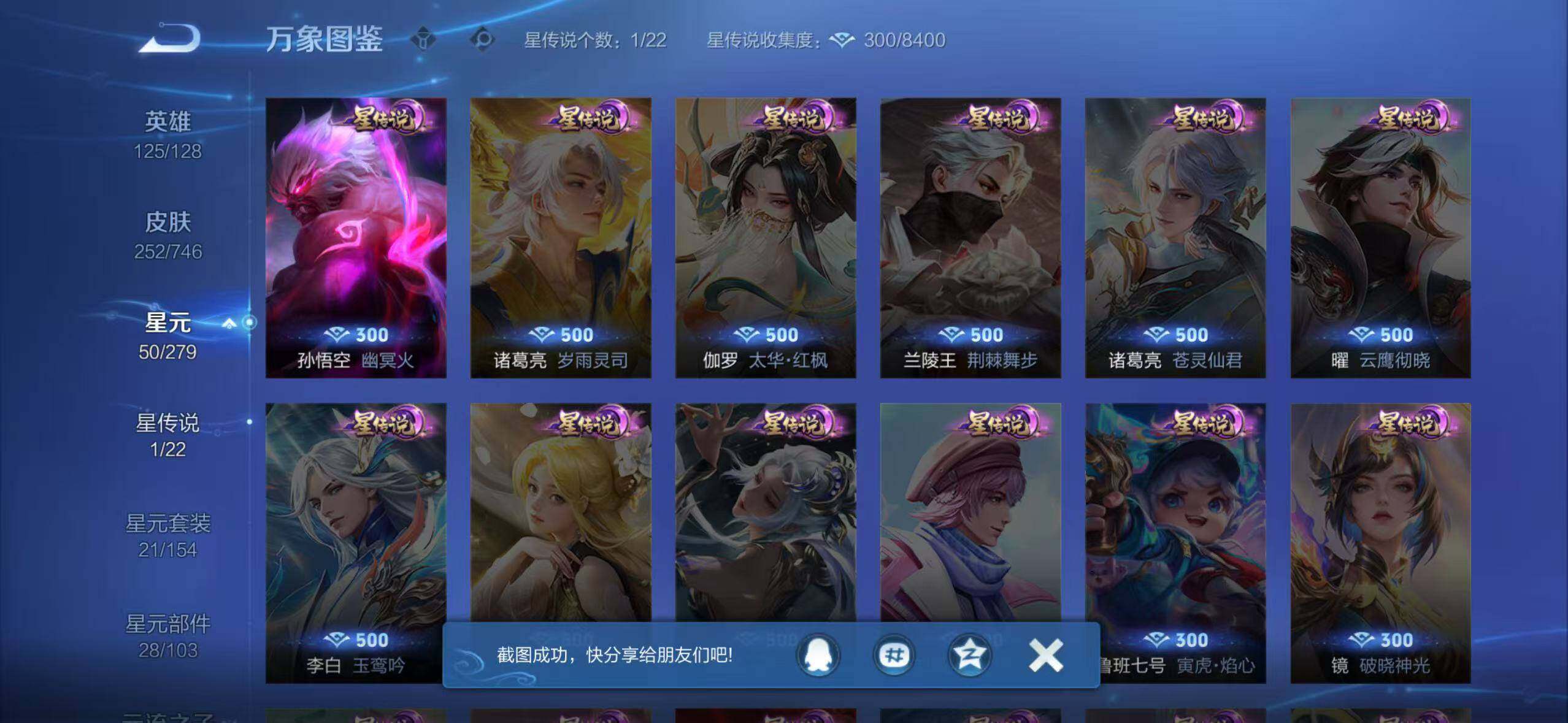 - PX_2056638-42 安卓QQ/永恒钻石/262皮肤/125英雄/1典藏/0珍品无双/0无双/0珍品传说/22传说/59史诗/9稀有英雄 【1 典藏皮肤】弑枪猎影 韩信, 【22 传说皮肤】枫霜尽 橘右京,启明星使 虞姬,云霓雀翎 虞姬,李逍遥 曜,零号·赤焰 孙悟空,夜礼服假面 狄仁杰,地狱之眼 宫本武藏,黄金射手座 后羿,怒海麟威 吕布,久胜战神 干将莫邪,末日机甲 孙尚香,乘龙·淬吴