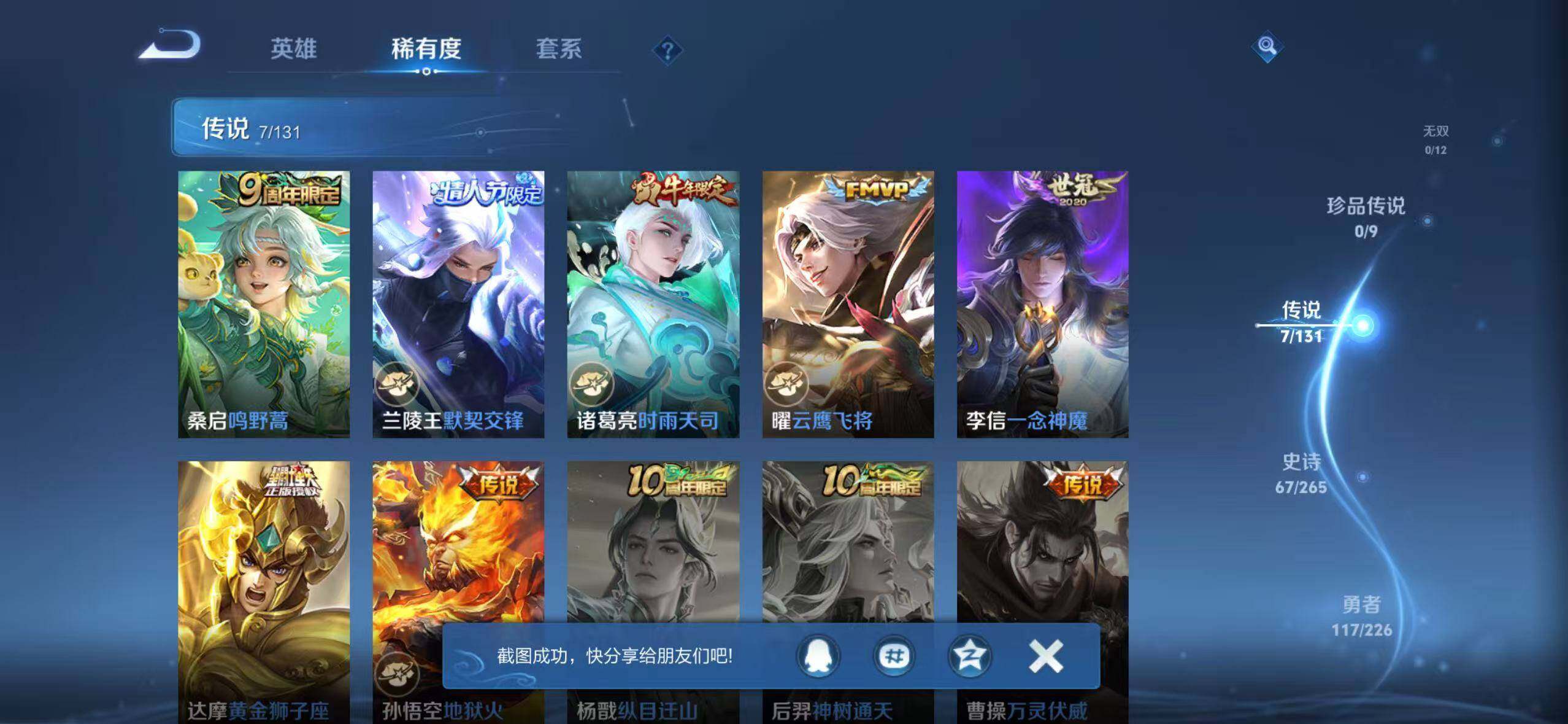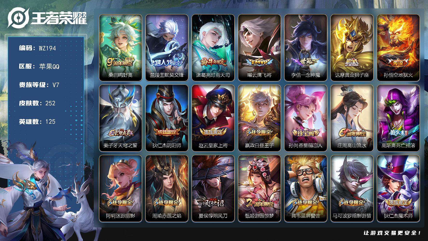 - [11601273]V7 9传说 122英雄 160皮肤 可修改实名 优质装备:云鹰飞将(小将军),猫影幻舞,一念神魔,末日机甲-孙尚香(绿蚂蚱) 珍宝阁皮:万物之道 限定皮:逐霄战戟,鸣野蒿,至尊宝,白虎志(电光耗子),凤求凰(白切鸡),太华(伽罗年限),神威(电光马子),飞衡(韩信年限),冰锋战神,武圣,梁祝,岱宗(典韦年限),天狼征服者,李小龙,如梦令-嫦娥,默契交锋-花木兰,孙行者,引擎之心 史诗皮:破空之剑,百相守梦-黄忠,紫霞仙子,白龙吟,特工魅影,千年之狐,冰冠公主,节奏热浪,女仆咖啡,摇滚巨星,水果甜心,心灵骇客,鬼剑武藏,心灵战警,舞动绿茵,地狱岩魂,乘风破浪,月团寄思,箭羽风息,金属风暴,鹰眼统帅