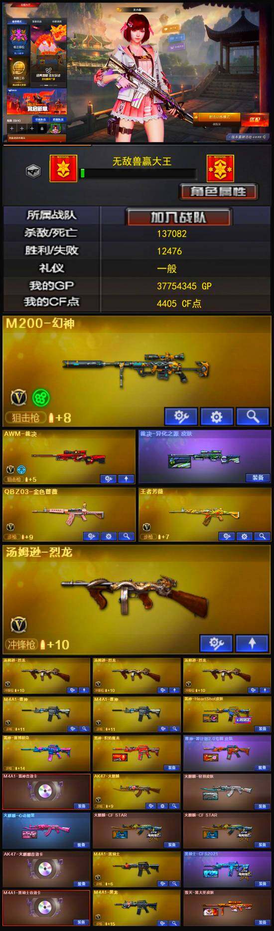 - [12065305]【商品标题】:四川一区-24V-2王者-0炫金 【热门武器】:QBZ03-金色蔷薇,M200-幻神,金色蔷薇-古蛇迷踪,修罗-古蛇迷踪,死亡之眼,白虎-电玩蓝兔,QBZ03-街机,Cat-刀锋,沙鹰-修罗 【音效卡】:天神-动感闪耀 音效卡 【稀有皮肤】:M200-幻神-黄忠皮肤,火麒麟-心动糖果 【角色】:王者玲珑,隼 【人偶武器】:天龙-曼陀罗,AWM-灵狐-15周年嘉年华,Cat-刀锋,迷你超能女侍,迷你波特博士*6,迷你火种*3,生化手雷-机甲核心*3 【暴走生化】:死亡之眼 【英雄级武器】:M4A1-武圣,Glock18-武圣,烈火-动感闪耀,天神-动感闪耀,屠龙-动感闪耀,手雷-动感闪耀,QBZ03-金色蔷薇,金色蔷薇-古蛇迷踪,白虎-电玩蓝兔,M4A1-雷神,AK47-火麒麟*2,AWM-天龙,Barrett-毁灭,M200-幻神,修罗-古蛇迷踪,沙鹰-天神,沙鹰-修罗,麒麟刺 【特殊枪械】: