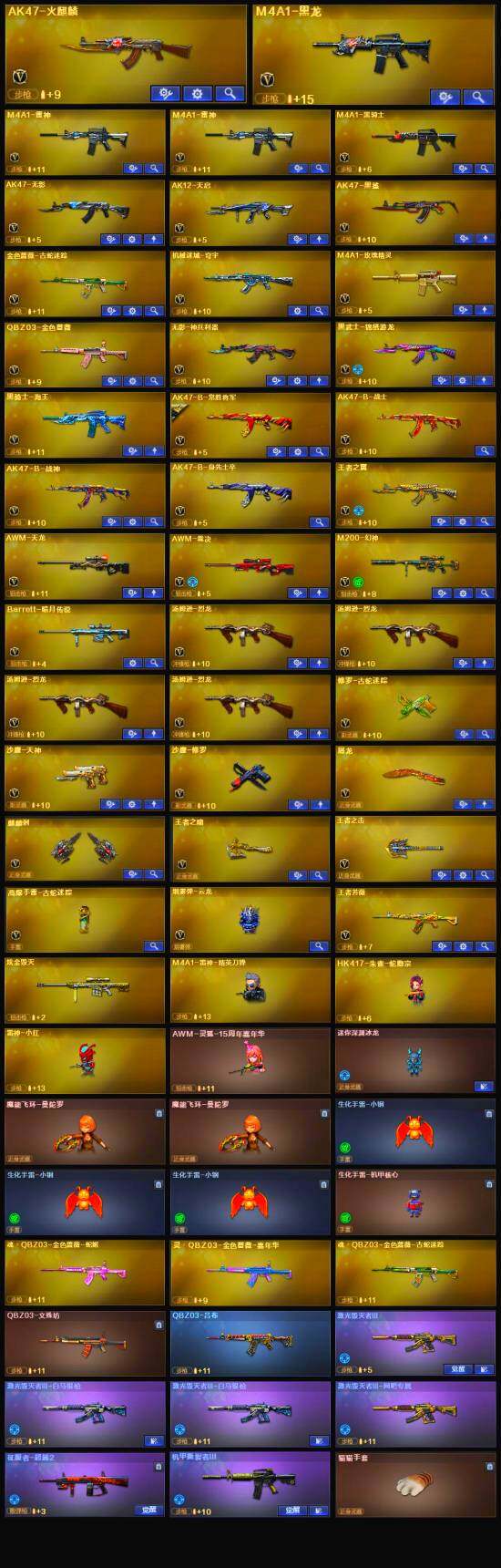 【英雄级武器】:QBZ03-金色蔷薇,金色蔷薇-古蛇迷踪,无影-神兵利器,M4A1-雷神*2,M4A1-黑龙,M4A1-玫瑰精灵,M4A1-黑骑士,汤姆逊-烈龙*4,AK47-无影,AK47-火麒麟,AK12-天启,AWM-天龙,AWM-裁决,M200-幻神,AK47-黑鲨,黑武士-锦绣游龙,黑骑士-海王,AK-47-猩红传说,AK47-B-战神,AK47-B-常胜将军,M4A1-赤狱骑士,修罗-古蛇迷踪,沙鹰-天神,沙鹰-修罗,麒麟刺,屠龙
