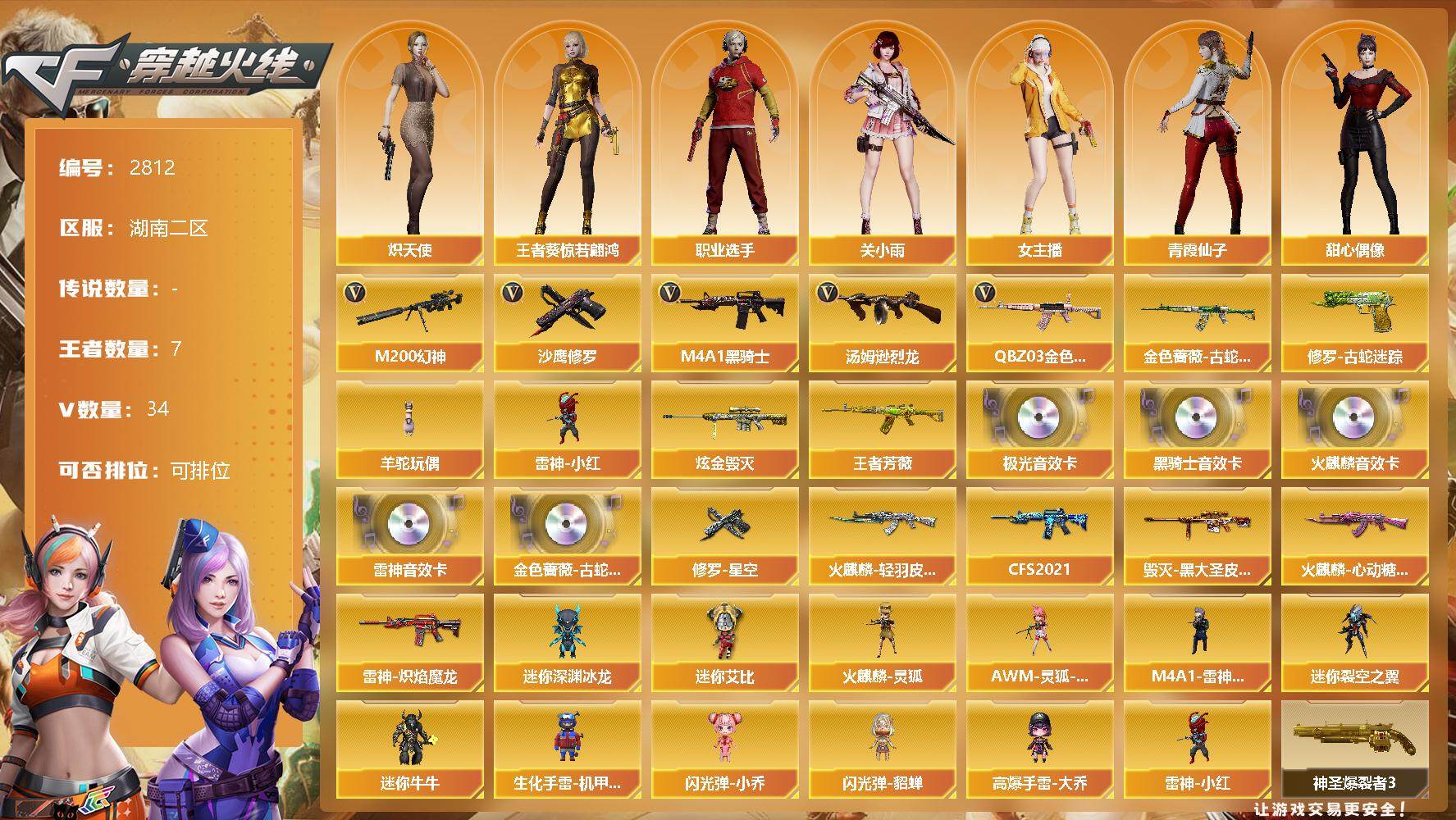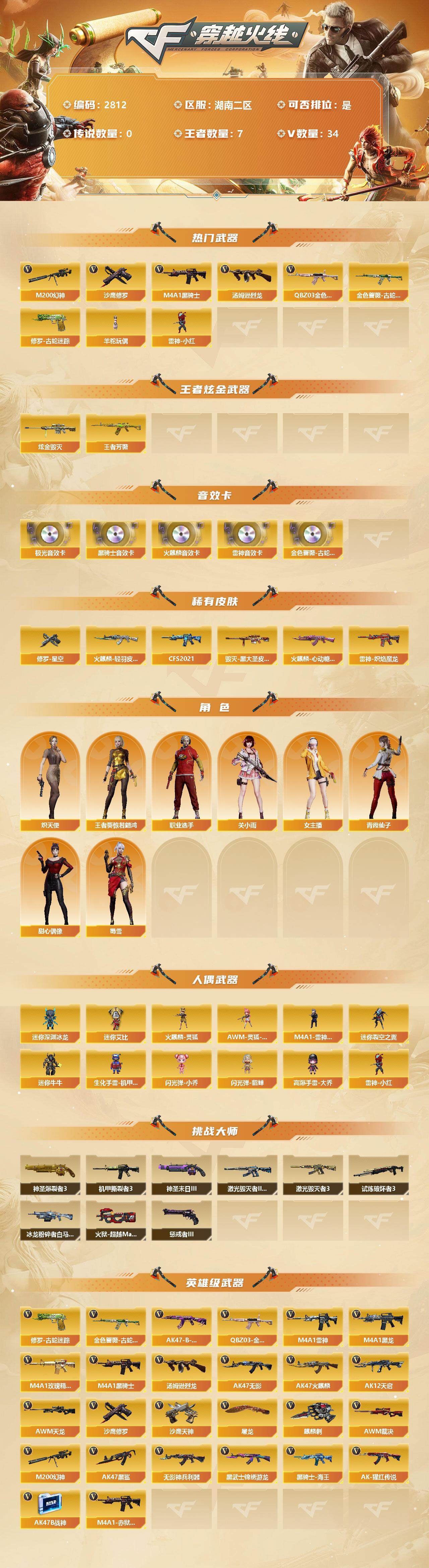 [13951491]湖南二区-34V-7王者-1炫金 【热门武器】:QBZ03-金色蔷薇,M200-幻神,金色蔷薇-古蛇迷踪,修罗-古蛇迷踪,M4A1-黑骑士,汤姆逊-烈龙*4,羊驼玩偶,雷神-小红,沙鹰-修罗 【王者炫金武器】:炫金毁灭,王者芳薇 【音效卡】:金色蔷薇-古蛇迷踪音效卡,AK47-火麒麟音效卡,M4A1-雷神音效卡,M4A1-黑骑士音效卡,Barrett-极光音效卡 【稀有皮肤】:雷神-炽焰魔龙,火麒麟-轻羽皮肤,火麒麟-心动糖果,黑骑士-CFS2021,毁灭-黑大圣皮肤,修罗-星空 【角色】:王者葵-惊若翩鸿,关小雨,蜀雪,炽天使,女主播,职业选手,青霞仙子,甜心偶像 【人偶武器】:雷神-小红,火麒麟-灵狐,AWM-灵狐-15周年嘉年华,M4A1-雷神-精英刀锋,迷你深渊冰龙,迷你艾比,迷你裂空之翼,迷你牛牛,生化手雷-机甲核心,闪光弹-小乔,闪光弹-貂蝉,高爆手雷-大乔 【挑战大师】:神圣爆裂者III,机甲撕裂者III,神圣爆裂者-末日III,惩戒者III,试炼破坏者III,激光毁灭者III,激光毁灭者III-白马银枪*2,冰龙粉碎者-白马银枪,火狱乱世-超越Max 【英雄级武器】:QBZ03-金色蔷薇,金色蔷薇-古蛇迷踪,无影-神兵利器,M4A1-雷神*2,M4A1-黑龙,M4A1-玫瑰精灵,M4A1-黑骑士,汤姆逊-烈龙*4,AK47-无影,AK47-火麒麟,AK12-天启,AWM-天龙,AWM-裁决,M200-幻神,AK47-黑鲨,黑武士-锦绣游龙,黑骑士-海王,AK-47-猩红传说,AK47-B-战神,AK47-B-常胜将军,M4A1-赤狱骑士,修罗-古蛇迷踪,沙鹰-天神,沙鹰-修罗,麒麟刺,屠龙 【特殊枪械】:1黑骑士,4烈龙