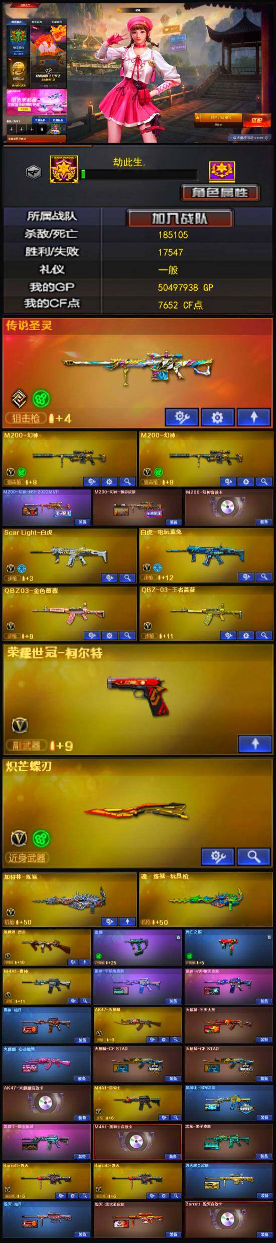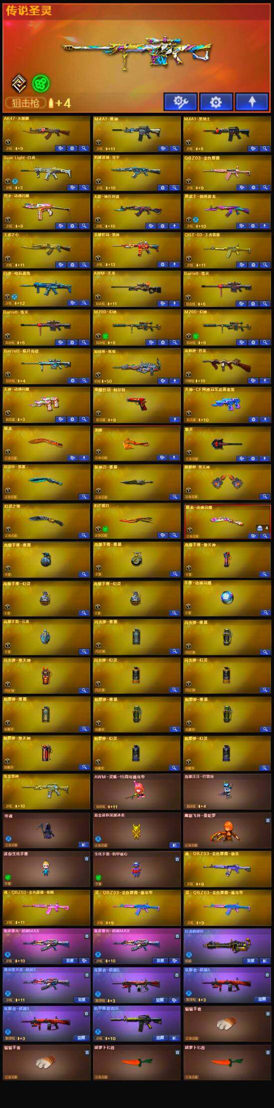 【热门武器】:传说圣灵,QBZ03-金色蔷薇,Scar Light-白虎,M200-幻神*2,死亡之眼,荣耀世冠-雷神,白虎-电玩蓝兔,荣耀世冠-柯尔特,毒蜂,M4A1-黑骑士,汤姆逊-烈龙,加特林-炼狱,COP-白鲨,炽芒蝶刃