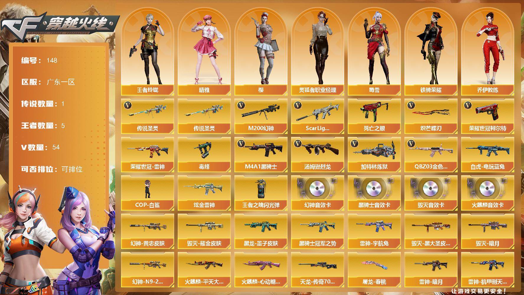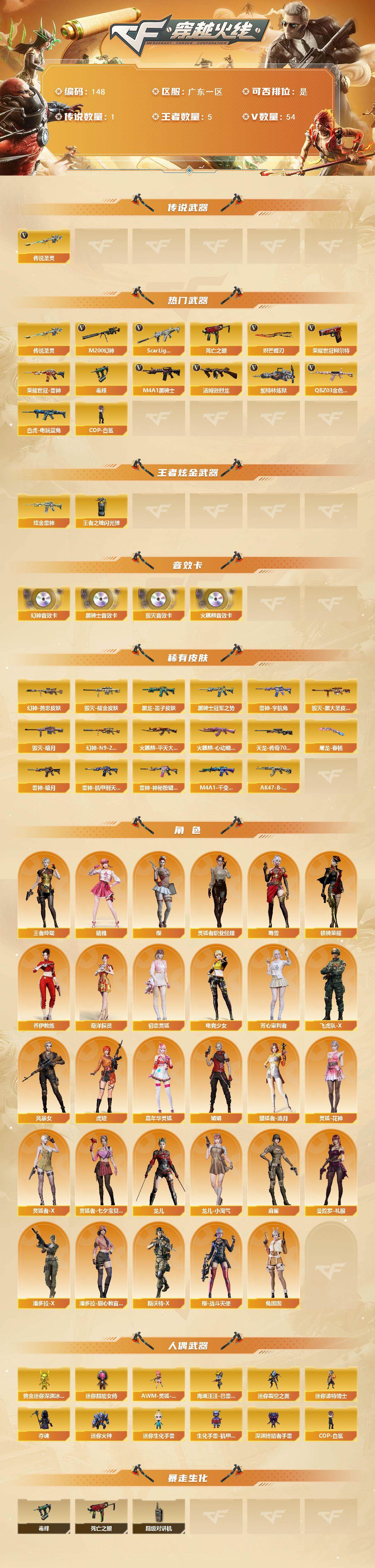 [13951495]广东一区-54V-5王者-1炫金 【传说武器】:传说圣灵 【热门武器】:传说圣灵,QBZ03-金色蔷薇,Scar Light-白虎,M200-幻神*2,死亡之眼,荣耀世冠-雷神,白虎-电玩蓝兔,荣耀世冠-柯尔特,毒蜂,M4A1-黑骑士,汤姆逊-烈龙,加特林-炼狱,COP-白鲨,炽芒蝶刃 【王者炫金武器】:炫金雷神,王者之魄闪光弹 【音效卡】:M200-幻神音效卡,AK47-火麒麟音效卡,M4A1-黑骑士音效卡,Barrett-毁灭音效卡 【皮肤】:M200-幻神-黄忠皮肤,M200-幻神-N9-2022MVP,雷神-暗月,雷神-机甲刑天皮肤,雷神-宇航兔皮肤,雷神-神秘按键 皮肤,火麒麟-平天大圣,火麒麟-心动糖果,毁灭-暗月,毁灭耀金皮肤,毁灭-黑大圣皮肤,M4A1-千变-孔明皮肤,黑龙-墨子皮肤,黑骑士-冠军之势,AK47-B-常胜将军-刘备,AWM-天龙-传奇70KG,屠龙-春桃 皮肤 【角色】:樱,晴雅,王者玲珑,奇洋探员,乔伊教练,初恋灵狐,电竞少女,芳心审判者,飞虎队-X,风暴女,虎妞,嘉年华灵狐,娟娟,猎狐者-追月,灵狐-花神,灵狐者-X,灵狐者-七夕宝贝,灵狐者-职业经理,龙儿,龙儿-小淘气,麻雀,曼陀罗-礼服,潘多拉-X,潘多拉-甜心教官,斯沃特-X,蜀雪,铁骑荣耀,兔囡囡,樱-战斗天使 【人偶武器】:COP-白鲨,AWM-灵狐-15周年嘉年华,海滩汪汪-巴雷特,黄金迷你深渊冰龙,迷你裂空之翼,迷你波特博士,夺魂,迷你火种,迷你生化手雷,生化手雷-机甲核心,深渊终结者手雷,迷你超能女侍 【暴走生化】:毒蜂,死亡之眼,超级对讲机 【挑战大师】:冰龙粉碎者-白马银枪*2,VEPR-12-金魔,机甲撕裂者III,试炼破坏者III,神圣爆裂者-末日III 【英雄级武器】:AK47-火麒麟,M4A1-雷神,M4A1-黑骑士,Scar Light-白虎,无影-神兵利器,黑武士-锦绣游龙,QBZ03-金色蔷薇,烈火-动感闪耀,王者之心-觉醒版,AK-47-猩红传说,QBZ-03-王者蔷薇-觉醒版,白虎-电玩蓝兔,荣耀世冠-雷神,黑武士-CF网剧冠军,AWM-天龙,Barrett-毁灭*2,M200-幻神*2,加特林-炼狱,汤姆逊-烈龙,荣耀世冠-柯尔特,天神-动感闪耀,天神-CF网剧冠军,屠龙,龙啸,麒麟刺-堕天神,擎天,幻灵之锋,炽芒蝶刃,屠龙-动感闪耀,斩