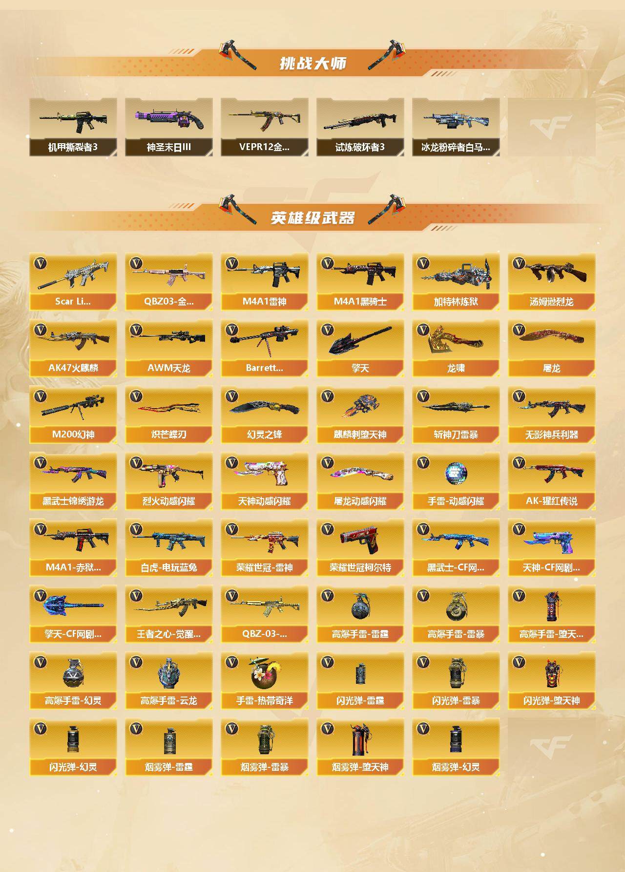 【英雄级武器】:AK47-火麒麟,M4A1-雷神,M4A1-黑骑士,Scar Light-白虎,无影-神兵利器,黑武士-锦绣游龙,QBZ03-金色蔷薇,烈火-动感闪耀,王者之心-觉醒版,AK-47-猩红传说,QBZ-03-王者蔷薇-觉醒版,白虎-电玩蓝兔,荣耀世冠-雷神,黑武士-CF网剧冠军,AWM-天龙,Barrett-毁灭*2,M200-幻神*2,加特林-炼狱,汤姆逊-烈龙,荣耀世冠-柯尔特,天神-动感闪耀,天神-CF网剧冠军,屠龙,龙啸,麒麟刺-堕天神,擎天,幻灵之锋,炽芒蝶刃,屠龙-动感闪耀,斩