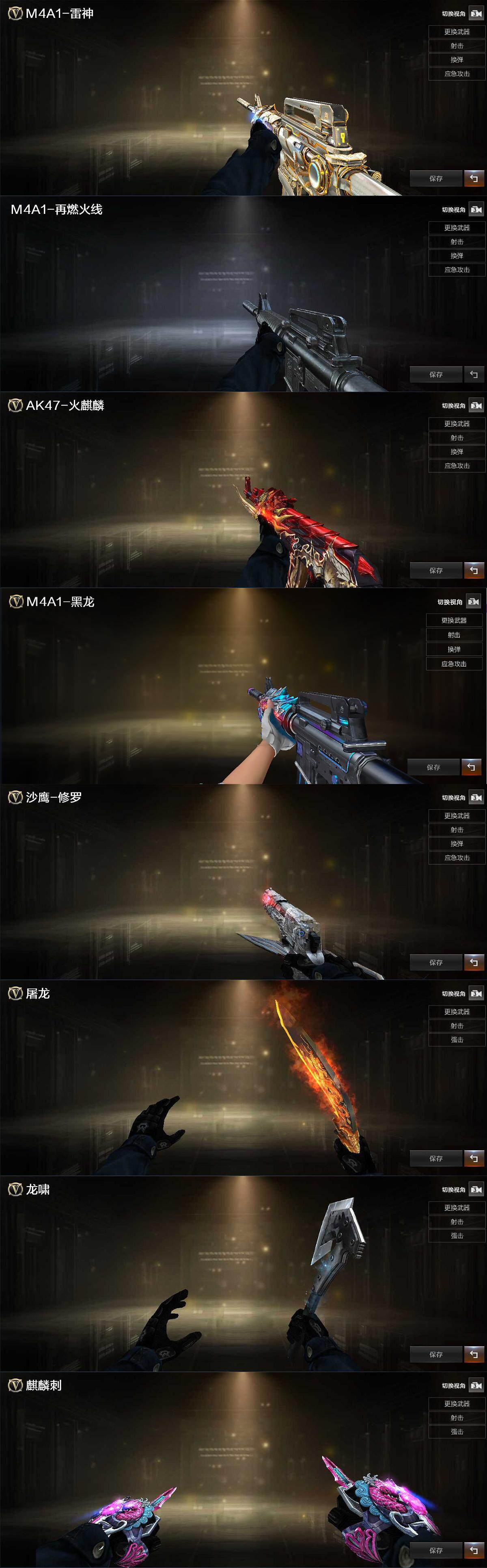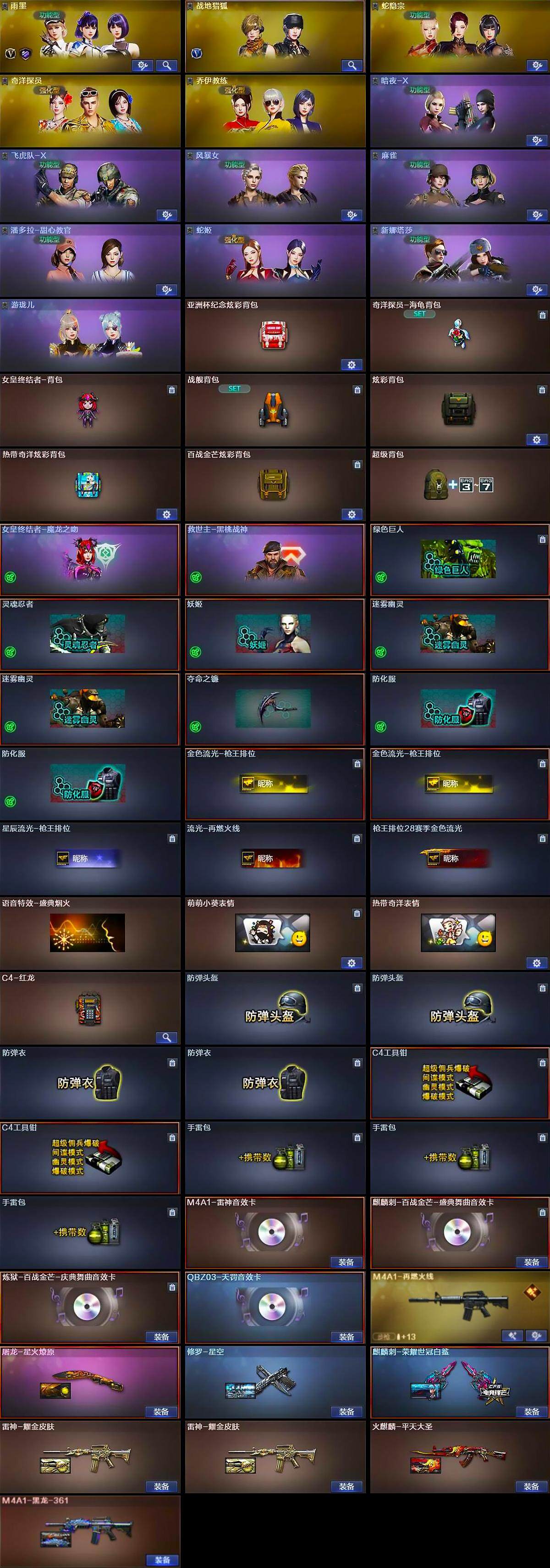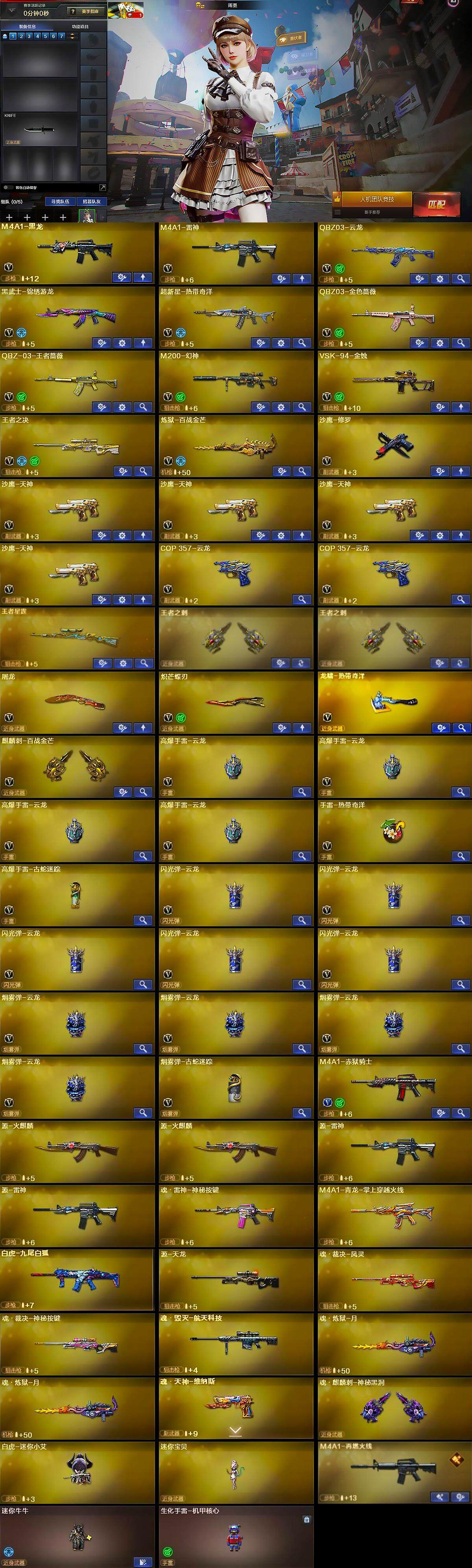 【英雄级武器】:M4A1-黑龙,M4A1-雷神,QBZ03-云龙,黑武士-锦绣游龙,超新星-热带奇洋,QBZ03-金色蔷薇,QBZ-03-王者蔷薇-觉醒版,M200-幻神,VSK-94-金蚀,王者之决-觉醒版,炼狱-百战金芒,沙鹰-修罗,沙鹰-天神*4,COP 357-云龙*2,屠龙,炽芒蝶刃,龙啸-热带奇洋,麒麟刺-百战金芒,高爆手雷-云龙*4,手雷-热带奇洋,高爆手雷-古蛇迷踪,闪光弹-云龙*5,烟雾弹-云龙*4,烟雾弹-古蛇迷踪,M4A1-赤狱骑士