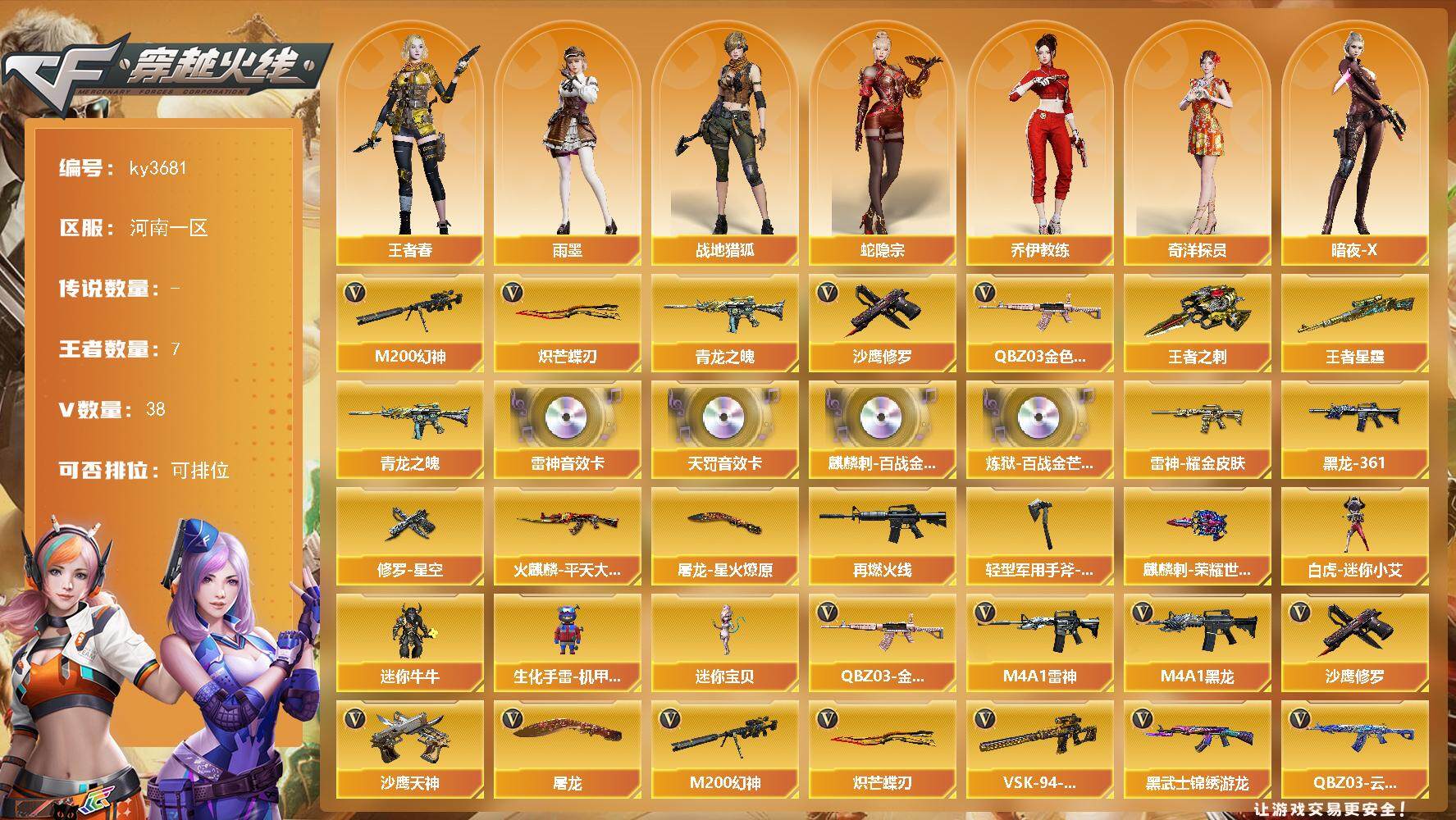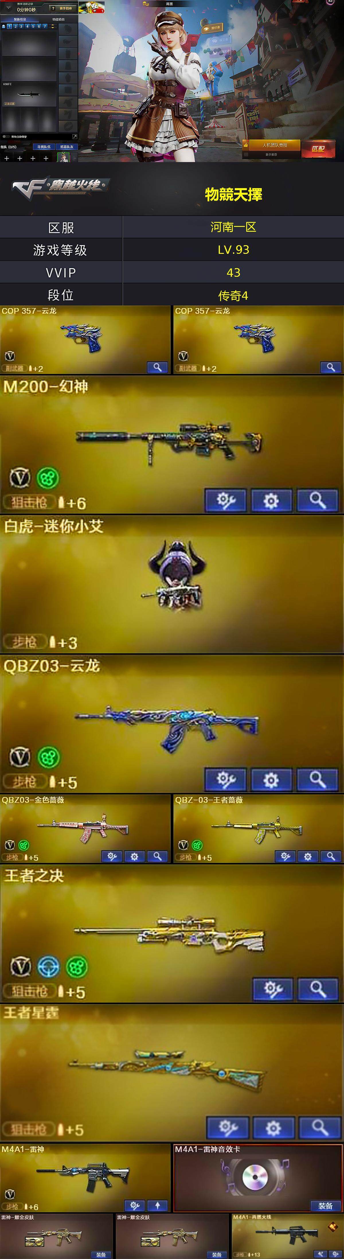 [13951482]河南一区-38V-7王者-0炫金 【热门武器】:QBZ03-金色蔷薇,M200-幻神,青龙之魄,沙鹰-修罗,炽芒蝶刃 【王者炫金武器】:青龙之魄,王者星霆,王者之刺*2 【音效卡】:M4A1-雷神音效卡,QBZ03-天罚音效卡,麒麟刺-百战金芒-盛典舞曲音效卡,炼狱-百战金芒-庆典舞曲音效卡 【皮肤】:雷神-耀金皮肤*2,M4A1-再燃火线,火麒麟-平天大圣,M4A1-黑龙-361,修罗-星空,屠龙-星火燎原,轻型军用手斧-再燃火线,麒麟刺-荣耀世冠白鲨 【角色】:雨墨,战地猎狐,王者春,蛇隐宗,奇洋探员,乔伊教练,暗夜-X,飞虎队-X,风暴女,麻雀,潘多拉-甜心教官,蛇姬,新娜塔莎,游珑儿 【人偶武器】:白虎-迷你小艾,迷你宝贝,迷你牛牛,生化手雷-机甲核心 【英雄级武器】:M4A1-黑龙,M4A1-雷神,QBZ03-云龙,黑武士-锦绣游龙,超新星-热带奇洋,QBZ03-金色蔷薇,QBZ-03-王者蔷薇-觉醒版,M200-幻神,VSK-94-金蚀,王者之决-觉醒版,炼狱-百战金芒,沙鹰-修罗,沙鹰-天神*4,COP 357-云龙*2,屠龙,炽芒蝶刃,龙啸-热带奇洋,麒麟刺-百战金芒,高爆手雷-云龙*4,手雷-热带奇洋,高爆手雷-古蛇迷踪,闪光弹-云龙*5,烟雾弹-云龙*4,烟雾弹-古蛇迷踪,M4A1-赤狱骑士 【道具】:亚洲杯纪念炫彩背包,奇洋探员-海龟背包,女皇终结者-背包,战舰背包,炫彩背包,热带奇洋炫彩背包,百战金芒炫彩背包,超级背包,女皇终结者-魔龙之吻,救世主-黑桃战神,绿色巨人,灵魂忍者,妖姬,迷雾幽灵*2,夺命之镰,防化服*2,金色流光-枪王排位*2,星辰流光-枪王排位,流光-再燃火线,枪王排位28赛季金色流光,语音特效-盛典烟火,萌萌小葵表情,热带奇洋表情,C4-红龙,防弹头盔*2,防弹衣*2,C4工具钳*2,手雷包*3 【特殊枪械】:
