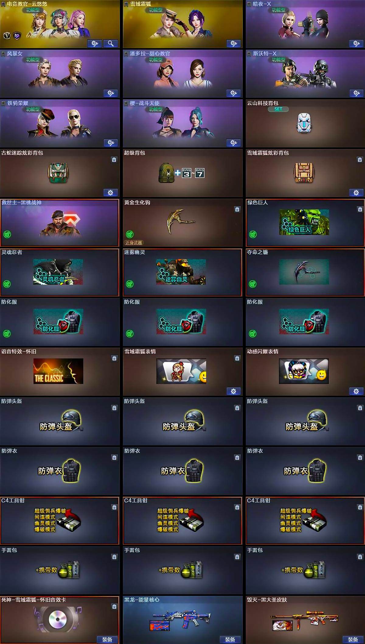 【道具】:云山科技背包,古蛇迷踪炫彩背包,超级背包,雪域霜狐炫彩背包,救世主-黑桃战神,黄金生化钩,绿色巨人,灵魂忍者,迷雾幽灵,夺命之镰,防化服*3,语音特效-怀旧,雪域霜狐表情,动感闪耀表情,防弹头盔*3,防弹衣*3,C4工具钳*3,手雷包*3