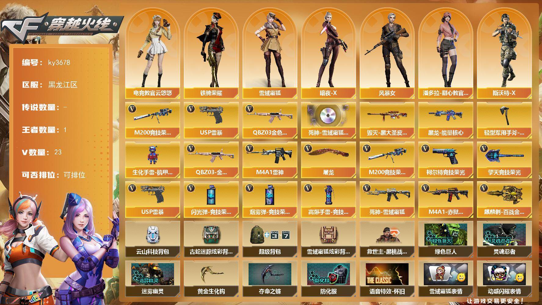 [13951728]黑龙江区-23V-1王者-0炫金 【热门武器】:QBZ03-金色蔷薇,M200-竞技荣光,USP-雷暴 【音效卡】:死神-雪域霜狐-怀旧音效卡 【皮肤】:毁灭-黑大圣皮肤,黑龙-能量核心,轻型军用手斧-再燃火线 【角色】:电竞教官-云悠悠,雪域霜狐,暗夜-X,风暴女,潘多拉-甜心教官,斯沃特-X,铁骑荣耀,樱-战斗天使 【人偶武器】:生化手雷-机甲核心 【英雄级武器】:M4A1-雷神,死神-雪域霜狐,QBZ03-金色蔷薇,M200-竞技荣光,USP-雷暴,柯尔特-竞技荣光,屠龙,擎天-竞技荣光,麒麟刺-百战金芒,高爆手雷-竞技荣光*4,闪光弹-竞技荣光*4,烟雾弹-竞技荣光*4,M4A1-赤狱骑士 【道具】:云山科技背包,古蛇迷踪炫彩背包,超级背包,雪域霜狐炫彩背包,救世主-黑桃战神,黄金生化钩,绿色巨人,灵魂忍者,迷雾幽灵,夺命之镰,防化服*3,语音特效-怀旧,雪域霜狐表情,动感闪耀表情,防弹头盔*3,防弹衣*3,C4工具钳*3,手雷包*3 【特殊枪械】: