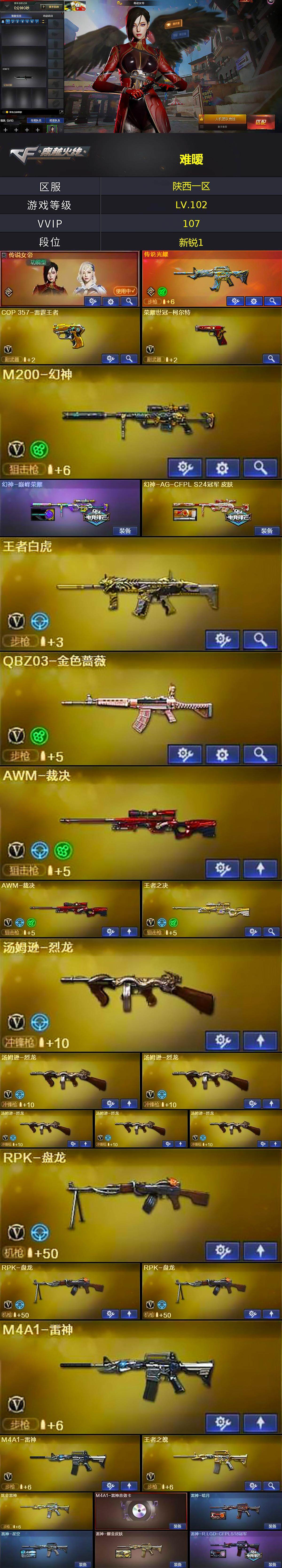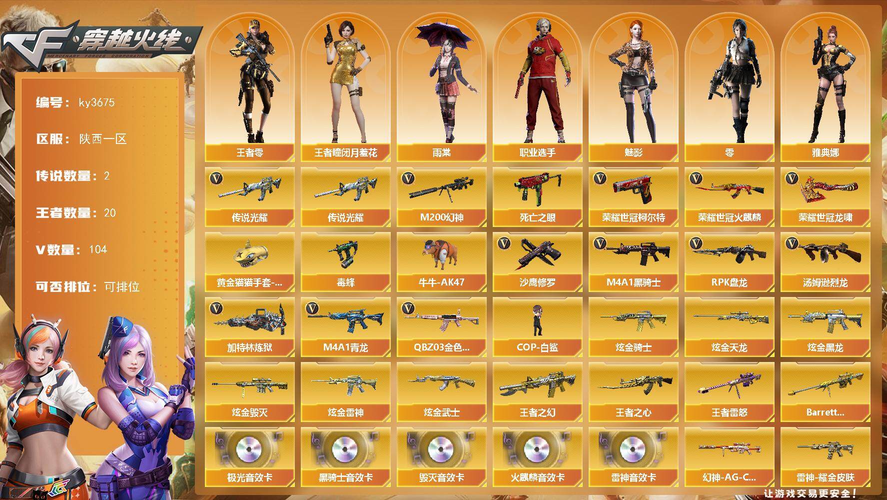 [13952196]陕西一区-104V-20王者-6炫金 【传说武器】:传说光耀 【传说角色】:传说女帝 【热门武器】:传说光耀,QBZ03-金色蔷薇,M4A1-青龙,M200-幻神,死亡之眼,荣耀世冠-火麒麟,荣耀世冠-柯尔特,毒蜂,牛牛-AK47,M4A1-黑骑士*3,汤姆逊-烈龙*6,RPK-盘龙*3,加特林-炼狱,COP-白鲨,沙鹰-修罗*3,荣耀世冠-龙啸,黄金猫猫手套-白鲨 【王者炫金武器】:王者之幻,王者之心,王者雷怒,Barrett-雷霆王者,炫金骑士,炫金黑龙,炫金雷神,炫金武士,炫金毁灭,炫金天龙 【音效卡】:AK47-火麒麟音效卡,M4A1-雷神音效卡,M4A1-黑骑士音效卡,Barrett-毁灭音效卡,Barrett-极光音效卡 【皮肤】:幻神-巅峰荣耀,幻神-AG-CFPL S24冠军 皮肤,雷神-暗月,雷神-星空,雷神-耀金皮肤,雷神-R.LGD-CFPLS18冠军,火麒麟-百城,火麒麟-大唐荣光,毁灭耀金皮肤,毁灭-黑大圣皮肤,毁灭-航天科技皮肤,毁灭-百城浙江 皮肤,黑龙-能量核心,黑骑士-暗月*2,黑骑士-破界 皮肤,无影-神兵利器 皮肤,天龙-秘银,极光-能量核心*2,天神-暗月*2,屠龙-春桃 皮肤,轻型军用手斧-再燃火线,龙啸-青青莓果 皮肤,麒麟刺-萌杀皮肤 【角色】:零,魅影,雨棠,王者-瞳-闭月羞花,王者-零,雪域霜狐,奇洋探员,乔伊教练,云海玲珑,空,北极狐-X,电竞少女,芳心审判者,风暴女,虎妞,嘉年华灵狐,娟娟,兰-海滩派对,兰妹妹,0号玩家,灵狐-花神,灵狐者-X,灵狐者-七夕宝贝,曼陀罗-X,萌儿,潘多拉-X,潘多拉-甜心教官,潜龙队-X,斯沃特-X,蜀雪,铁骑荣耀,兔囡囡,新娜塔莎,雪莉杨,雪莉杨-摸金校尉,夜玫瑰-幻能朋克,樱-战斗天使,职业选手,雅典娜 【人偶武器】:COP-白鲨,火麒麟-灵狐*2,AWM-灵狐-15周年嘉年华,牛牛-AK47,迷你裂空之翼,迷你牛魔王,迷你波特博士,迷你曼提柯尔,迷你牛牛,迷你火种,迷你生化手雷,深渊终结者手雷,迷你深渊冰龙-王绿豆,迷你巨石泰坦-魔花研究所 【暴走生化】:毒蜂,异变清道夫,死亡之眼,超级对讲机 【挑战大师】:神圣爆裂者III,冰龙粉碎者-白马银枪,激光毁灭者III-白马银枪*2,VEPR-12-金魔,激光毁灭者III*4,机甲撕裂者III,试炼破坏者III*2,神圣爆裂者