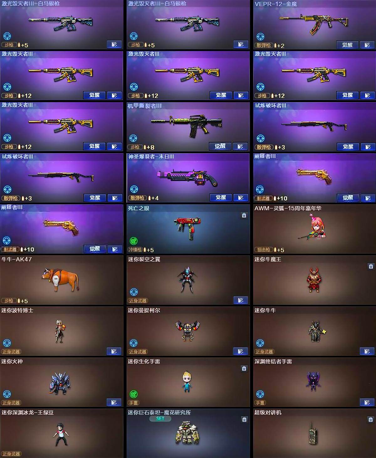 【人偶武器】:COP-白鲨,火麒麟-灵狐*2,AWM-灵狐-15周年嘉年华,牛牛-AK47,迷你裂空之翼,迷你牛魔王,迷你波特博士,迷你曼提柯尔,迷你牛牛,迷你火种,迷你生化手雷,深渊终结者手雷,迷你深渊冰龙-王绿豆,迷你巨石泰坦-魔花研究所