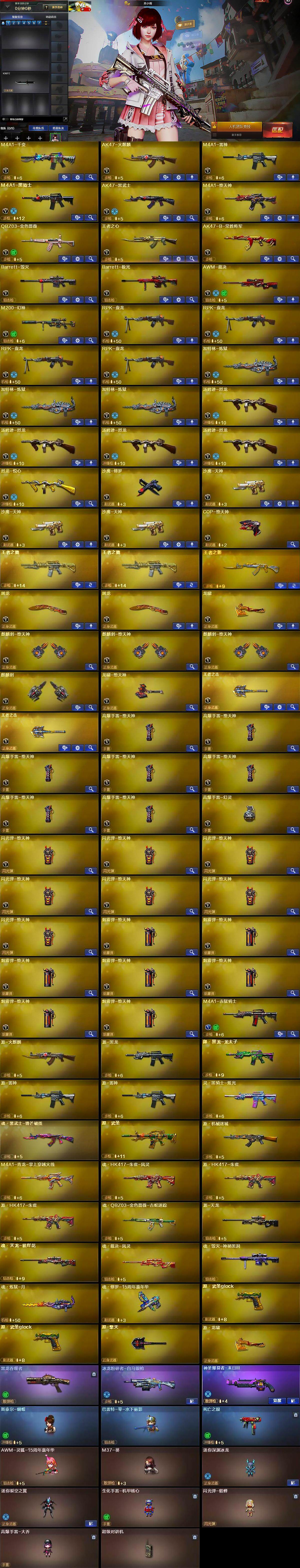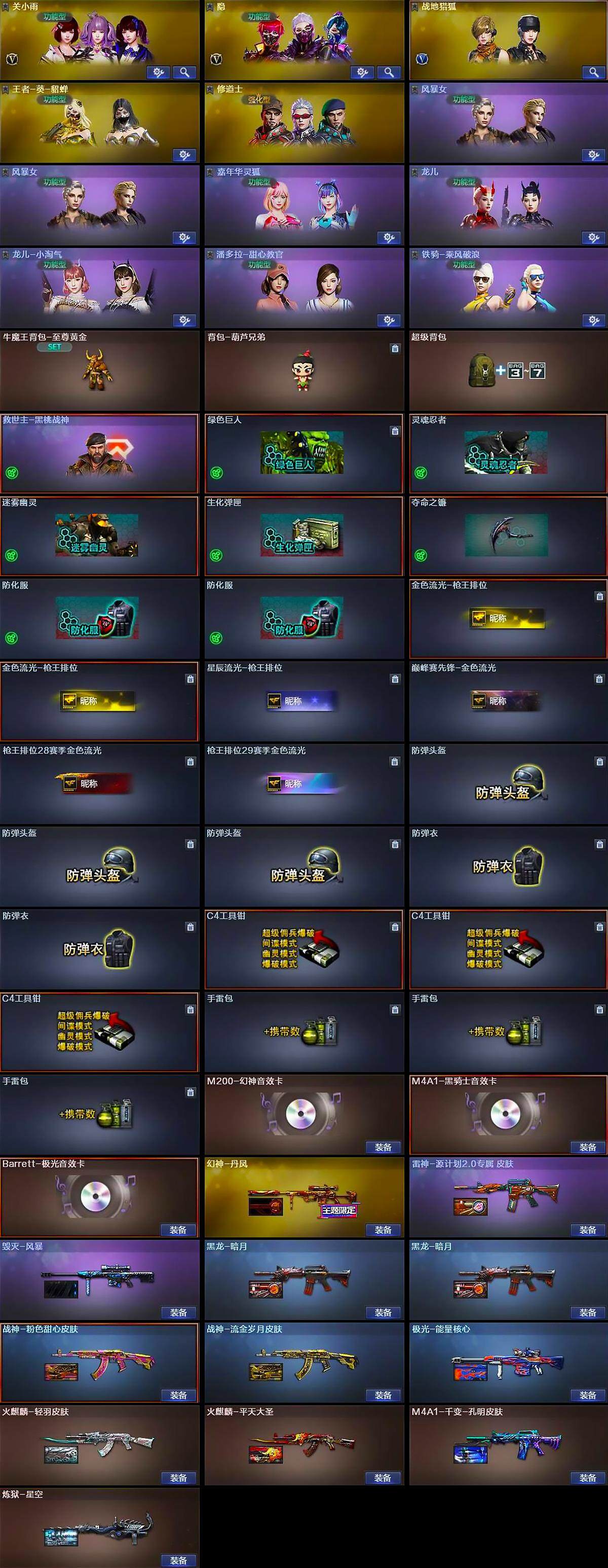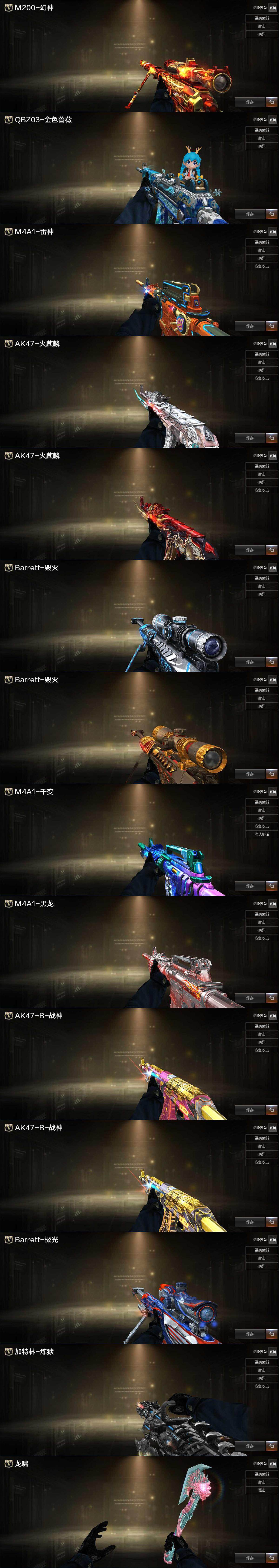 【英雄级武器】:M4A1-千变,AK47-火麒麟,M4A1-雷神,M4A1-黑骑士,AK47-黑武士,M4A1-堕天神,QBZ03-金色蔷薇,王者之心-觉醒版,AK47-B-常胜将军,Barrett-毁灭,Barrett-极光,AWM-裁决,M200-幻神,RPK-盘龙*4,加特林-炼狱*3,汤姆逊-烈龙*4,烈龙-悦心-觉醒版,沙鹰-修罗,沙鹰-天神*3,COP-堕天神,屠龙*2,龙啸,麒麟刺-堕天神*3,麒麟刺,龙啸-堕天神,王者之击-觉醒版*2,高爆手雷-堕天神*7,高爆手雷-幻灵,闪光弹-堕天神*7,烟雾弹-堕天神*7,烟雾弹-荣耀世冠EP*2,M4A1-赤狱骑士