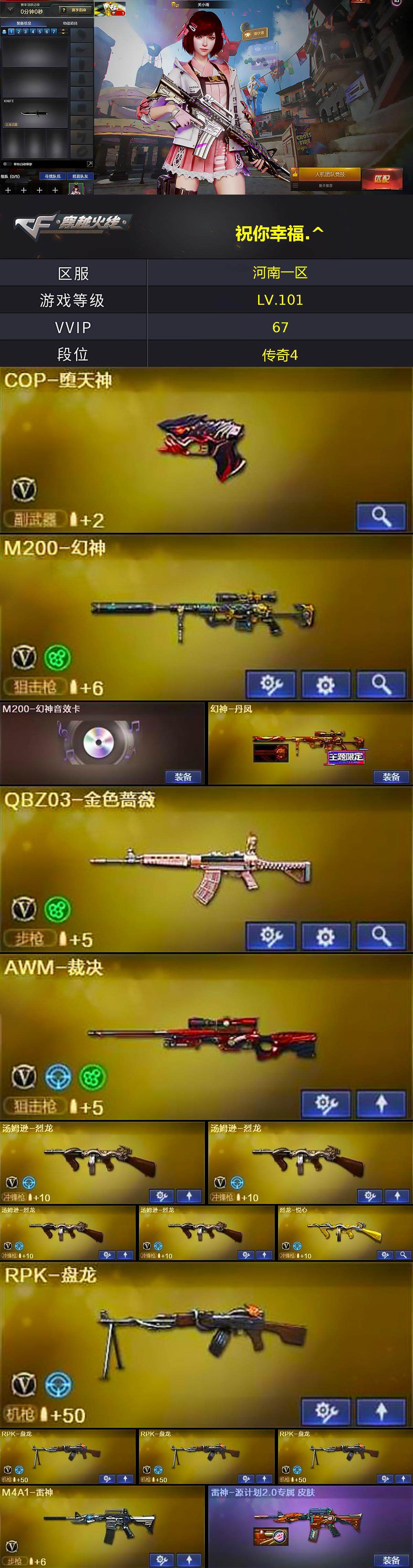 【热门武器】:QBZ03-金色蔷薇,M200-幻神,死亡之眼,M4A1-黑骑士,汤姆逊-烈龙*4,RPK-盘龙*4,加特林-炼狱*3,斯泰尔-蝴蝶,羊驼玩偶,COP-堕天神,沙鹰-修罗,金刚伞