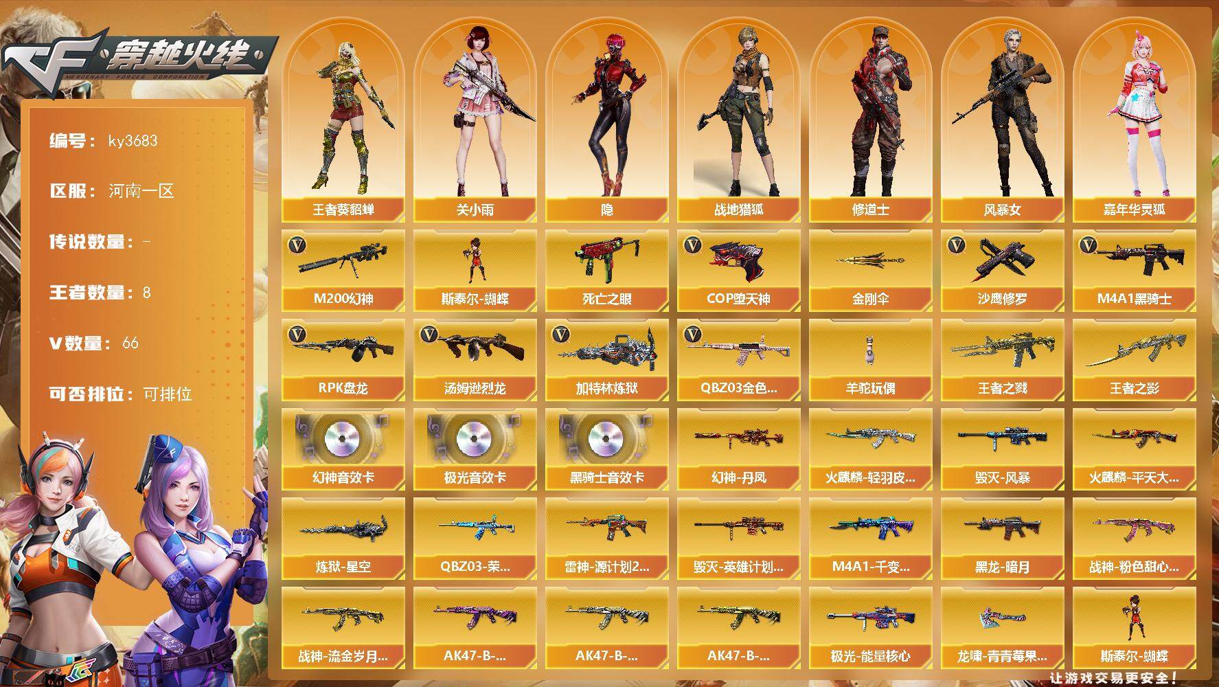 [13952105]河南一区-66V-8王者-0炫金 【热门武器】:QBZ03-金色蔷薇,M200-幻神,死亡之眼,M4A1-黑骑士,汤姆逊-烈龙*4,RPK-盘龙*4,加特林-炼狱*3,斯泰尔-蝴蝶,羊驼玩偶,COP-堕天神,沙鹰-修罗,金刚伞 【王者炫金武器】:王者之戮*2,王者之影 【音效卡】:M200-幻神音效卡,M4A1-黑骑士音效卡,Barrett-极光音效卡 【皮肤】:幻神-丹凤,QBZ03-荣耀世冠EP 皮肤,雷神-源计划2.0专属 皮肤,火麒麟-轻羽皮肤,火麒麟-平天大圣,毁灭-风暴,毁灭-英雄计划 皮肤,M4A1-千变-孔明皮肤,黑龙-暗月*2,战神-粉色甜心皮肤,战神-流金岁月皮肤,AK47-B-常胜将军-曹操,AK47-B-常胜将军-刘备,AK47-B-常胜将军-孙权*2,极光-能量核心,炼狱-星空,龙啸-青青莓果 皮肤 【角色】:关小雨,隐,战地猎狐,王者-葵-貂蝉,修道士,风暴女*2,嘉年华灵狐,龙儿,龙儿-小淘气,潘多拉-甜心教官,铁骑-乘风破浪 【人偶武器】:斯泰尔-蝴蝶,巴雷特-零-水下丽影,AWM-灵狐-15周年嘉年华,M37-葵,迷你深渊冰龙,迷你裂空之翼,生化手雷-机甲核心,闪光弹-貂蝉,高爆手雷-大乔,灵狐娃娃手雷 【暴走生化】:黑龙吞噬者,死亡之眼,超级对讲机 【挑战大师】:冰龙粉碎者-白马银枪,神圣爆裂者-末日III 【英雄级武器】:M4A1-千变,AK47-火麒麟,M4A1-雷神,M4A1-黑骑士,AK47-黑武士,M4A1-堕天神,QBZ03-金色蔷薇,王者之心-觉醒版,AK47-B-常胜将军,Barrett-毁灭,Barrett-极光,AWM-裁决,M200-幻神,RPK-盘龙*4,加特林-炼狱*3,汤姆逊-烈龙*4,烈龙-悦心-觉醒版,沙鹰-修罗,沙鹰-天神*3,COP-堕天神,屠龙*2,龙啸,麒麟刺-堕天神*3,麒麟刺,龙啸-堕天神,王者之击-觉醒版*2,高爆手雷-堕天神*7,高爆手雷-幻灵,闪光弹-堕天神*7,烟雾弹-堕天神*7,烟雾弹-荣耀世冠EP*2,M4A1-赤狱骑士 【道具】:牛魔王背包-至尊黄金,背包-葫芦兄弟,超级背包,救世主-黑桃战神,绿色巨人,灵魂忍者,迷雾幽灵,生化弹匣,夺命之镰,防化服*2,金色流光-枪王排位*2,星辰流光-枪王排位,巅峰赛先锋-金色流光,枪王排位28赛季金色流光,枪王排位29赛季金色流光,