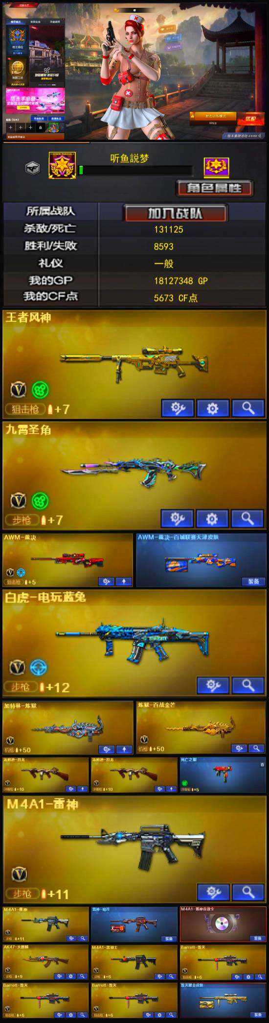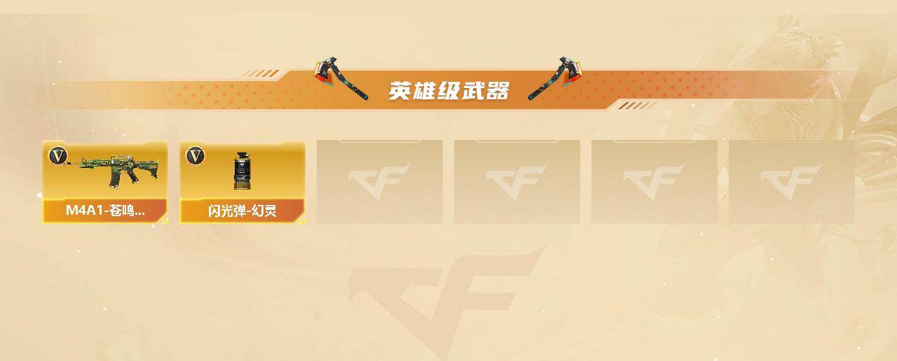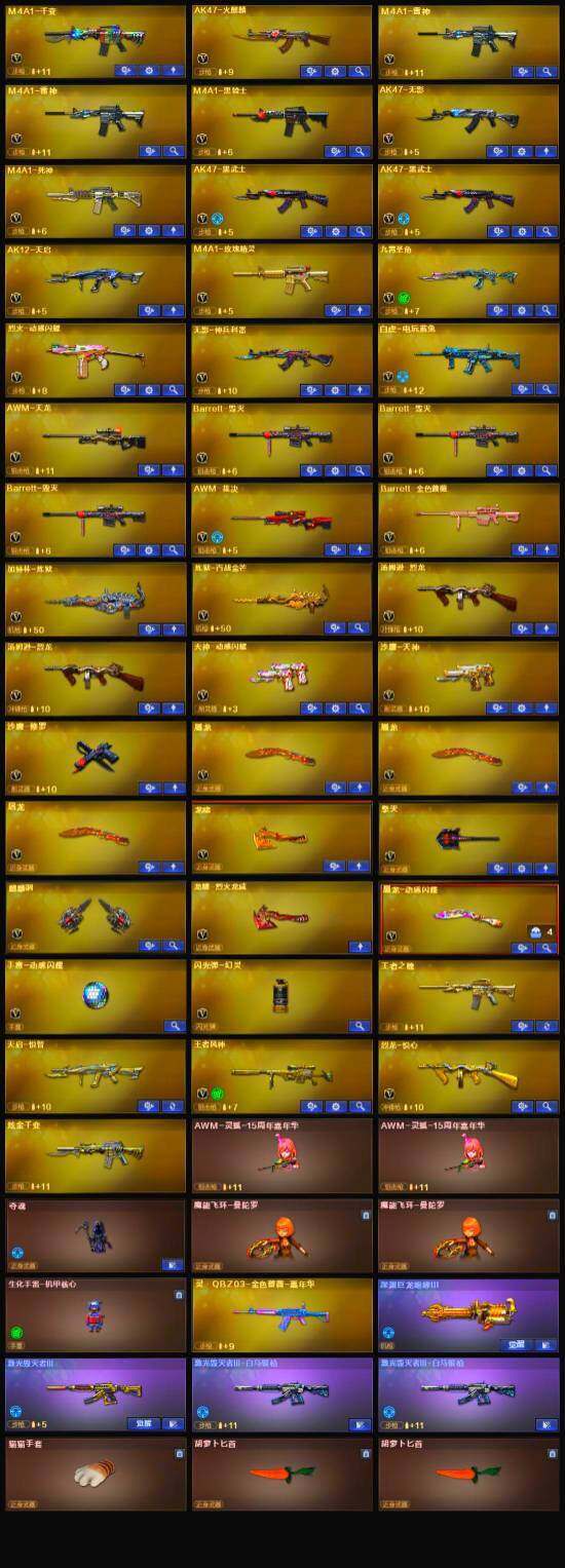 【英雄级武器】:M4A1-千变,AK47-火麒麟,M4A1-雷神*2,M4A1-黑骑士,AK47-无影,M4A1-死神,AK47-黑武士*2,AK12-天启,无影-神兵利器,九霄圣角,M4A1-玫瑰精灵,烈火-动感闪耀,白虎-电玩蓝兔,AWM-天龙,Barrett-毁灭*3,AWM-裁决,Barrett-金色蔷薇,加特林-炼狱,炼狱-百战金芒,汤姆逊-烈龙*2,沙鹰-修罗,沙鹰-天神,天神-动感闪耀,屠龙*3,龙啸,擎天,麒麟刺,屠龙-动感闪耀,麒麟刺-百战金芒,手雷-动感闪耀,闪光弹-幻灵,M4A1-苍鸣雷神