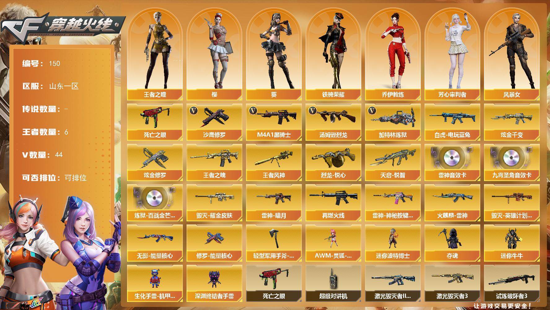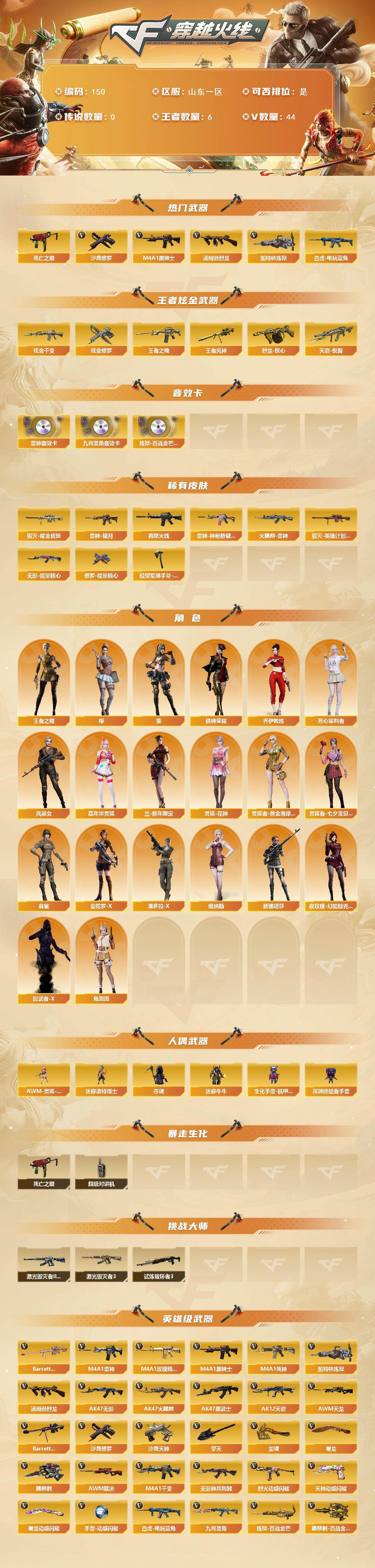 [13952419]山东一区-44V-6王者-2炫金 【热门武器】:死亡之眼,白虎-电玩蓝兔,M4A1-黑骑士,汤姆逊-烈龙*2,加特林-炼狱,沙鹰-修罗 【王者炫金武器】:天启-悦智,王者之魄,王者风神,烈龙-悦心,炫金千变,炫金修罗 【音效卡】:M4A1-雷神音效卡,九霄圣角音效卡,炼狱-百战金芒-庆典舞曲音效卡 【皮肤】:雷神-暗月,M4A1-再燃火线,雷神-神秘按键 皮肤,火麒麟-雷神,毁灭耀金皮肤,毁灭-英雄计划 皮肤,无影-能量核心,修罗-能量核心,轻型军用手斧-再燃火线 【角色】:葵,樱,王者之瞳,乔伊教练,芳心审判者,风暴女,嘉年华灵狐,兰-新年限定,灵狐-花神,灵狐者-黄金海岸,灵狐者-七夕宝贝,麻雀,曼陀罗-X,潘多拉-X,铁骑荣耀,兔囡囡,维纳斯,新娜塔莎,夜玫瑰-幻能朋克,影武者-X 【人偶武器】:AWM-灵狐-15周年嘉年华*2,迷你波特博士,夺魂,迷你牛牛,生化手雷-机甲核心,深渊终结者手雷 【暴走生化】:死亡之眼,超级对讲机 【挑战大师】:激光毁灭者III-白马银枪*2,激光毁灭者III,试炼破坏者III 【英雄级武器】:M4A1-千变,AK47-火麒麟,M4A1-雷神*2,M4A1-黑骑士,AK47-无影,M4A1-死神,AK47-黑武士*2,AK12-天启,无影-神兵利器,九霄圣角,M4A1-玫瑰精灵,烈火-动感闪耀,白虎-电玩蓝兔,AWM-天龙,Barrett-毁灭*3,AWM-裁决,Barrett-金色蔷薇,加特林-炼狱,炼狱-百战金芒,汤姆逊-烈龙*2,沙鹰-修罗,沙鹰-天神,天神-动感闪耀,屠龙*3,龙啸,擎天,麒麟刺,屠龙-动感闪耀,麒麟刺-百战金芒,手雷-动感闪耀,闪光弹-幻灵,M4A1-苍鸣雷神 【道具】:亚洲杯纪念炫彩背包,战舰背包,百战金芒炫彩背包,女皇终结者-魔龙之吻,绿色巨人,灵魂忍者,迷雾幽灵*2,夺命之镰,防化服*2,金色流光-枪王排位*2,星辰流光-枪王排位,枪王排位28赛季金色流光,语音特效-盛典烟火,语音特效-机器人,语音特效-生化,萌萌小葵表情,动感闪耀表情,防弹头盔*2,防弹衣*2,C4工具钳*2,手雷包*2 【特殊枪械】:1黑骑士,2烈龙,1炼狱