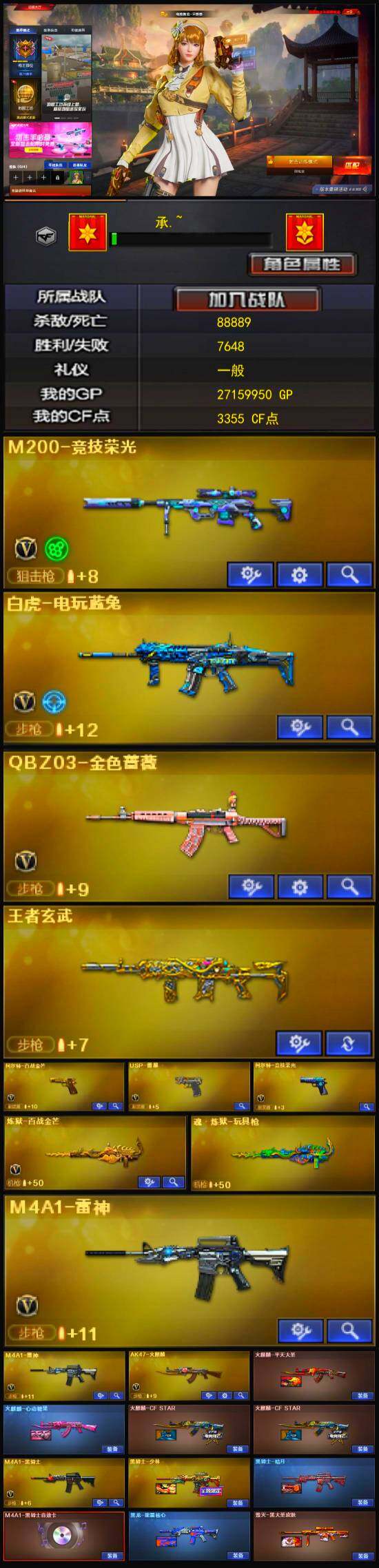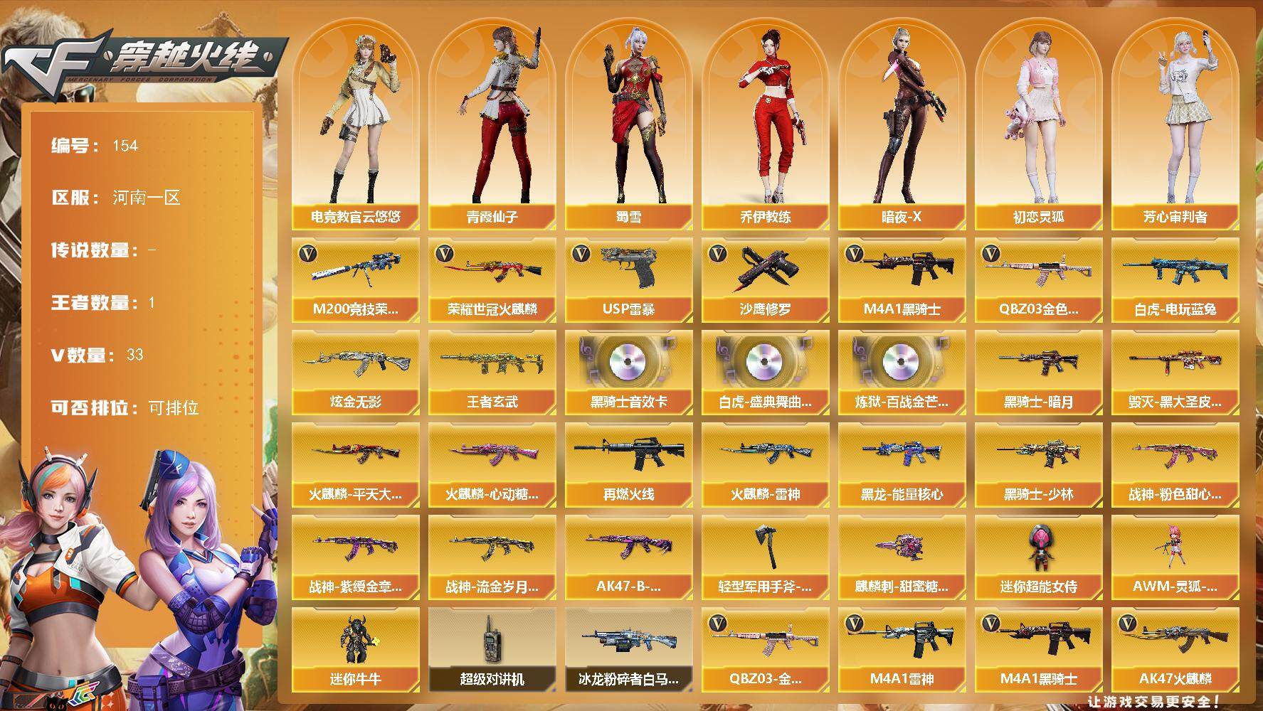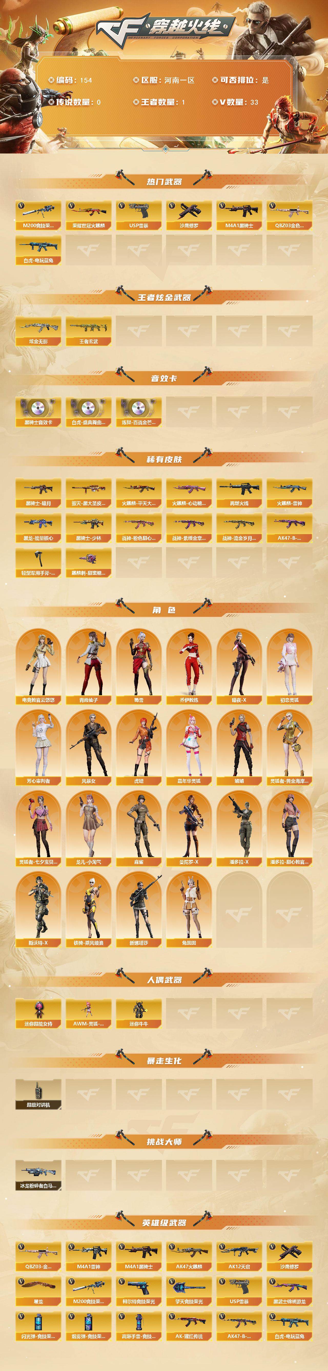 [13953101]河南一区-33V-1王者-1炫金 【热门武器】:QBZ03-金色蔷薇,M200-竞技荣光,荣耀世冠-火麒麟,白虎-电玩蓝兔,M4A1-黑骑士,USP-雷暴,沙鹰-修罗 【王者炫金武器】:王者玄武,炫金无影 【音效卡】:M4A1-黑骑士音效卡,白虎-盛典舞曲音效卡,炼狱-百战金芒-庆典舞曲音效卡 【皮肤】:M4A1-再燃火线,火麒麟-雷神,火麒麟-平天大圣,火麒麟-心动糖果,毁灭-黑大圣皮肤,黑龙-能量核心,黑骑士-暗月,黑骑士-少林,战神-粉色甜心皮肤,战神-紫绶金章皮肤,战神-流金岁月皮肤,AK47-B-常胜将军-曹操,轻型军用手斧-再燃火线,麒麟刺-甜蜜糖果 皮肤 【角色】:电竞教官-云悠悠,乔伊教练,暗夜-X,初恋灵狐,芳心审判者,风暴女*2,虎妞,嘉年华灵狐,娟娟,灵狐者-黄金海岸,灵狐者-七夕宝贝,龙儿-小淘气,麻雀,曼陀罗-X,潘多拉-X,潘多拉-甜心教官,青霞仙子,斯沃特-X,蜀雪,铁骑-乘风破浪,兔囡囡,新娜塔莎 【人偶武器】:AWM-灵狐-15周年嘉年华,迷你牛牛,迷你超能女侍 【暴走生化】:超级对讲机 【挑战大师】:冰龙粉碎者-白马银枪*3 【英雄级武器】:AK47-火麒麟,M4A1-雷神*2,M4A1-黑骑士,AK12-天启,黑武士-锦绣游龙,QBZ03-金色蔷薇,AK-47-猩红传说,AK47-B-战神*2,白虎-电玩蓝兔,荣耀世冠-火麒麟,M200-竞技荣光,炼狱-百战金芒,沙鹰-修罗,USP-雷暴,柯尔特-竞技荣光,柯尔特-百战金芒,屠龙,擎天-竞技荣光,麒麟刺-百战金芒,高爆手雷-竞技荣光,闪光弹-竞技荣光,闪光弹-玄豹,烟雾弹-竞技荣光,烟雾弹-玄豹 【道具】:BS战队炫彩背包,CFS限定背包,百战金芒炫彩背包,虎牙炫彩背包,超级背包,女皇终结者-魔龙之吻,绿色巨人,灵魂忍者*2,变异宝贝,妖姬,迷雾幽灵,夺命之镰,防化服*3,金色流光-枪王排位*2,星辰流光-枪王排位,流光-鎏金之域,枪王排位28赛季金色流光,枪王排位29赛季金色流光,语音特效-盛典烟火,萌萌小葵表情,电玩兔兔表情,防弹头盔*5,防弹衣*5,C4工具钳*4,手雷包*4 【特殊枪械】:1黑骑士