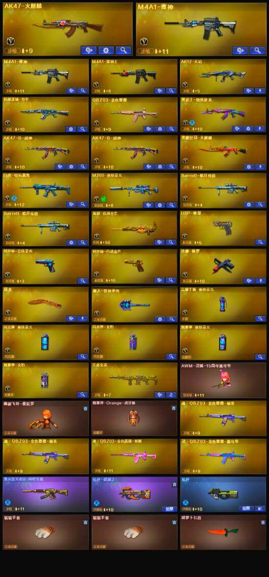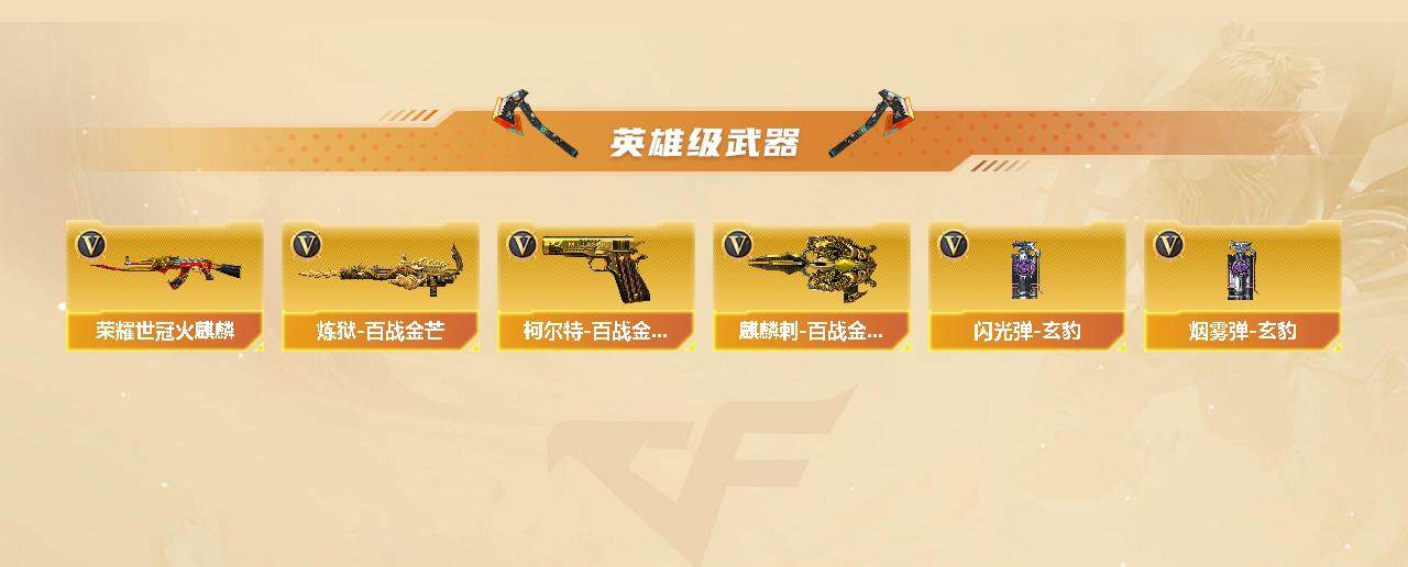 【英雄级武器】:AK47-火麒麟,M4A1-雷神*2,M4A1-黑骑士,AK12-天启,黑武士-锦绣游龙,QBZ03-金色蔷薇,AK-47-猩红传说,AK47-B-战神*2,白虎-电玩蓝兔,荣耀世冠-火麒麟,M200-竞技荣光,炼狱-百战金芒,沙鹰-修罗,USP-雷暴,柯尔特-竞技荣光,柯尔特-百战金芒,屠龙,擎天-竞技荣光,麒麟刺-百战金芒,高爆手雷-竞技荣光,闪光弹-竞技荣光,闪光弹-玄豹,烟雾弹-竞技荣光,烟雾弹-玄豹