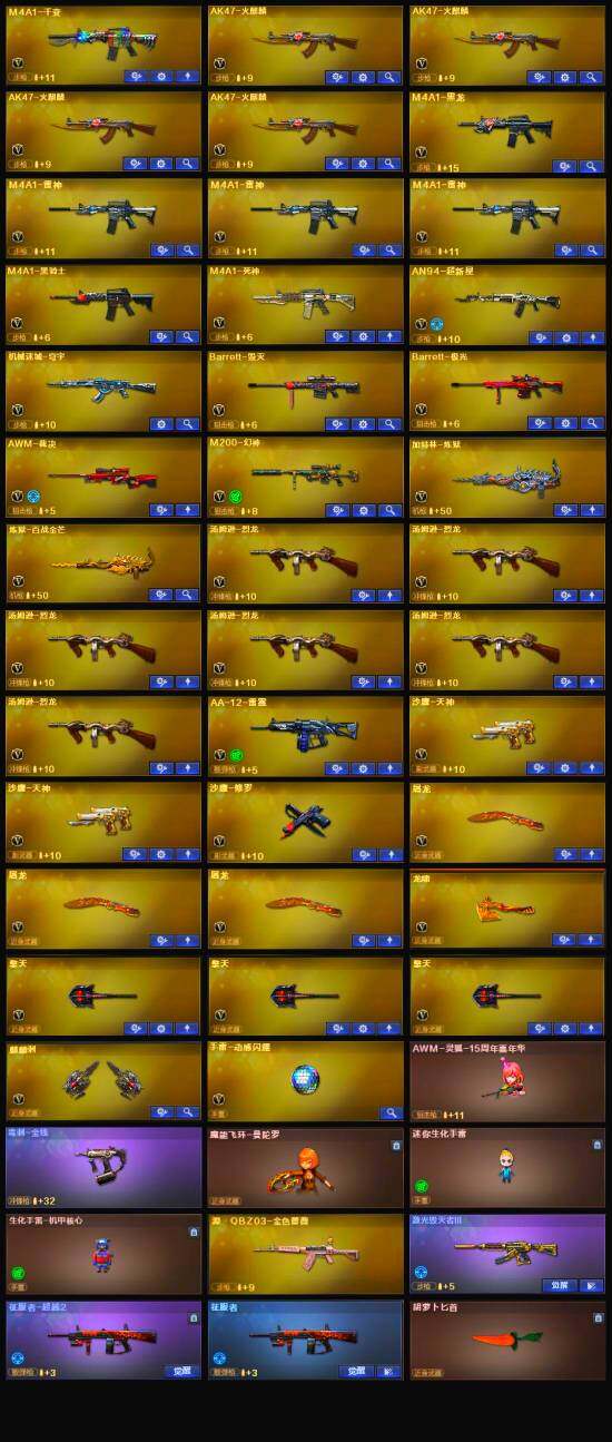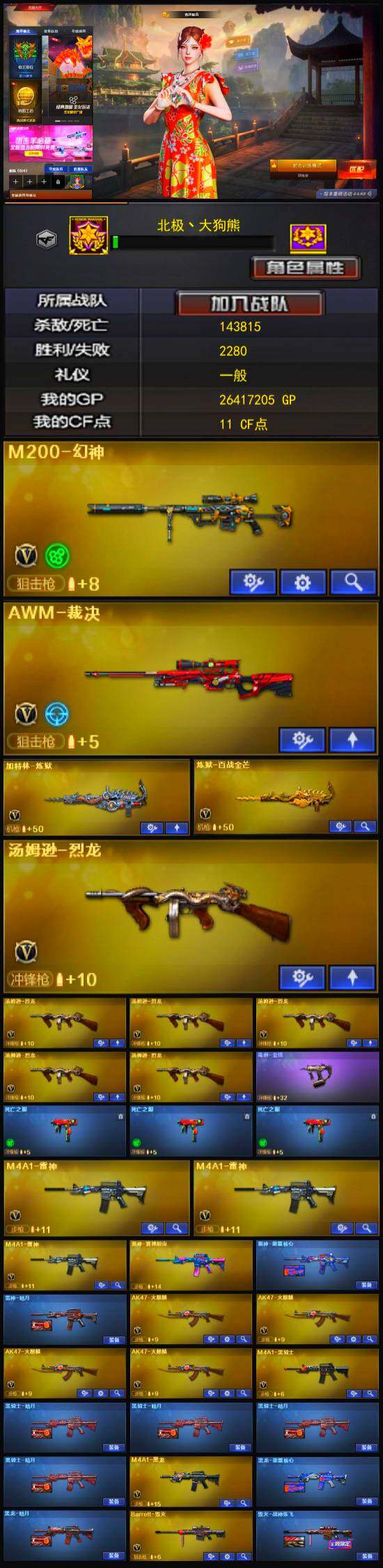 【英雄级武器】:M4A1-千变,AK47-火麒麟*4,M4A1-黑龙,M4A1-雷神*3,M4A1-黑骑士,M4A1-死神,AN94-超新星,Barrett-毁灭,Barrett-极光,AWM-裁决,M200-幻神,加特林-炼狱,炼狱-百战金芒,汤姆逊-烈龙*6,AA-12-雷霆,沙鹰-修罗,沙鹰-天神*2,屠龙*3,龙啸,擎天*3,麒麟刺,麒麟刺-百战金芒,手雷-动感闪耀,M4A1-赤狱骑士