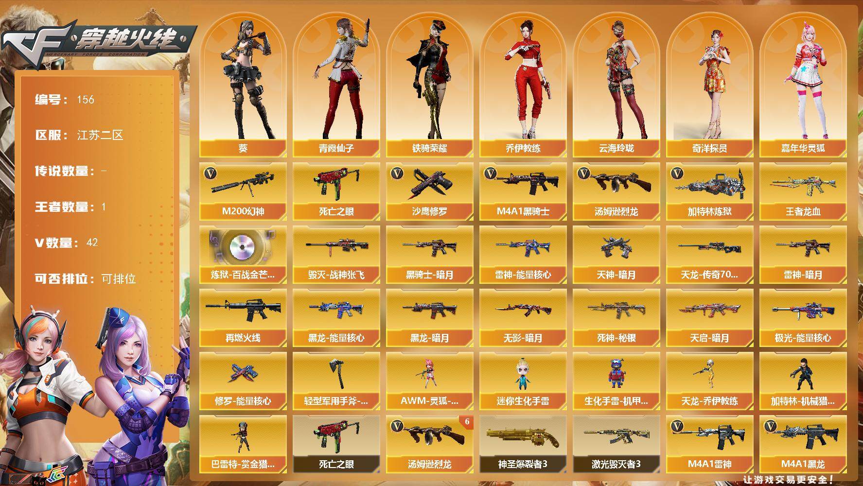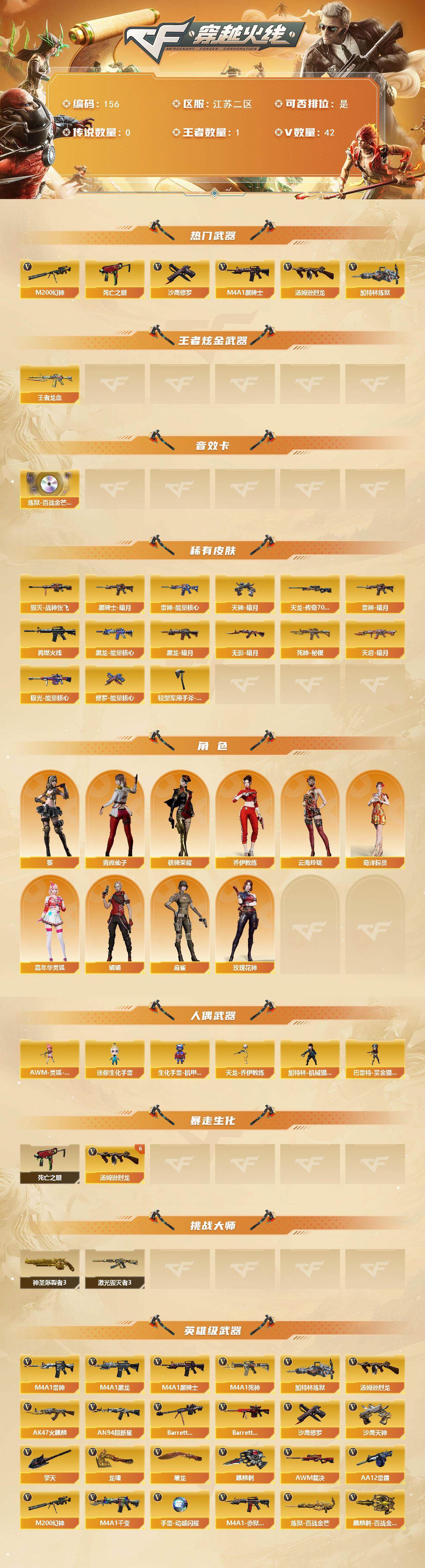[13953551]江苏二区-42V-1王者-0炫金 【热门武器】:M200-幻神,死亡之眼*3,M4A1-黑骑士,汤姆逊-烈龙*6,加特林-炼狱,沙鹰-修罗 【王者炫金武器】:王者龙血 【音效卡】:炼狱-百战金芒-庆典舞曲音效卡 【皮肤】:雷神-暗月,雷神-能量核心,M4A1-再燃火线,毁灭-战神张飞,黑龙-能量核心,黑龙-暗月,黑骑士-暗月*4,无影-暗月*2,死神-秘银*6,天启-暗月,AWM-天龙-传奇70KG,极光-能量核心*2,修罗-能量核心,天神-暗月*2,轻型军用手斧-再燃火线 【角色】:葵,奇洋探员,乔伊教练,云海玲珑,嘉年华灵狐,娟娟,麻雀,玫瑰花神,青霞仙子,铁骑荣耀 【人偶武器】:天龙-乔伊教练,加特林-机械猎手,AWM-灵狐-15周年嘉年华,迷你生化手雷,生化手雷-机甲核心,巴雷特-赏金猎人 【暴走生化】:死亡之眼*3 【挑战大师】:神圣爆裂者III,激光毁灭者III 【英雄级武器】:M4A1-千变,AK47-火麒麟*4,M4A1-黑龙,M4A1-雷神*3,M4A1-黑骑士,M4A1-死神,AN94-超新星,Barrett-毁灭,Barrett-极光,AWM-裁决,M200-幻神,加特林-炼狱,炼狱-百战金芒,汤姆逊-烈龙*6,AA-12-雷霆,沙鹰-修罗,沙鹰-天神*2,屠龙*3,龙啸,擎天*3,麒麟刺,麒麟刺-百战金芒,手雷-动感闪耀,M4A1-赤狱骑士 【道具】:云山科技背包,亚洲杯纪念炫彩背包,奇洋探员-海龟背包,炫彩背包,百战金芒炫彩背包,女皇终结者-魔龙之吻,救世主-黑桃战神,绿色巨人,灵魂忍者,迷雾幽灵,夺命之镰,防化服*3,金色流光-枪王排位*2,星辰流光-枪王排位,枪王排位28赛季金色流光,枪王排位29赛季金色流光,语音特效-盛典烟火,萌萌小葵表情,C4-红龙,防弹头盔*5,防弹衣*4,C4工具钳*5,手雷包*5 【特殊枪械】:1黑骑士,6烈龙,1炼狱