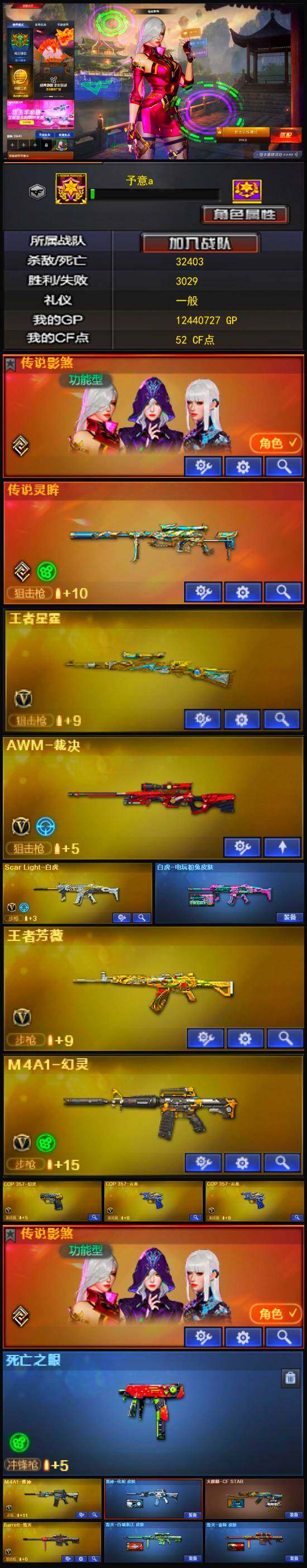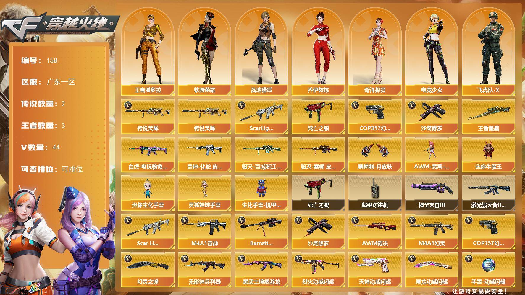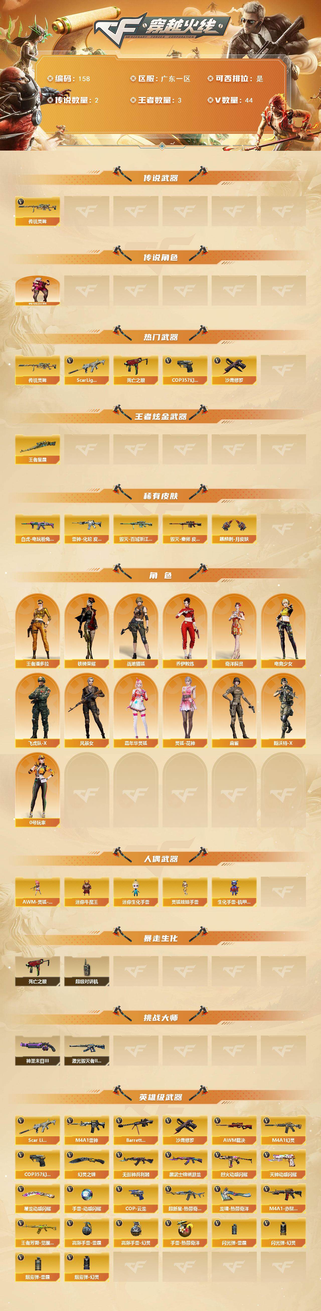 [13953962]广东一区-44V-3王者-0炫金 【传说武器】:传说灵眸 【传说角色】:传说影煞 【热门武器】:传说灵眸,Scar Light-白虎,死亡之眼,COP 357-幻灵,沙鹰-修罗 【王者炫金武器】:王者星霆 【皮肤】:白虎-电玩粉兔皮肤,雷神-化蛇 皮肤,毁灭-百城浙江 皮肤,毁灭-秦师 皮肤,麒麟刺-月皮肤 【角色】:战地猎狐,王者潘多拉,奇洋探员,乔伊教练,电竞少女,飞虎队-X,风暴女,嘉年华灵狐,0号玩家,灵狐-花神,麻雀,斯沃特-X,铁骑荣耀 【人偶武器】:AWM-灵狐-15周年嘉年华,迷你牛魔王,迷你生化手雷,生化手雷-机甲核心,灵狐娃娃手雷 【暴走生化】:死亡之眼,超级对讲机 【挑战大师】:激光毁灭者III-白马银枪,神圣爆裂者-末日III 【英雄级武器】:M4A1-雷神,Scar Light-白虎,M4A1-幻灵,无影-神兵利器,黑武士-锦绣游龙,超新星-热带奇洋,烈火-动感闪耀,王者芳薇-觉醒版,Barrett-毁灭,AWM-裁决,沙鹰-修罗,COP 357-幻灵,COP 357-云龙*2,天神-动感闪耀,幻灵之锋,屠龙-动感闪耀,龙啸-热带奇洋,高爆手雷-雷霆,高爆手雷-幻灵*7,手雷-动感闪耀,手雷-热带奇洋,闪光弹-雷霆,闪光弹-幻灵*7,烟雾弹-雷霆,烟雾弹-幻灵*7,M4A1-赤狱骑士 【道具】:CFS限定背包,云山科技背包,亚洲杯纪念炫彩背包,全能枪王背包,奇洋探员-海龟背包,热带奇洋炫彩背包,老虎背包,女皇终结者-魔龙之吻,救世主-黑桃战神,绿色巨人,灵魂忍者*2,变异宝贝,迷雾幽灵*2,生化弹匣,夺命之镰,防化服*3,金色流光-枪王排位*2,巅峰赛先锋-金色流光,枪王排位28赛季金色流光,枪王排位29赛季金色流光,热带奇洋表情,动感闪耀表情,防弹头盔*5,防弹衣*5,C4工具钳*5,手雷包*5 【特殊枪械】:1白虎