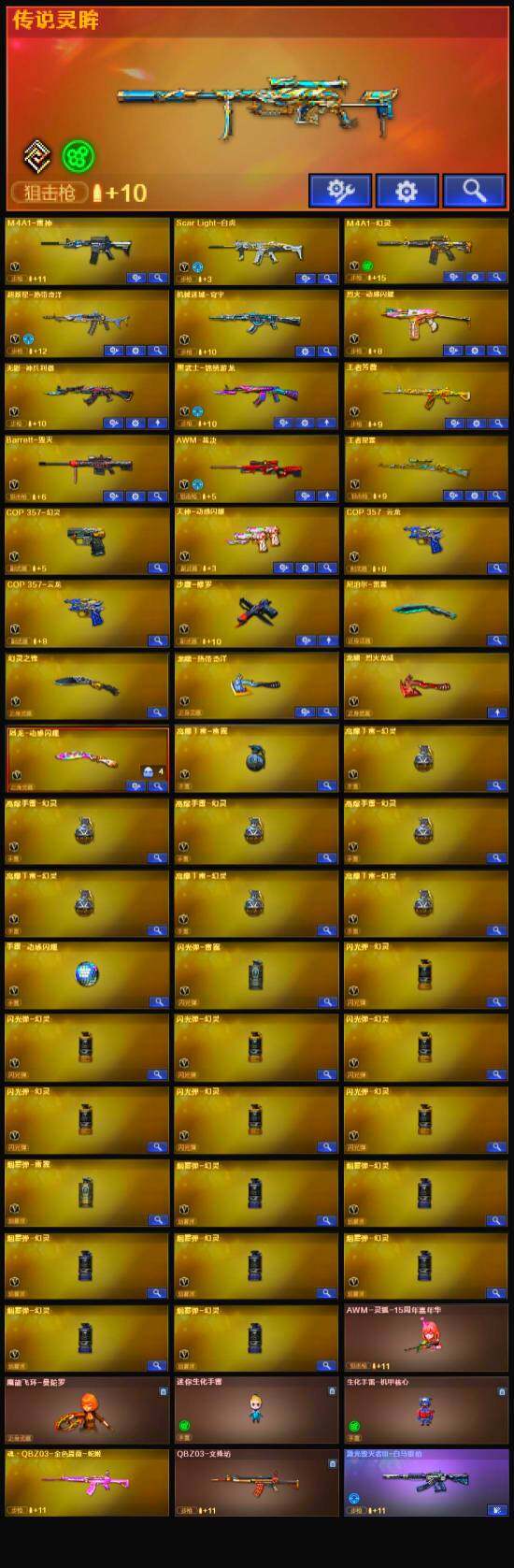 【英雄级武器】:M4A1-雷神,Scar Light-白虎,M4A1-幻灵,无影-神兵利器,黑武士-锦绣游龙,超新星-热带奇洋,烈火-动感闪耀,王者芳薇-觉醒版,Barrett-毁灭,AWM-裁决,沙鹰-修罗,COP 357-幻灵,COP 357-云龙*2,天神-动感闪耀,幻灵之锋,屠龙-动感闪耀,龙啸-热带奇洋,高爆手雷-雷霆,高爆手雷-幻灵*7,手雷-动感闪耀,手雷-热带奇洋,闪光弹-雷霆,闪光弹-幻灵*7,烟雾弹-雷霆,烟雾弹-幻灵*7,M4A1-赤狱骑士