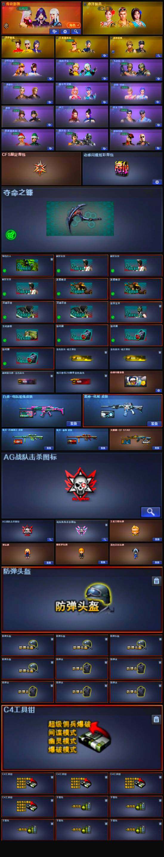 【道具】:CFS限定背包,云山科技背包,亚洲杯纪念炫彩背包,全能枪王背包,奇洋探员-海龟背包,热带奇洋炫彩背包,老虎背包,女皇终结者-魔龙之吻,救世主-黑桃战神,绿色巨人,灵魂忍者*2,变异宝贝,迷雾幽灵*2,生化弹匣,夺命之镰,防化服*3,金色流光-枪王排位*2,巅峰赛先锋-金色流光,枪王排位28赛季金色流光,枪王排位29赛季金色流光,热带奇洋表情,动感闪耀表情,防弹头盔*5,防弹衣*5,C4工具钳*5,手雷包*5