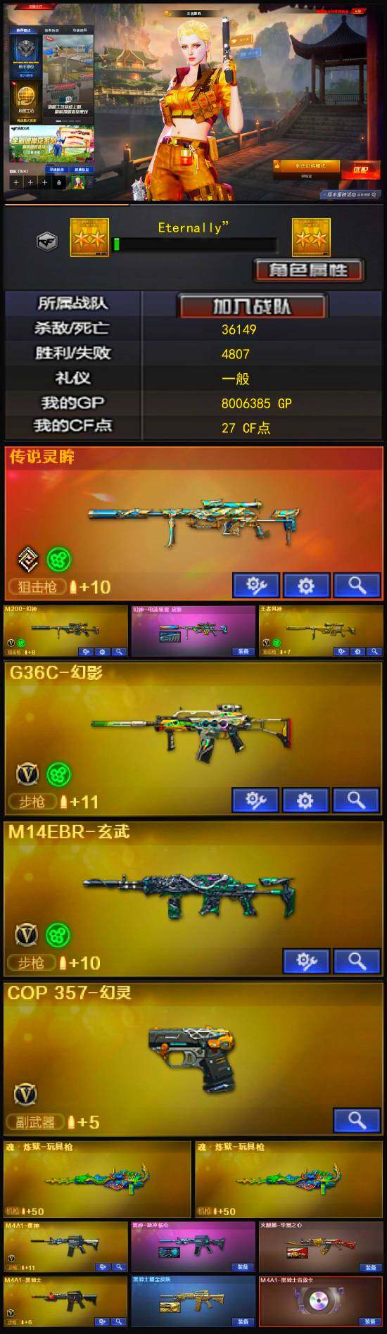 【热门武器】:传说灵眸,G36C-幻影,M14EBR-玄武,M200-幻神,M4A1-黑骑士,COP 357-幻灵