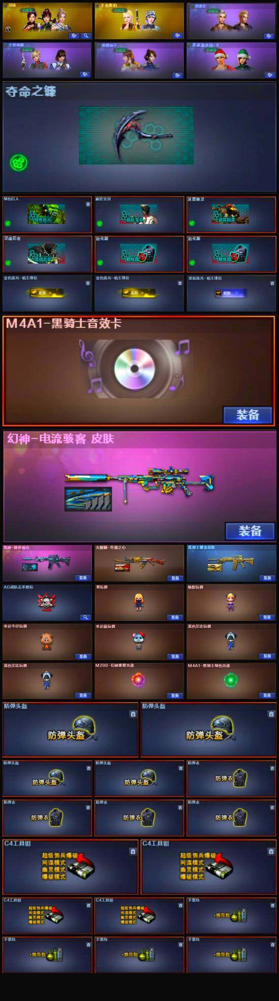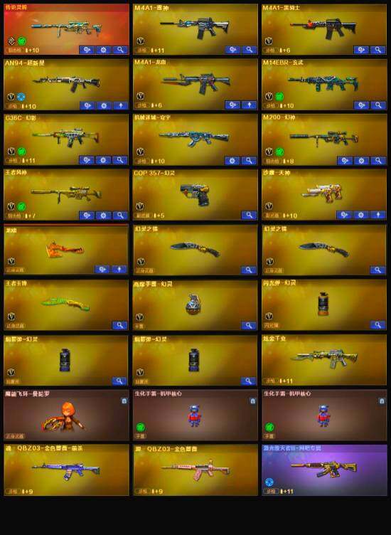 【英雄级武器】:M4A1-雷神,M4A1-黑骑士,AN94-超新星,M4A1-龙血,M14EBR-玄武,G36C-幻影,M200-幻神,王者风神-觉醒版,沙鹰-天神,COP 357-幻灵,龙啸,幻灵之锋*2,高爆手雷-幻灵,闪光弹-幻灵,烟雾弹-幻灵*2,M4A1-赤狱骑士