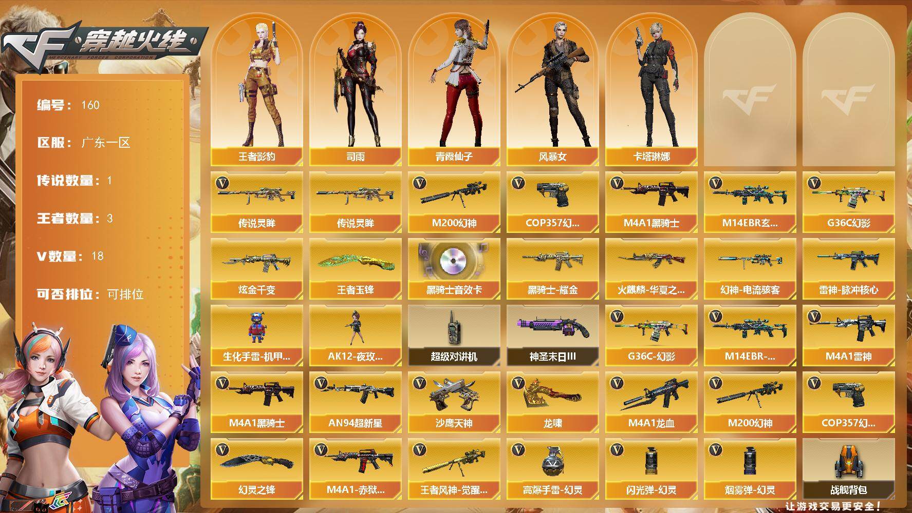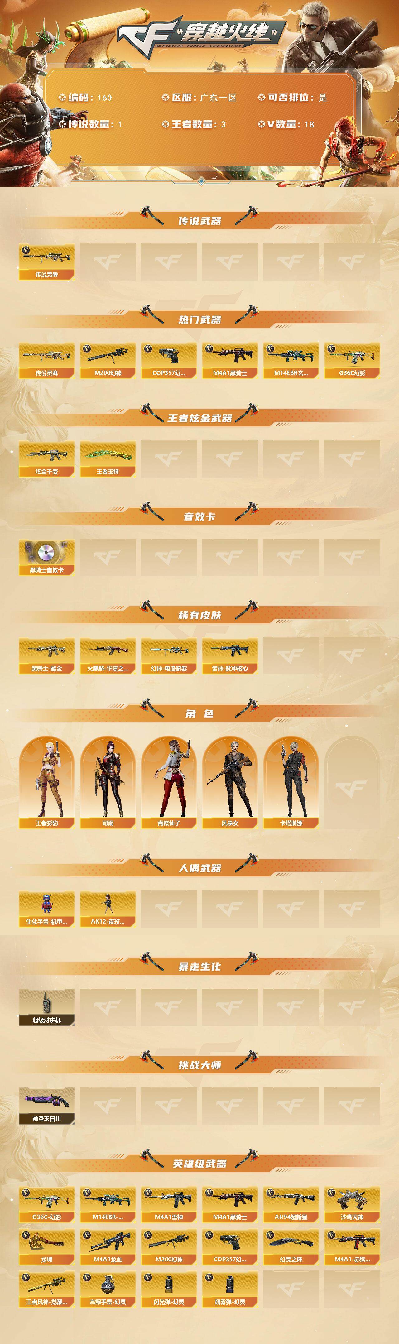 [13954408]广东一区-18V-3王者-1炫金 【传说武器】:传说灵眸 【热门武器】:传说灵眸,G36C-幻影,M14EBR-玄武,M200-幻神,M4A1-黑骑士,COP 357-幻灵 【王者炫金武器】:王者玉锋,炫金千变 【音效卡】:M4A1-黑骑士音效卡 【皮肤】:幻神-电流骇客 皮肤,雷神-脉冲核心,火麒麟-华夏之心,黑骑士耀金皮肤 【角色】:司雨,王者影豹,风暴女,卡塔琳娜,青霞仙子 【人偶武器】:生化手雷-机甲核心*2,AK12-夜玫瑰 【暴走生化】:超级对讲机 【挑战大师】:神圣爆裂者-末日III 【英雄级武器】:M4A1-雷神,M4A1-黑骑士,AN94-超新星,M4A1-龙血,M14EBR-玄武,G36C-幻影,M200-幻神,王者风神-觉醒版,沙鹰-天神,COP 357-幻灵,龙啸,幻灵之锋*2,高爆手雷-幻灵,闪光弹-幻灵,烟雾弹-幻灵*2,M4A1-赤狱骑士 【道具】:战舰背包,炫彩背包,女皇终结者-魔龙之吻,救世主-黑桃战神,绿色巨人,灵魂忍者,迷雾幽灵,夺命之镰,防化服*2,金色流光-枪王排位*2,星辰流光-枪王排位,枪王排位29赛季金色流光,防弹头盔*4,防弹衣*4,C4工具钳*4,手雷包*4 【特殊枪械】:1黑骑士