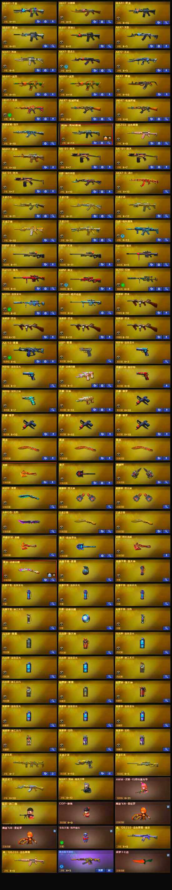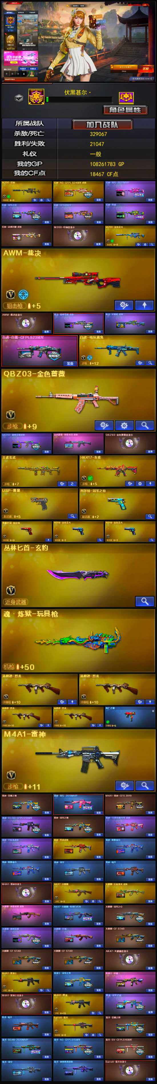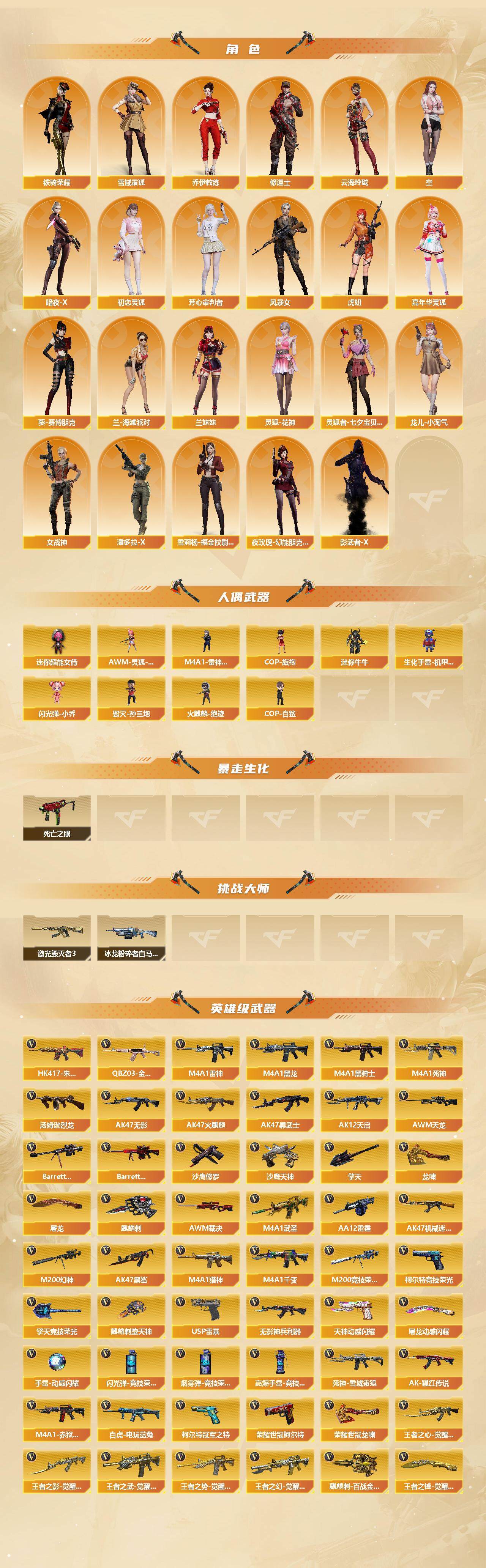 【皮肤】:幻神-冠军之幻,幻神-青鹤,幻神-宠儿-2021MVP,幻神-CFS2022,幻神-动感闪耀 皮肤,幻神-AG-CFPL S24冠军 皮肤,白虎-白鲨-CFPLS23冠军,QBZ03-巅峰荣耀皮肤,金色蔷薇-热带奇洋 皮肤,裁决-巅峰荣耀 皮肤,裁决-运输船 皮肤,雷神-暗月,雷神-能量核心*2,雷神-荣耀之魄,雷神-星空,M4A1-雷神-CFS 2019,雷神-冠军之魄,雷神-宠儿-2019MVP,雷神-R.LGD-CFPLS18冠军,雷神-烈虎皮肤,雷神-宇航兔皮肤,雷神-15周年嘉年华 皮肤,M4A1-再燃火线,火麒麟-雷神,火麒麟-冠军之心,AK47-火麒麟-传奇EVEN,火麒麟-百城,火麒麟-巅峰荣耀,火麒麟-玉面羞花 皮肤,火麒麟-典雅胡桃 皮肤,毁灭-荣耀之怒,毁灭-星空,毁灭-SV-CFPLS16冠军,毁灭-BEAN-2020MVP,毁灭-神秘黑洞皮肤,M4A1-千变-孔明皮肤,黑龙-暗月,黑龙-冠军之武,黑骑士-冠军之势,黑骑士-伏羲,无影-霓裳皮肤,无影-神兵利器 皮肤,黑武士-典韦皮肤,战神-粉色甜心皮肤*3,战神-紫绶金章皮肤,战神-流金岁月皮肤*2,AK47-B-常胜将军-刘备,天龙-能量核心,AWM-天龙-传奇70KG,AWM-天龙-传奇白鲨,极光-能量核心,修罗-能量核心*2,屠龙-荣耀之锋,屠龙-惊鸿 皮肤,龙啸-冠军之啸,龙啸-巅峰荣耀 皮肤,轻型军用手斧-再燃火线,擎天-冠军之击