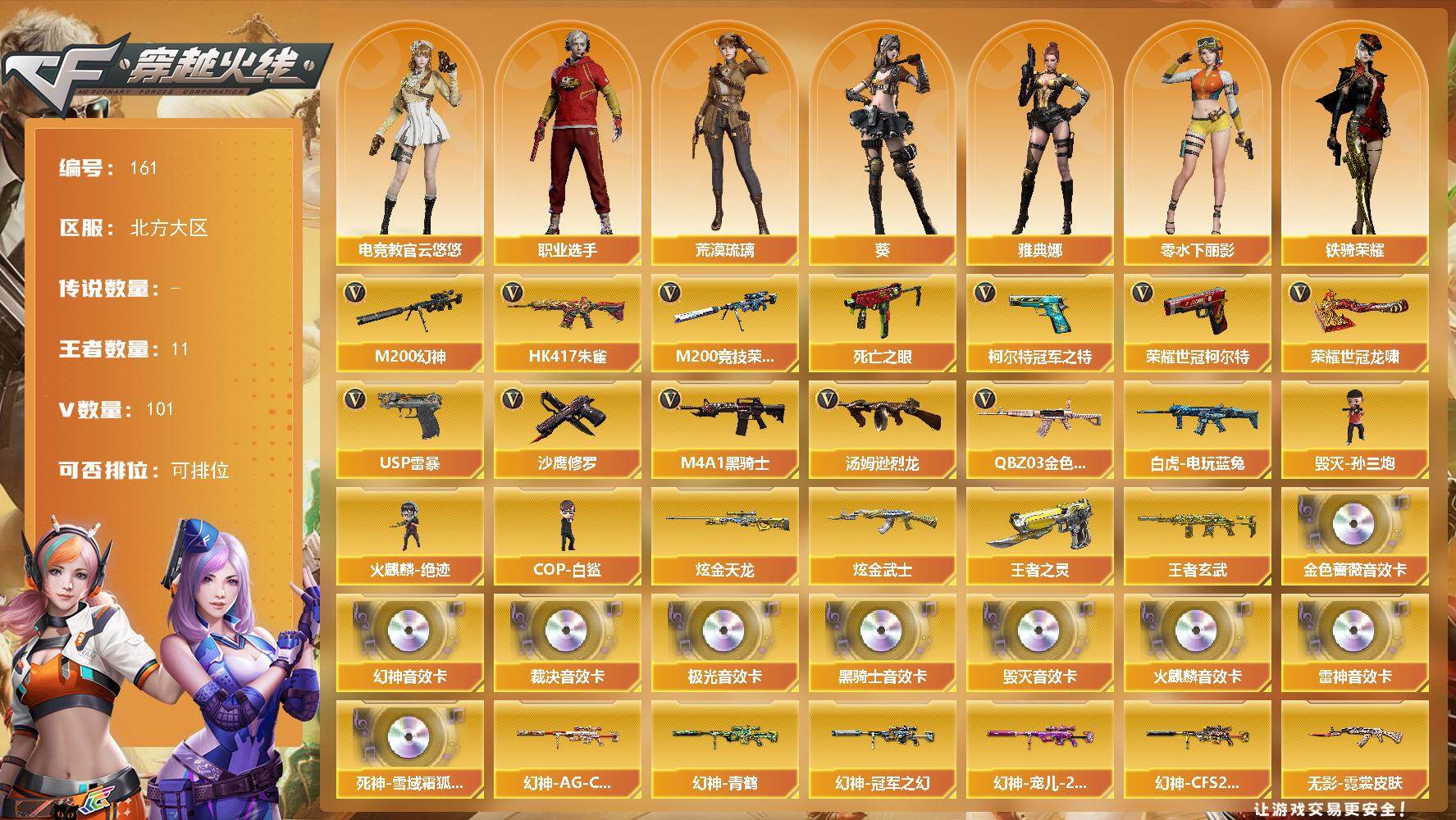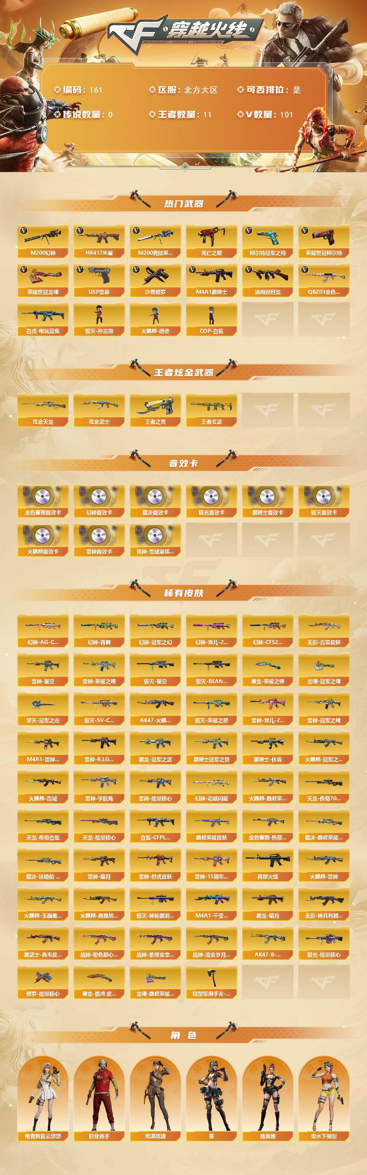 [13954742]北方大区-101V-11王者-2炫金 【热门武器】:QBZ03-金色蔷薇,HK417-朱雀,M200-幻神,M200-竞技荣光,死亡之眼,白虎-电玩蓝兔,柯尔特-冠军之特,荣耀世冠-柯尔特,M4A1-黑骑士,汤姆逊-烈龙*4,毁灭-孙三炮,火麒麟-绝迹,COP-白鲨,USP-雷暴,沙鹰-修罗*4,荣耀世冠-龙啸 【王者炫金武器】:王者玄武,王者之灵,炫金武士,炫金天龙 【音效卡】:M200-幻神音效卡,AK47-火麒麟音效卡,M4A1-雷神音效卡,M4A1-黑骑士音效卡,Barrett-毁灭音效卡,Barrett-极光音效卡,QBZ03-金色蔷薇音效卡,AWM-裁决音效卡,死神-雪域霜狐-怀旧音效卡 【皮肤】:幻神-冠军之幻,幻神-青鹤,幻神-宠儿-2021MVP,幻神-CFS2022,幻神-动感闪耀 皮肤,幻神-AG-CFPL S24冠军 皮肤,白虎-白鲨-CFPLS23冠军,QBZ03-巅峰荣耀皮肤,金色蔷薇-热带奇洋 皮肤,裁决-巅峰荣耀 皮肤,裁决-运输船 皮肤,雷神-暗月,雷神-能量核心*2,雷神-荣耀之魄,雷神-星空,M4A1-雷神-CFS 2019,雷神-冠军之魄,雷神-宠儿-2019MVP,雷神-R.LGD-CFPLS18冠军,雷神-烈虎皮肤,雷神-宇航兔皮肤,雷神-15周年嘉年华 皮肤,M4A1-再燃火线,火麒麟-雷神,火麒麟-冠军之心,AK47-火麒麟-传奇EVEN,火麒麟-百城,火麒麟-巅峰荣耀,火麒麟-玉面羞花 皮肤,火麒麟-典雅胡桃 皮肤,毁灭-荣耀之怒,毁灭-星空,毁灭-SV-CFPLS16冠军,毁灭-BEAN-2020MVP,毁灭-神秘黑洞皮肤,M4A1-千变-孔明皮肤,黑龙-暗月,黑龙-冠军之武,黑骑士-冠军之势,黑骑士-伏羲,无影-霓裳皮肤,无影-神兵利器 皮肤,黑武士-典韦皮肤,战神-粉色甜心皮肤*3,战神-紫绶金章皮肤,战神-流金岁月皮肤*2,AK47-B-常胜将军-刘备,天龙-能量核心,AWM-天龙-传奇70KG,AWM-天龙-传奇白鲨,极光-能量核心,修罗-能量核心*2,屠龙-荣耀之锋,屠龙-惊鸿 皮肤,龙啸-冠军之啸,龙啸-巅峰荣耀 皮肤,轻型军用手斧-再燃火线,擎天-冠军之击 【角色】:葵,电竞教官-云悠悠,荒漠琉璃,雪域霜狐,乔伊教练,修道士,云海玲珑,空,暗夜-X,初恋灵狐,芳心审判者,风暴女,虎妞,嘉年华灵狐,葵