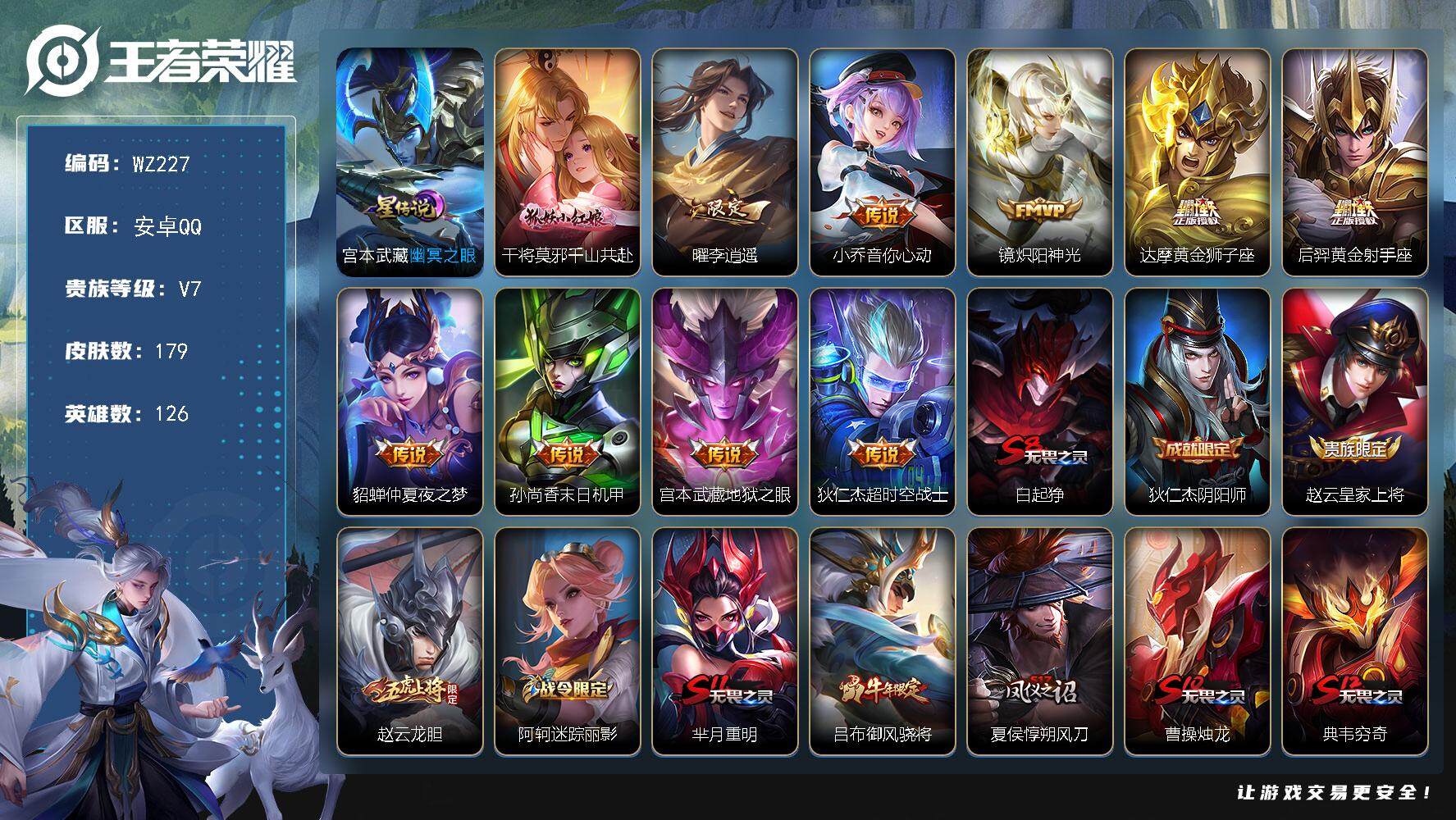 - [11498138]V9 2典藏 1无双 1珍品传说 16传说 125英雄 322皮肤 可修改实名 优质装备:鸣剑·曳影,星域神启(倪克斯贼亮),碎月剑心(李白无双),怪盗基德,黄金射手座,冠军飞将,炽阳神光,地狱火,地狱之眼,挚爱之约 传说皮:乘龙·问璇玑(孙尚香年限),乘龙·铭钟鼎(赵云年限),貂蝉曦玄引,幻光神枪 珍宝阁皮:蔷薇恋人,女武神,玩趣恶龙 限定皮:愿照·九州拓(澜年限),愿照·众生和(妲己年限),鸣野蒿,前尘镜,绯月行,神威(电光马子),遇见飞天,高山流水,五谷丰年,青龙志(铠年限),游园惊梦,梁祝,天狼狩猎者,烈魂,天狼溯光者,李小龙,玄武志(苏烈年限),辉光之辰,圣诞老人,默契交锋-花木兰 史诗皮:鸭鸭历险记-刘禅,器灵·浮梦炉,化蝶舞,星界战将,龙之律动,石田雨龙,百相守梦-周瑜,茶境仙,蔬乡物语(鲁班七号),琥珀纪元伽罗,百相守梦-百里守约,紫霞仙子,电玩小子(小书包),黄金分割率,特工魅影,千年之狐,百相守梦(刘备),匿光侦查者,百解令(蒙犽),高渐离燃音魔法,偶像歌手,龙骑士(小龙虾),暗夜猫娘,魅语,无限星赏官,冰冠公主,末日机甲-吕布,猫狗日记-孙策,猫狗日记-大乔,乱世虎臣,节奏热浪,修罗,女仆咖啡,摇滚巨星,水果甜心,绅士熊喵,天才门将,星夜王子,心灵骇客,功夫厨神,德古拉伯爵,暗隐猎兽者,幽灵船长,鬼剑武藏,心灵战警,舞动绿茵,地狱岩魂,纤云弄巧,拒霜思,缤纷独角兽,乘风破浪,逐浪之夏,月团寄思,水晶猎龙者,曙光守护者,金属风暴,圣诞狂欢,圣诞恋歌,鹰眼统帅,王者之锤,暗夜贵公子,魅力维加斯,黎明之约,无心,未来纪元-赵云