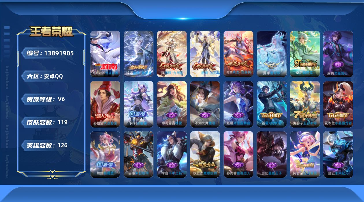 [13891905]账号内一颗荣耀水晶 实名: 可修改 性别: 男号 贵族等级: V6 英雄数: 126 皮肤数: 119 珍品传说: 怪盗基德,器灵·落星盏 传说皮: 霜月吟,乘龙·淬吴钩,神树通天 限定皮: 大圣娶亲,五谷丰年,鸣野蒿,愿照·山河定,愿照·九州拓