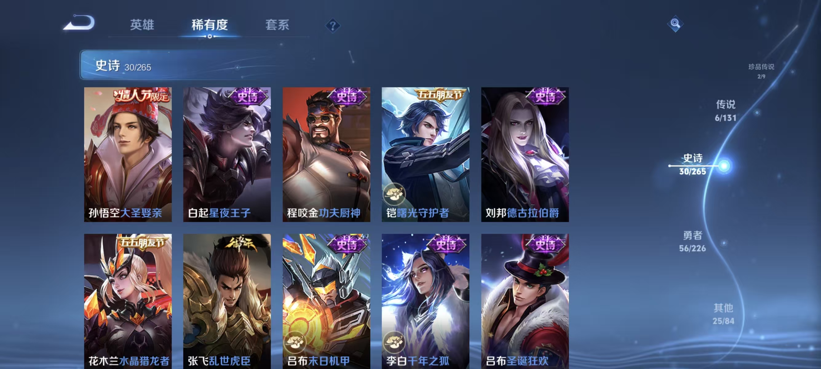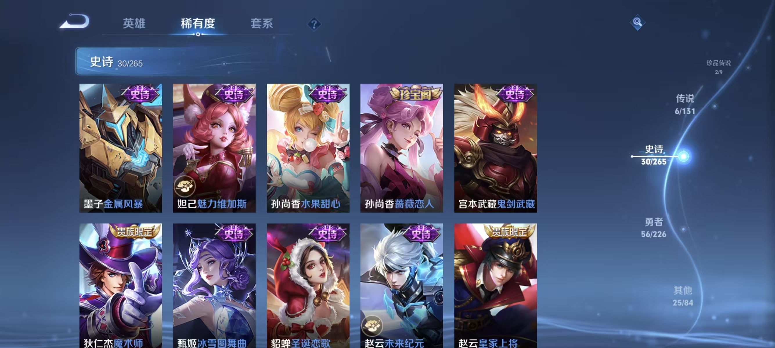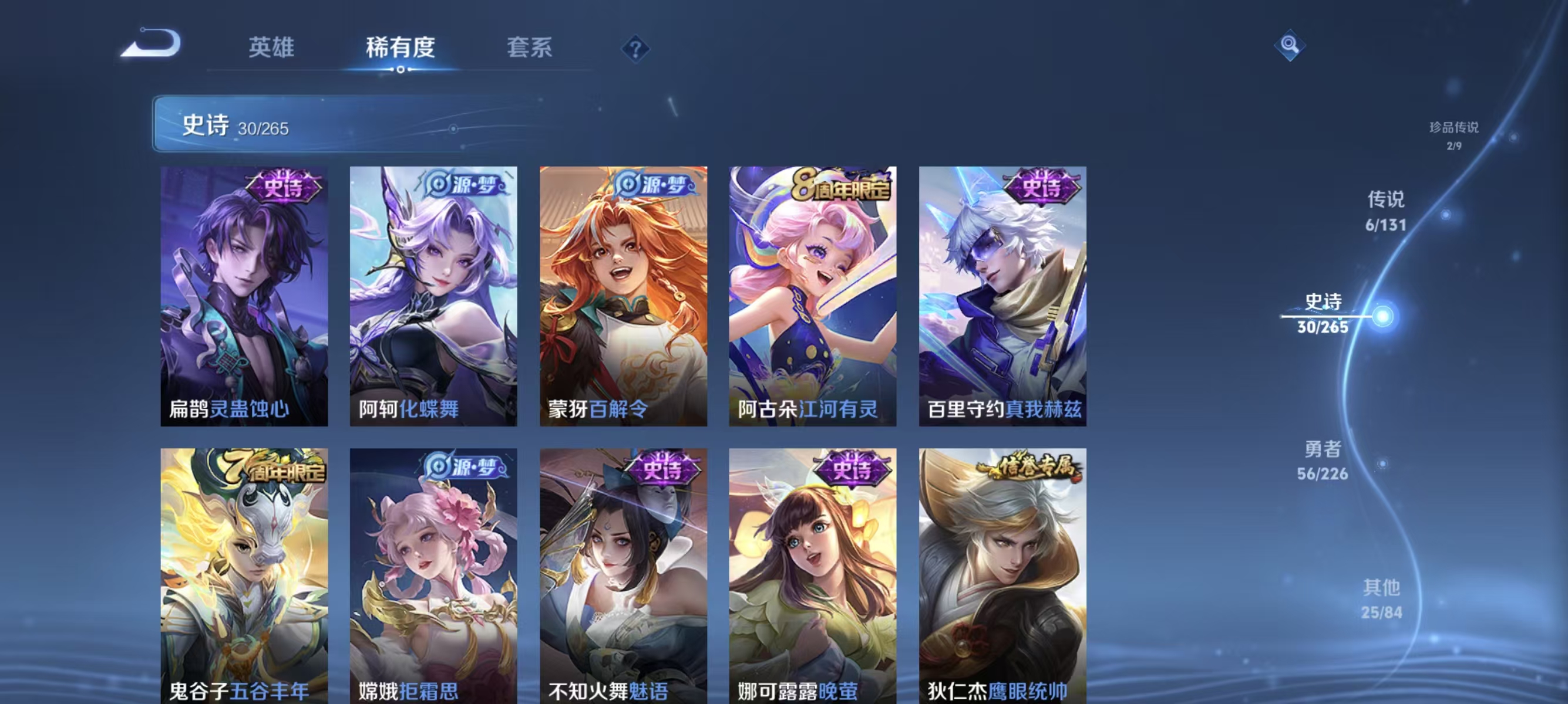 - PX_2104976-??信/永恒钻石/135皮肤/116英雄/0典藏/0珍品无双/0无双/0珍品传说/7传说/39史诗/6稀有英雄 【7 传说皮肤】前尘镜 娜可露露,逐花归海 澜,诗剑行 李白,怒海麟威 吕布,久胜战神 干将莫邪,幻光神枪 云缨,愿照·岁时盈 虞姬, 【39 史诗皮肤】末日机甲 吕布,紫霞仙子 露娜,百解令 蒙犽,雪夜绮愿 周瑜,苍穹之光 项羽,五谷丰年 鬼谷子,星夜王子 白起,