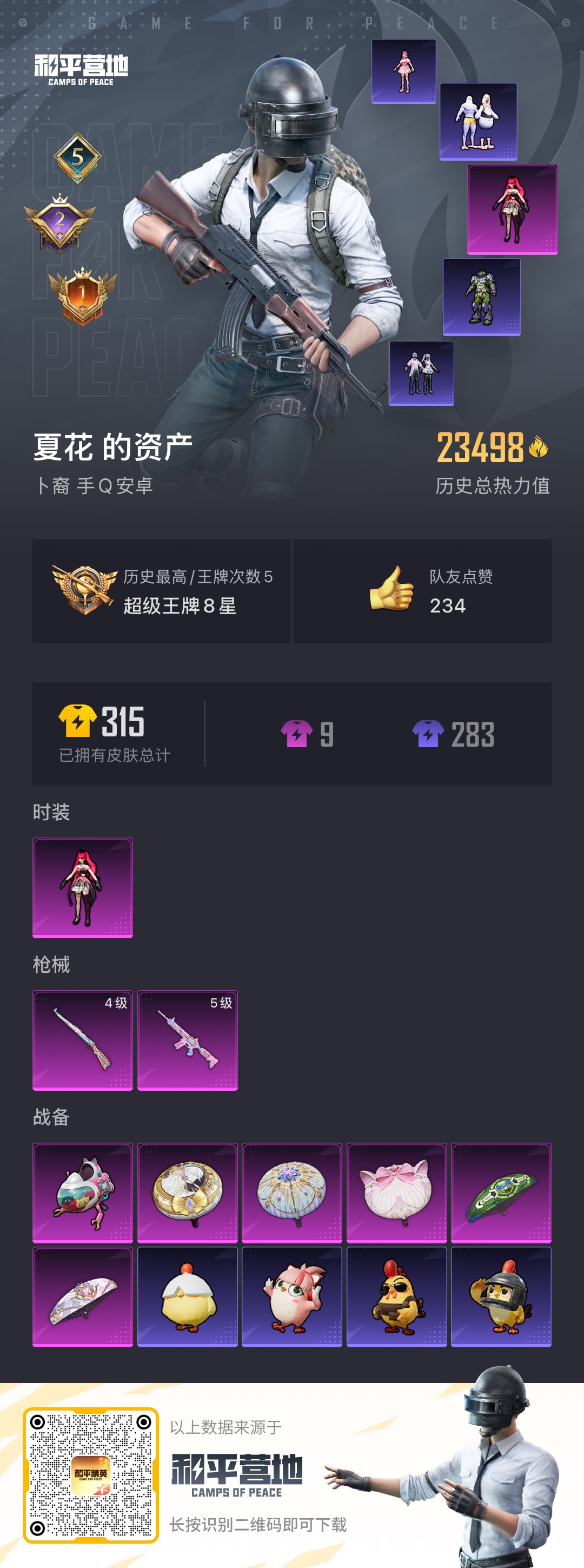 - PX_2106523- 安卓手Q-13王牌印记-8粉装-12特效枪-3载具-88448热力值-183套装-259枪皮-1卓越印记-0传奇印记 【8粉装】,梦幻火箭,智耀战神,荧海星豚,飒粉甜心,蔷薇星,守护天翼,炙焰红王,未来歌姬 【12特效枪】AKM-梦之光华-7级 SCAR-L-纯梦嫁纱-2级 SCAR-L-时空协奏-6级 M416-至情至圣-8级 GROZA-镜光银凌-5级 AUG-暖羊咩咩