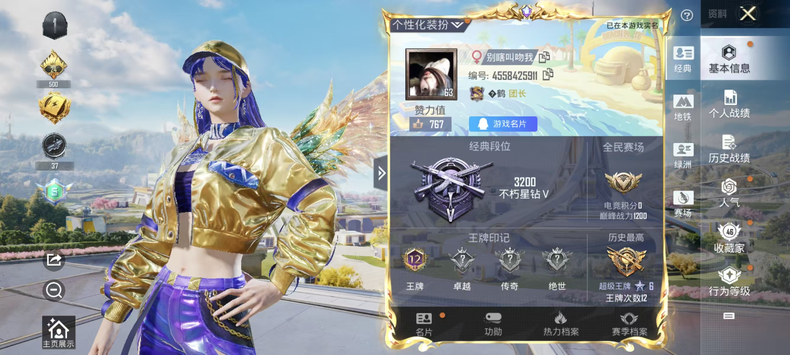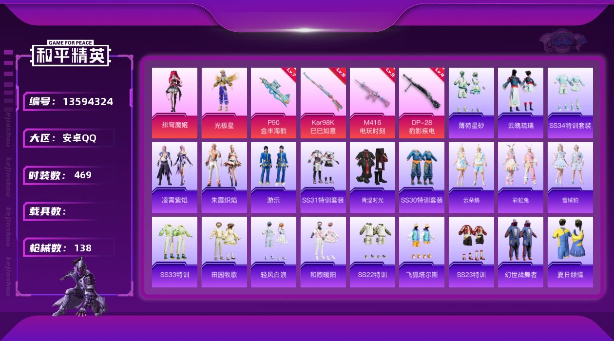 [13594324]实名: 可修改 时装数: 469 枪械数: 138 战备数: 97 热门装扮: 光极星,绯穹魔姬 稀有枪皮: M416电玩时刻,P90-金丰海韵,Kar98K-巳巳如意,DP-28-豹影疾电