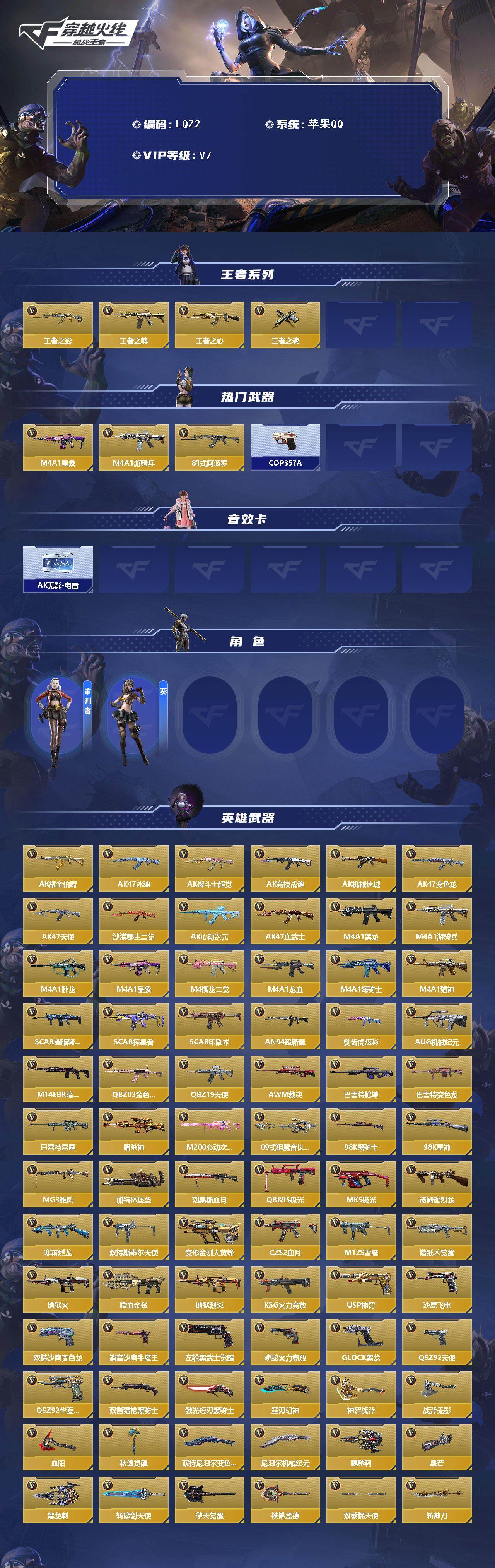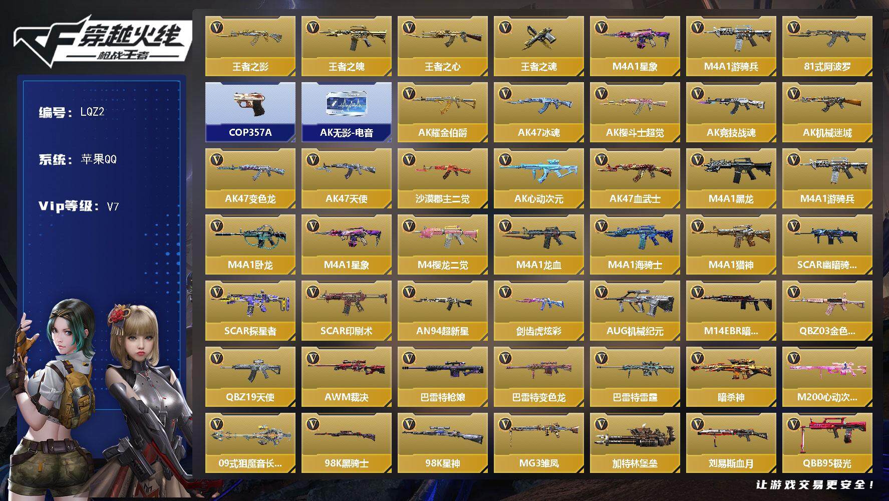 [13963093]暑期末清货/特价急出/永久包赔/商品详情看图苹果 有二次【贵族7级 169V!7王者星象m4 超值特惠号】 【王者系列】 王者之影 王者之魄 王者之心 王者之魂 【热门武器】 M4A1-星象 M4A1-游骑兵 81式-阿波罗 COP 357-A COP 357-A 【v武器】 09式狙-魔音长歌 98K-星神 98K-黑骑士 AK47-沙漠郡主-二觉 AK47-心动次元 AK47-冰魂 AK47-耀金伯爵 AN94-超新星 AK47-樱斗士-超觉 AK47-变色龙 AK47-血武士 AK47-机械迷城 AK47-竞技战魂 AUG-机械纪元 AK47-天使 AWM-裁决 暗杀神 巴雷特-变色龙 巴雷特-雷霆 巴雷特-枪娘 CZS2-血月 地狱火 地狱火 地狱烈炎 改装GLOCK-黑龙 黑龙刺 寒霜烈龙 加特林-堡垒 加特林-堡垒 激光短刃-黑骑士 剑齿虎-炫彩 KSG-火力竞放 刘易斯-血月 M200-心动次元 M14EBR-暗夜 M4A1-卧龙 M4A1-樱龙·二觉 墨刃-幻神 M4A1-猎神 蟒蛇-火力竞放 M4A1-星象 M4A1-黑龙 M4A1-游骑兵 M4A1-海骑士 M4A1-龙血 MK5-极光 M12S-雷霆 MG3-雏凤 尼泊尔-机械纪元 PP19野牛-造纸术觉醒 麒麟刺 QBZ03-金色蔷薇 擎天觉醒 秋逸觉醒 QSZ92-华夏传说 QBB95-极光 QCW05-变形金刚·大黄蜂 QCW05-变形金刚·大黄蜂 QBZ19-天使 QSZ92-天使 神罚战斧 SCAR-幽暗骑士 沙鹰-飞电 双持尼泊尔-变色龙 双截棍-天使 SCAR-探星者 SCAR-印刷术 SCAR-印刷术 嗜血金鲨 双持斯泰尔-天使 双管猎枪-黑骑士 双持沙鹰-变色龙 铁锹-孟德 汤姆逊-烈龙 USP-神罚 星芒 血阳 消音沙鹰-牛魔王 斩魔剑-天使 左轮-黑武士觉醒 战斧-无影 斩神刀 【其他武器】 寒霜烈龙 玫瑰精灵 【角色】 葵 审判者 【万化皮肤】 【音效卡】 【C4皮肤+拆弹动画】 ,AK47-无影-电音